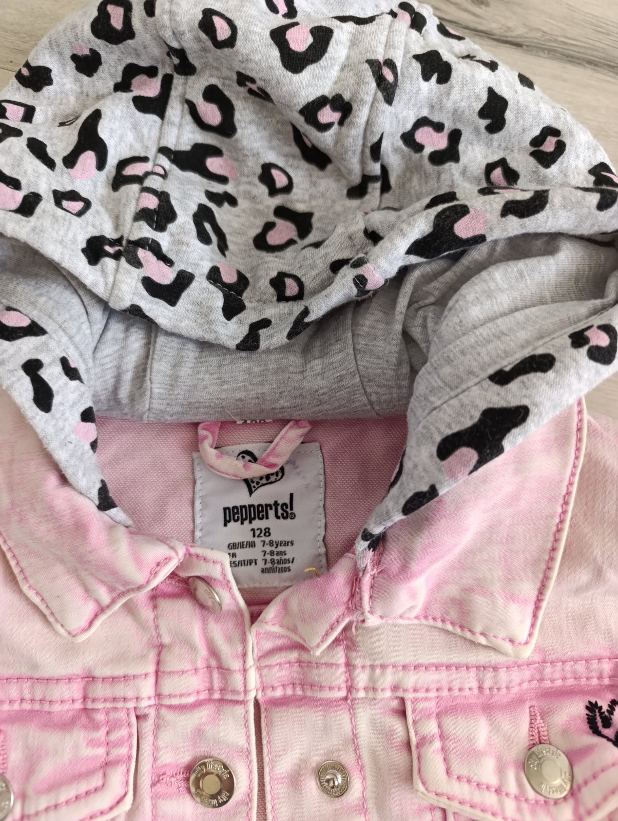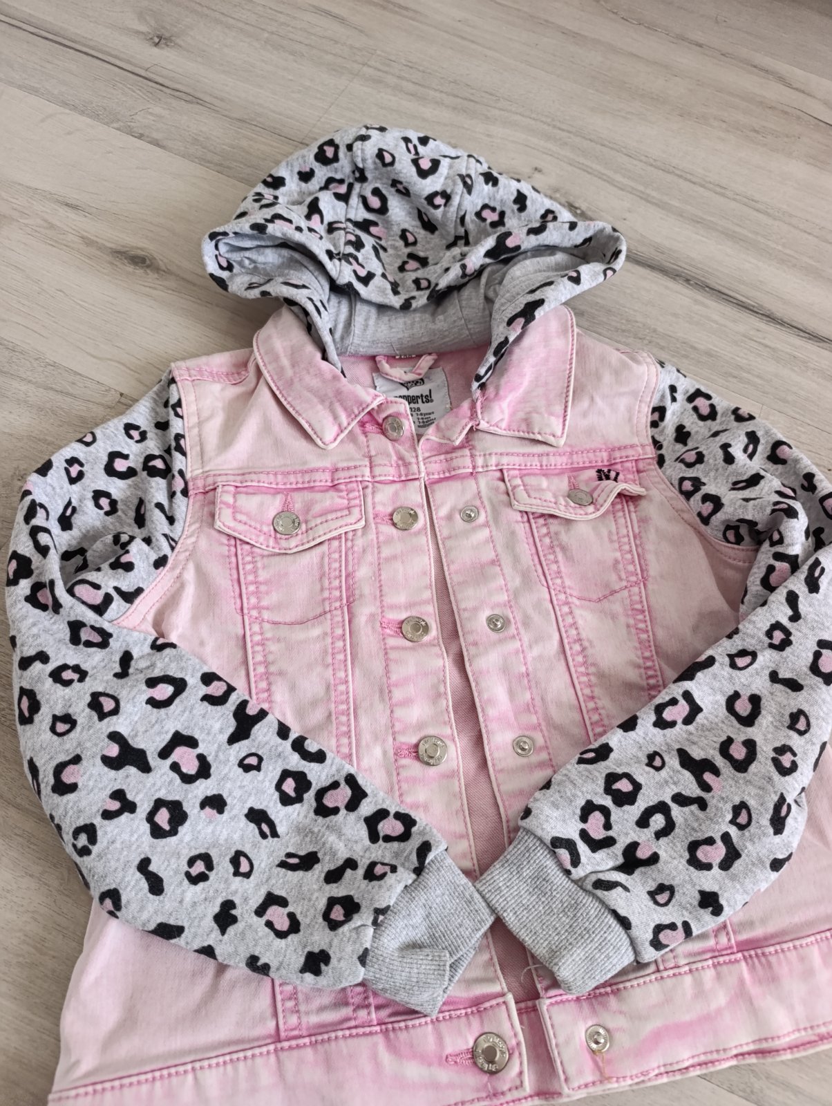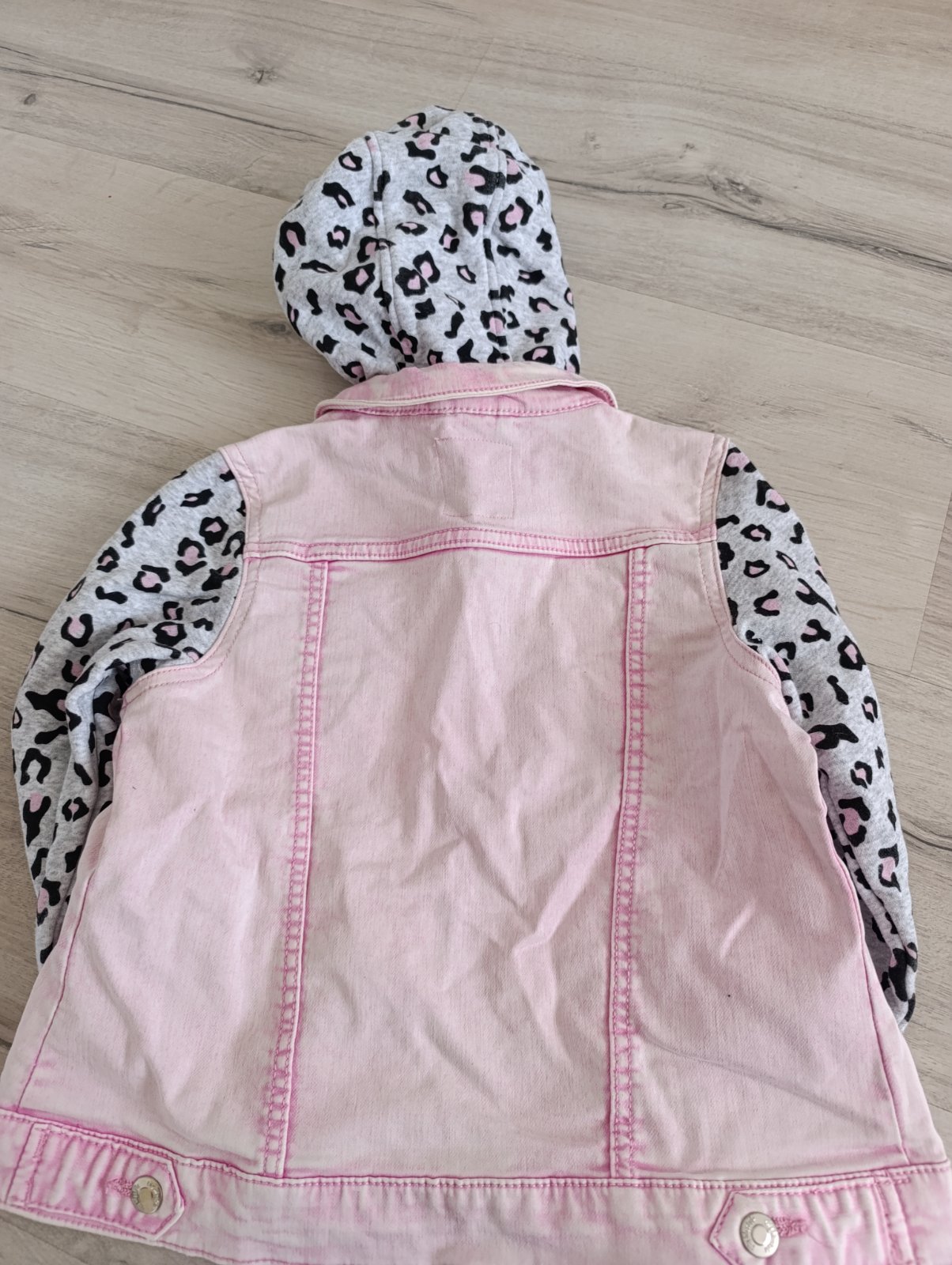 Pekná kombinovaná bunda, rukávy a kapucňa sú látkové s leopardím vzorom. Praktické zapínanie na cvoky. Párkrát nosená v top stave. Pri výmene 8€