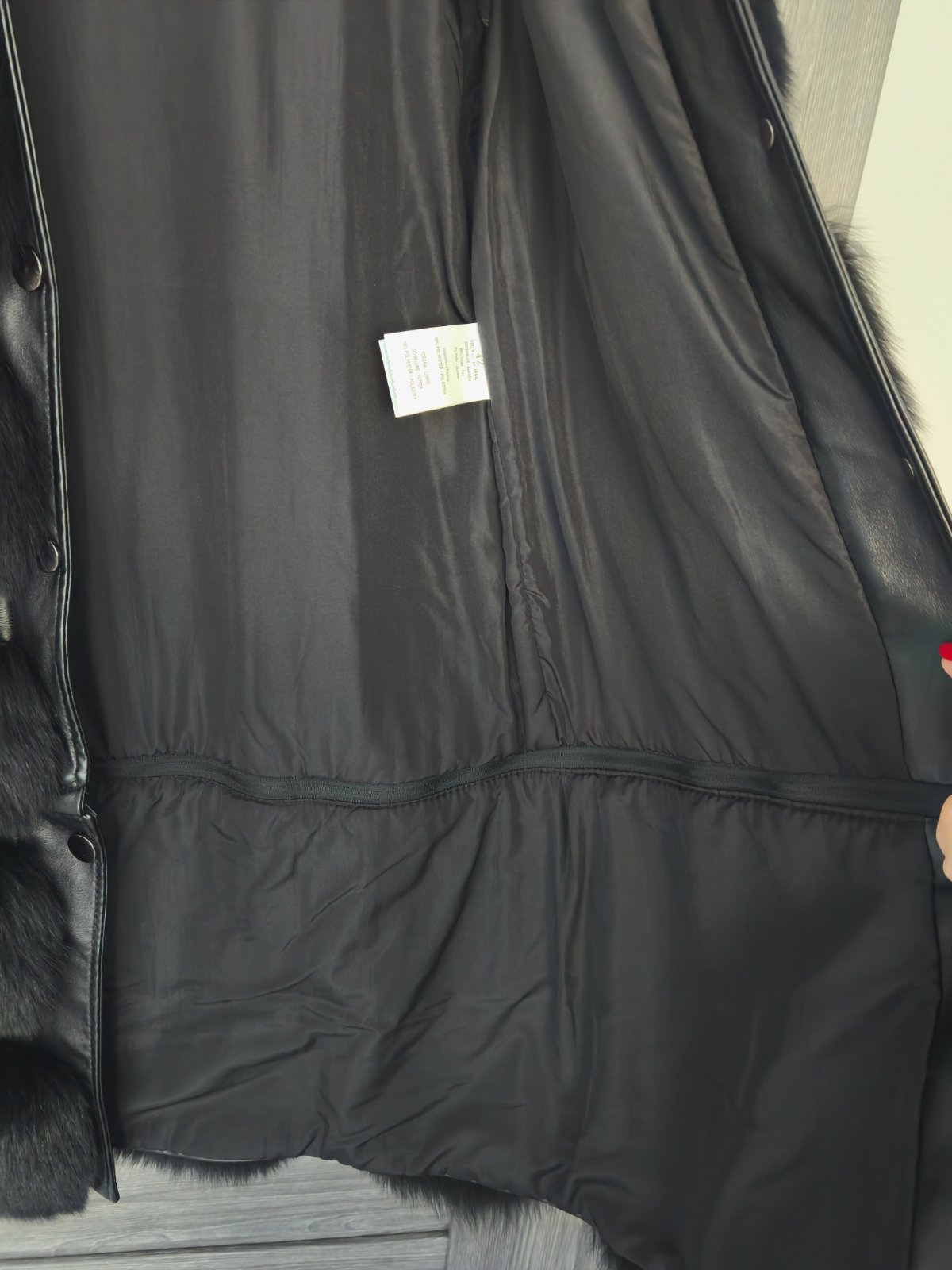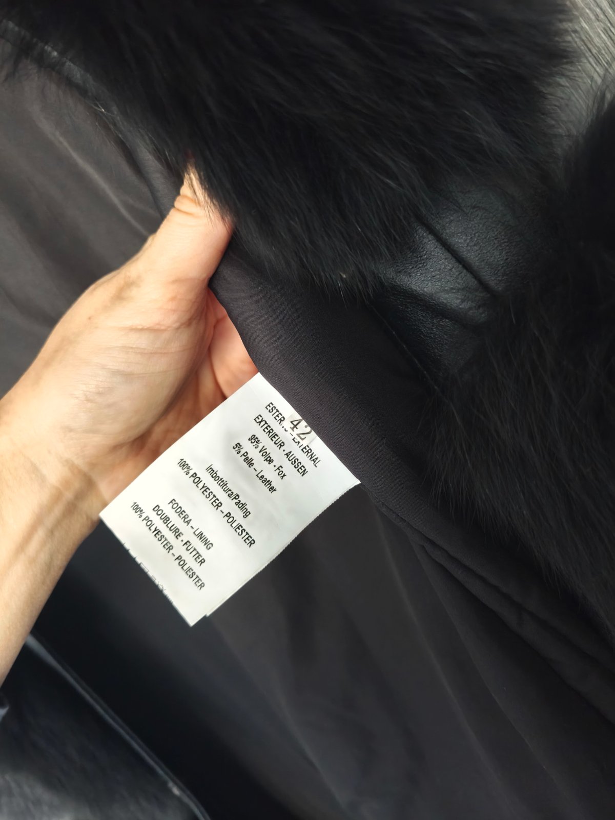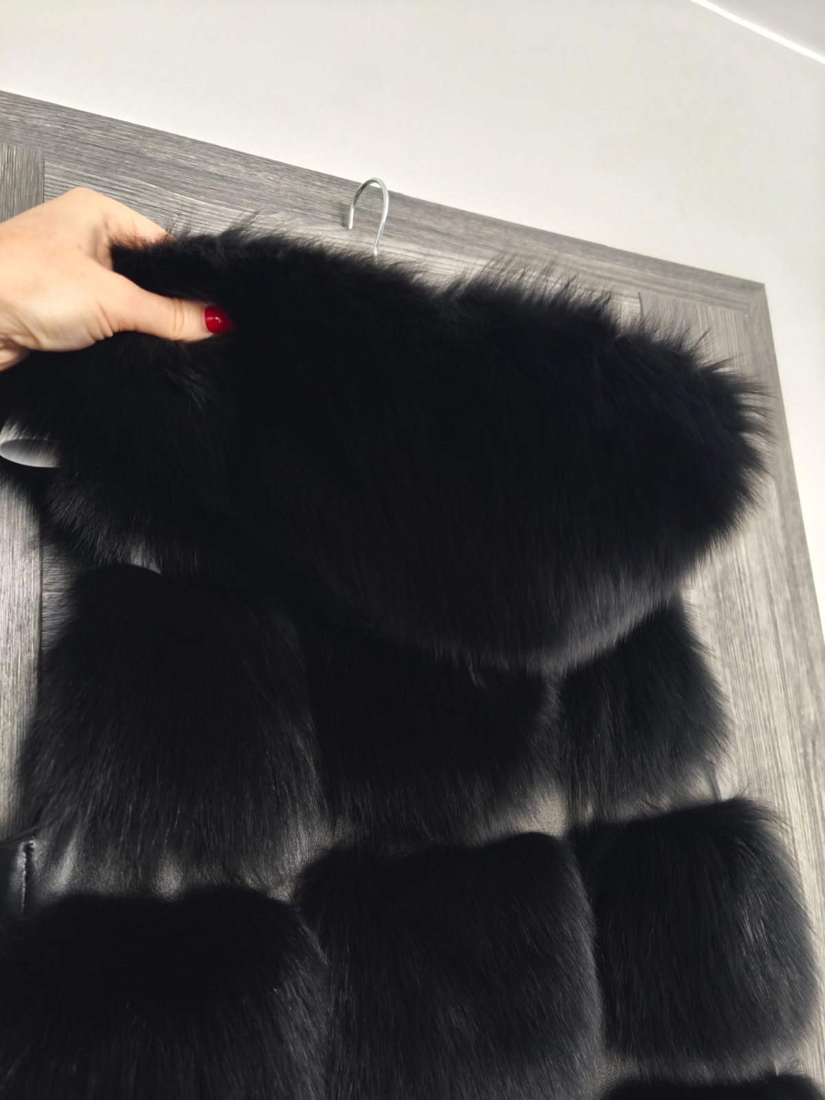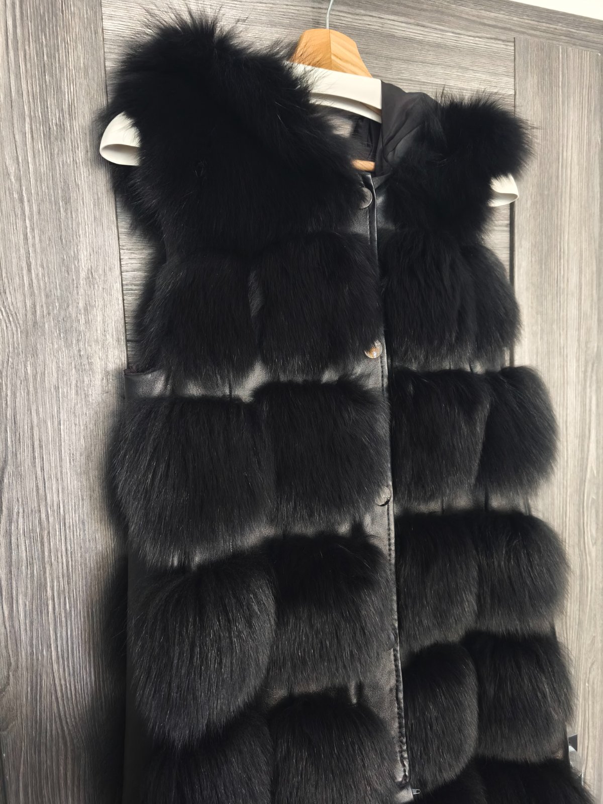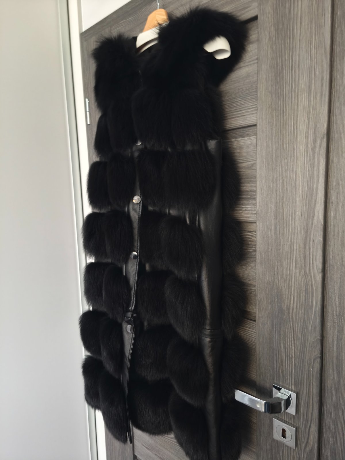 Dokonala dlha bohata vesta z lisky v kombinacii s pravou kozou zn. Max Leather, nadherna leskla kvalitna kozusina. Da sa skratit aj na kratsiu verziu. Velkost talianska 42 no krasne sedi od S po M. Oblecena bola len 2x na prilezitost inak len skladovana uplne v top stave ako nova. Povodna cena bola 900€.