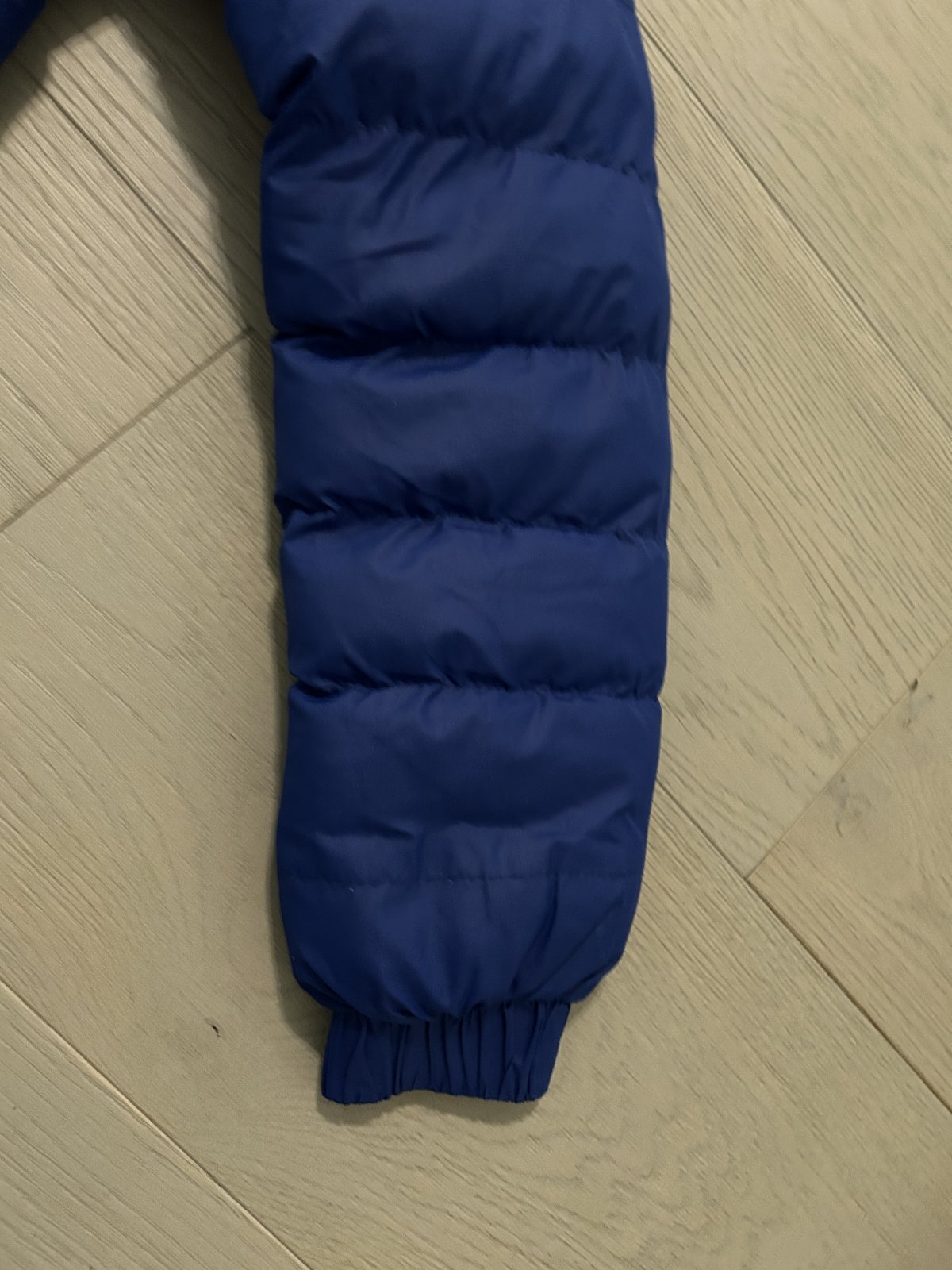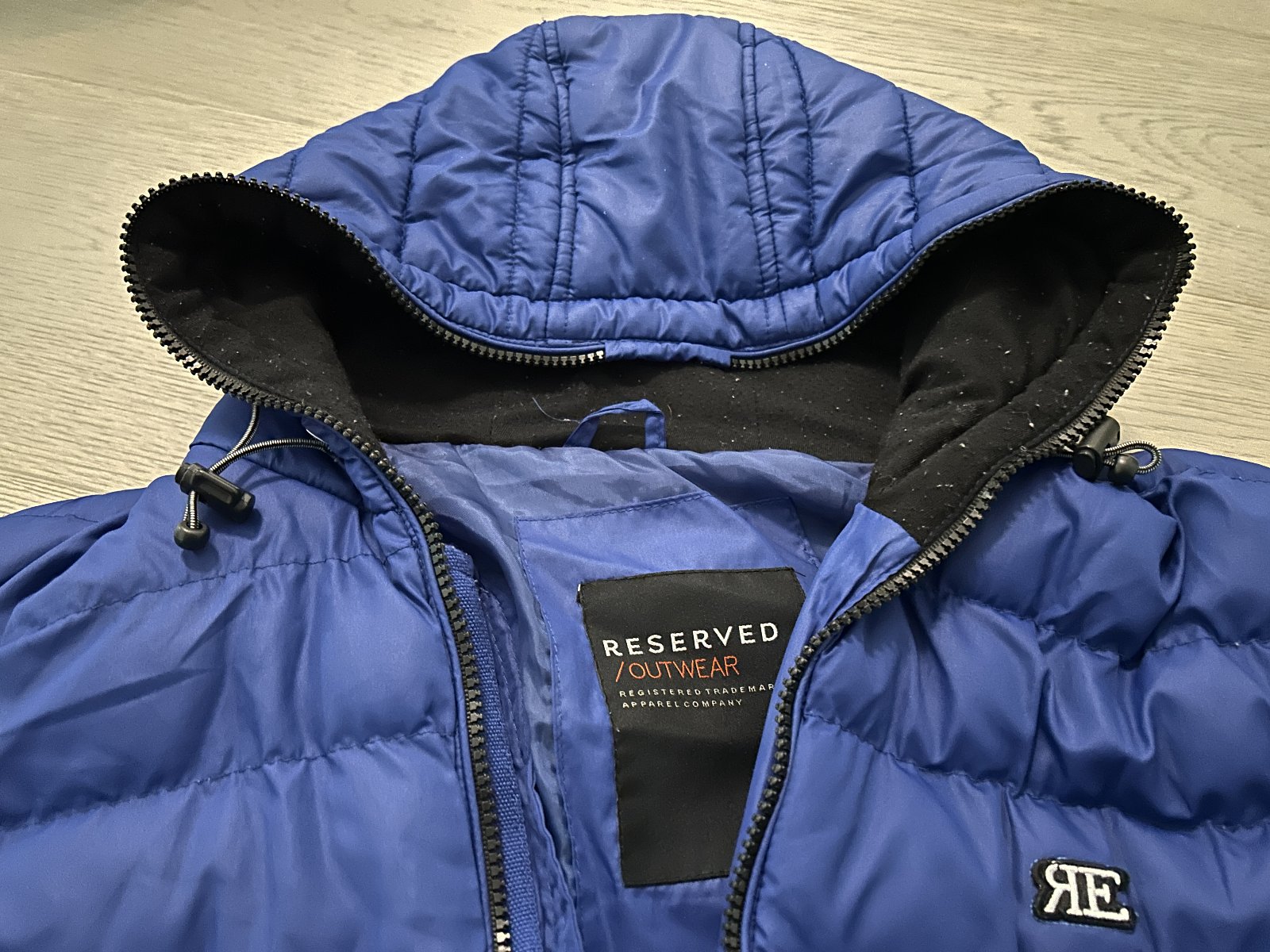 modrej farby , nosená synom, ale vo veľmi dobrom stave. Uvedená velkosť M, čo aj sedí. Dĺžka 66cm, šírka 58 cm cez hrudník, v páse 44 cm- stiahnuté gumov, natiahne sa na 54 cm, rukáv od ramena 68 cm. Kapuca nie je odopínateľná, zips sa dá vytiahnúť až cez kapucu. Vpredu dve vrecká na zips