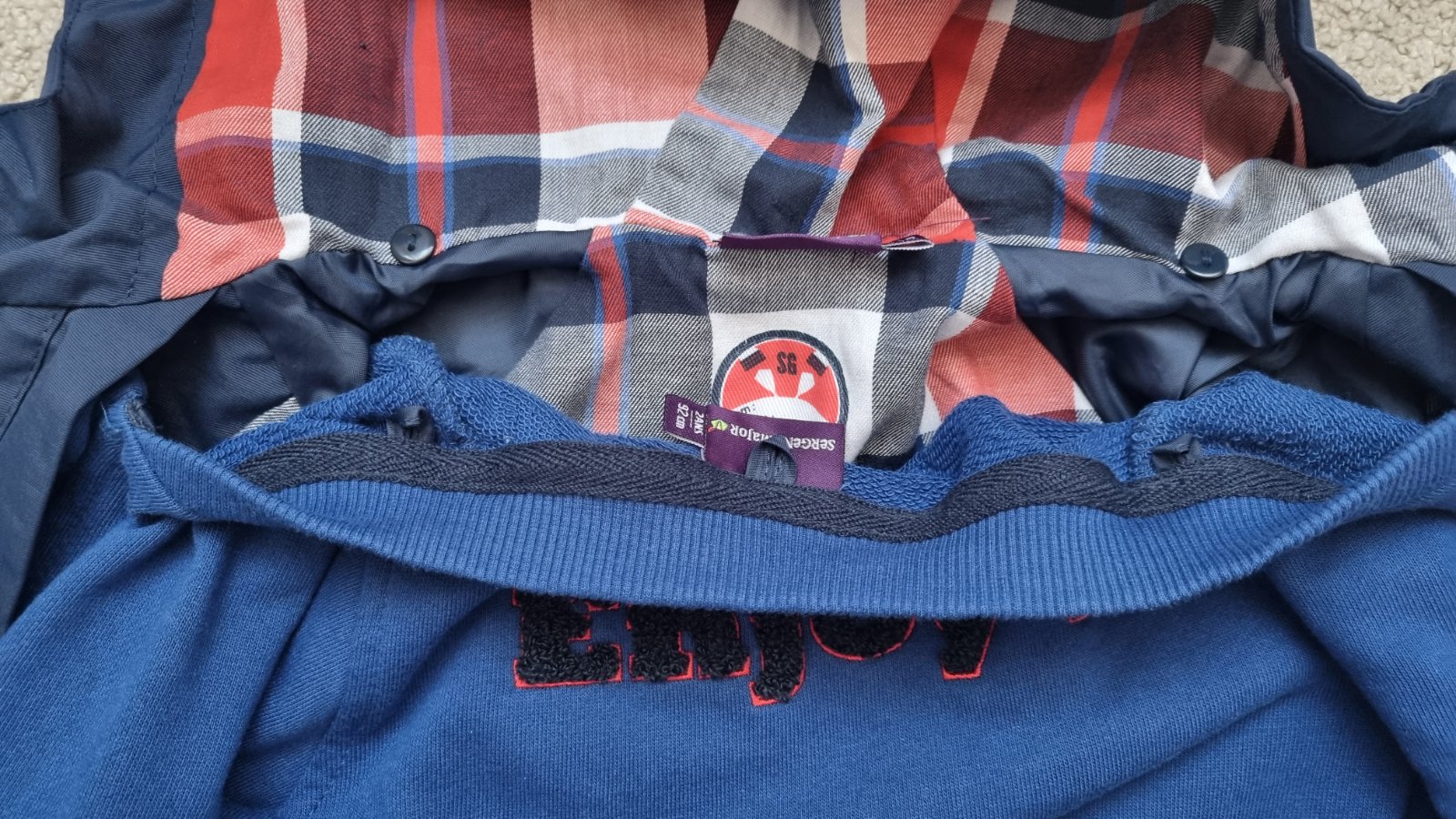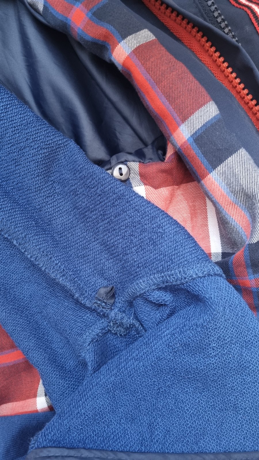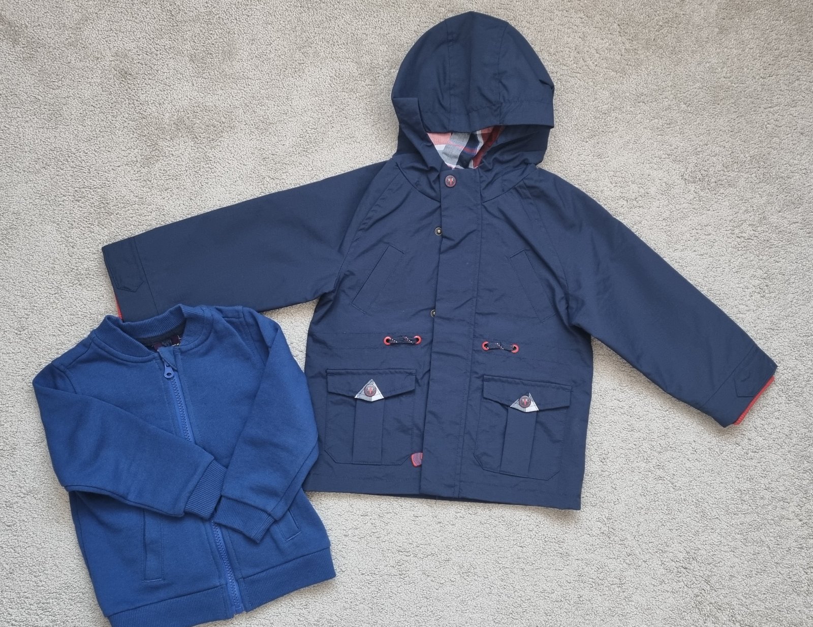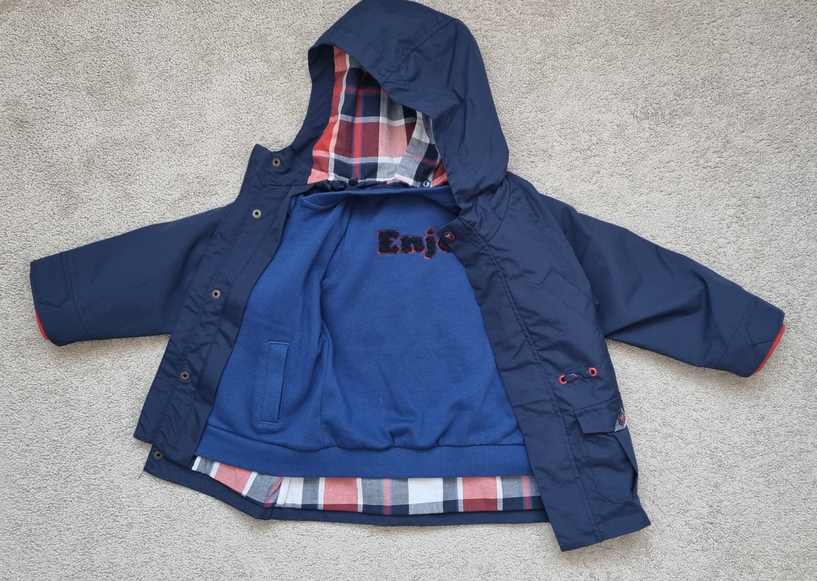 Veľmi praktická, vo vnútri má mikinu, ktorá sa dá vyberať a nosiť zvlášť. Prípadne vložiť a pevne pripnúť na vyšité gombíky a zips, keď je chladnejšie. Bunda má vrecká a lem na rukávoch.