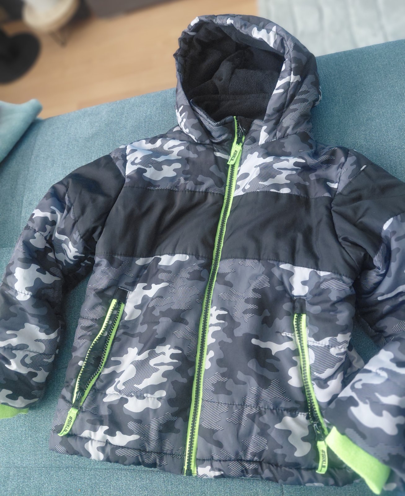 Krásna teplá zimná bunda s lyžiarskym pásom a reflexnými prvkami. Farba je kriklavozelená. Bunda má malú dierku na chrbte (viď foto) a lemy rukávov mi neopralo úplne, ale to vidno len zblízka. Inak...