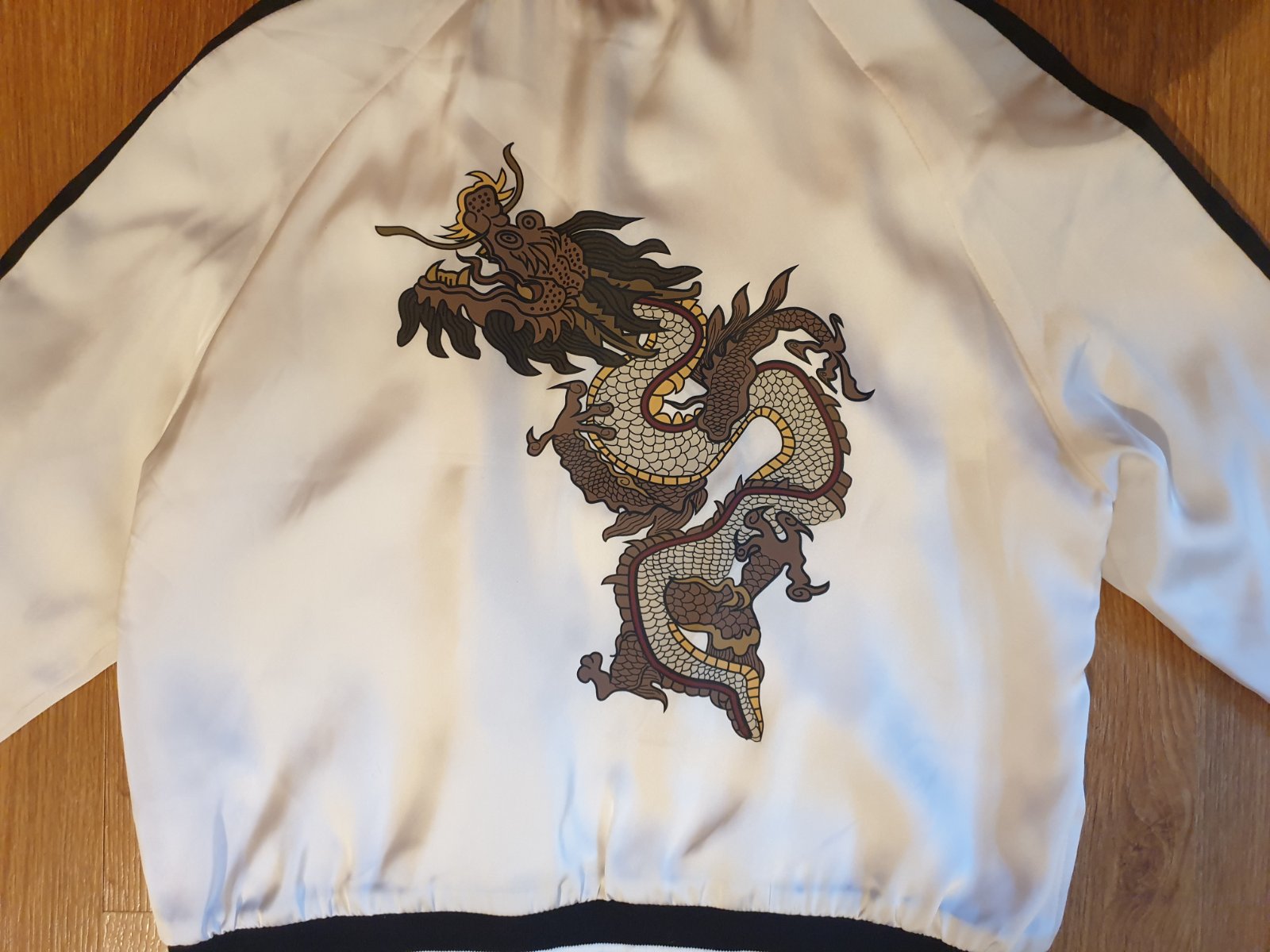 Krásna bunda 1x oblečená ako nová. Na zadnej strane je veľký drak.