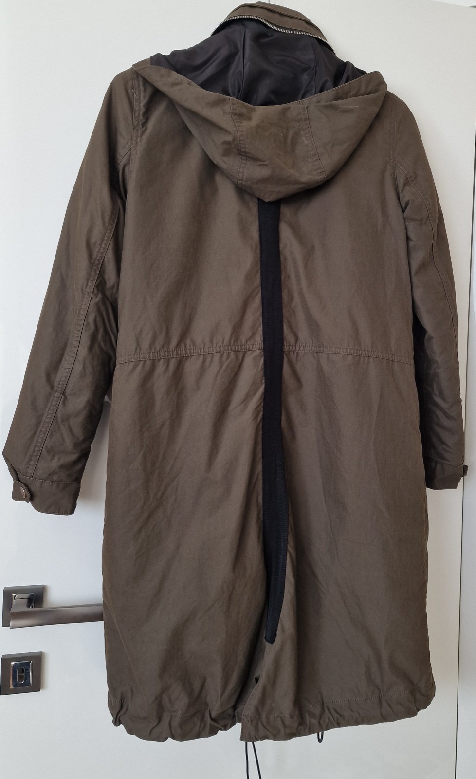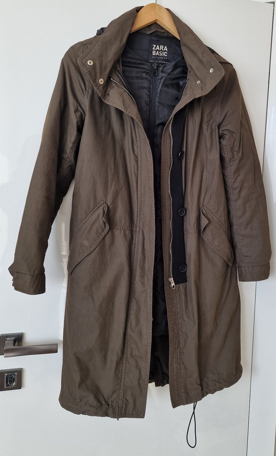 Predám multifunkčnú Zara parku do každého počasia, veľ. XS. Dá sa použiť ako samostatná parka/vetrovka, dĺžka 95 cm, rukáv 73 cm, s kapucňou, dolný lem možno utiahnuť gumičkami, vnútri má odopínateľnú vnútornú zateplenú bundičku, dĺžka 78 cm. Má 2 bočné vrecká, patenty na rukávoch. Olivovo-zelenej farby. Cena 12,50 € plus poštovné.