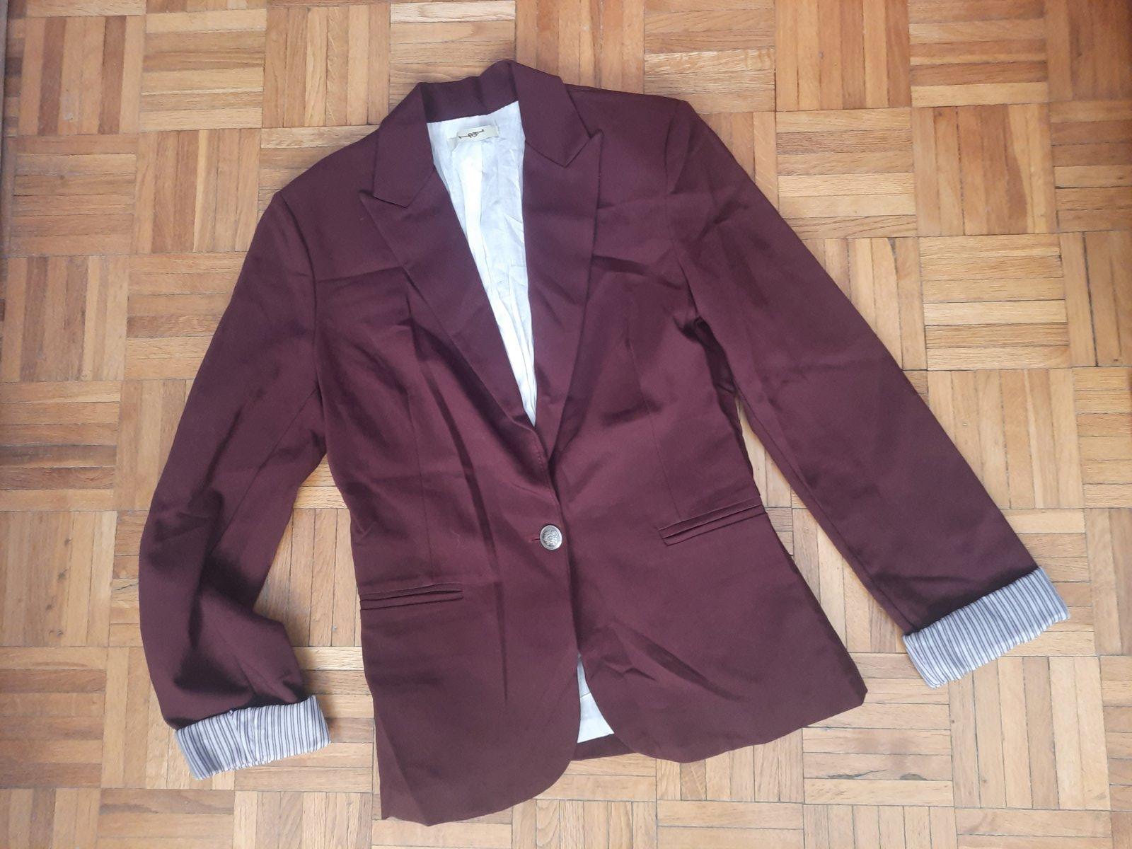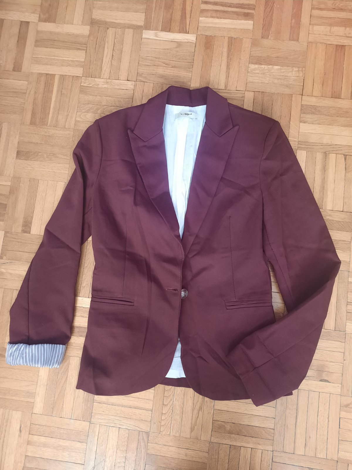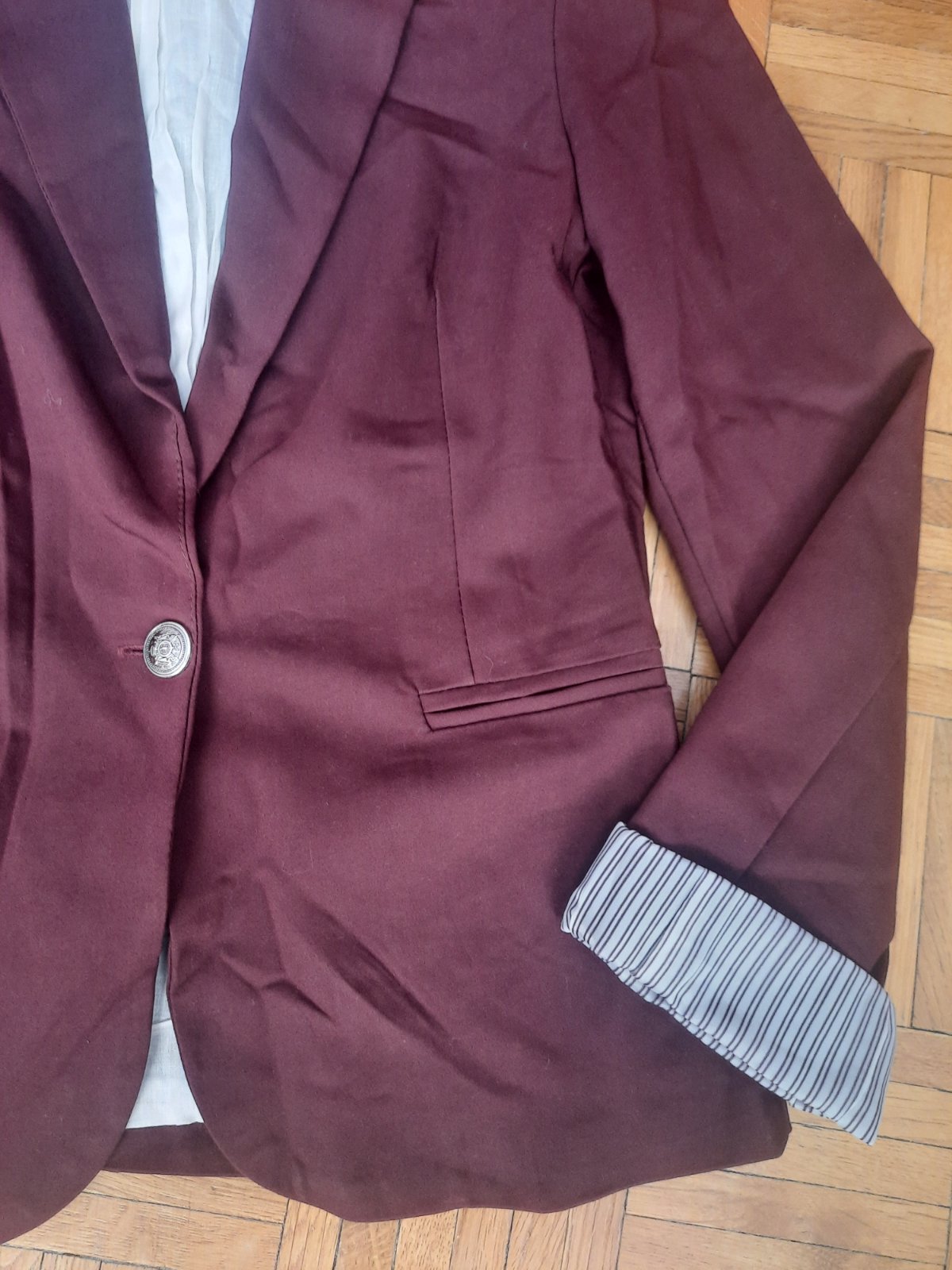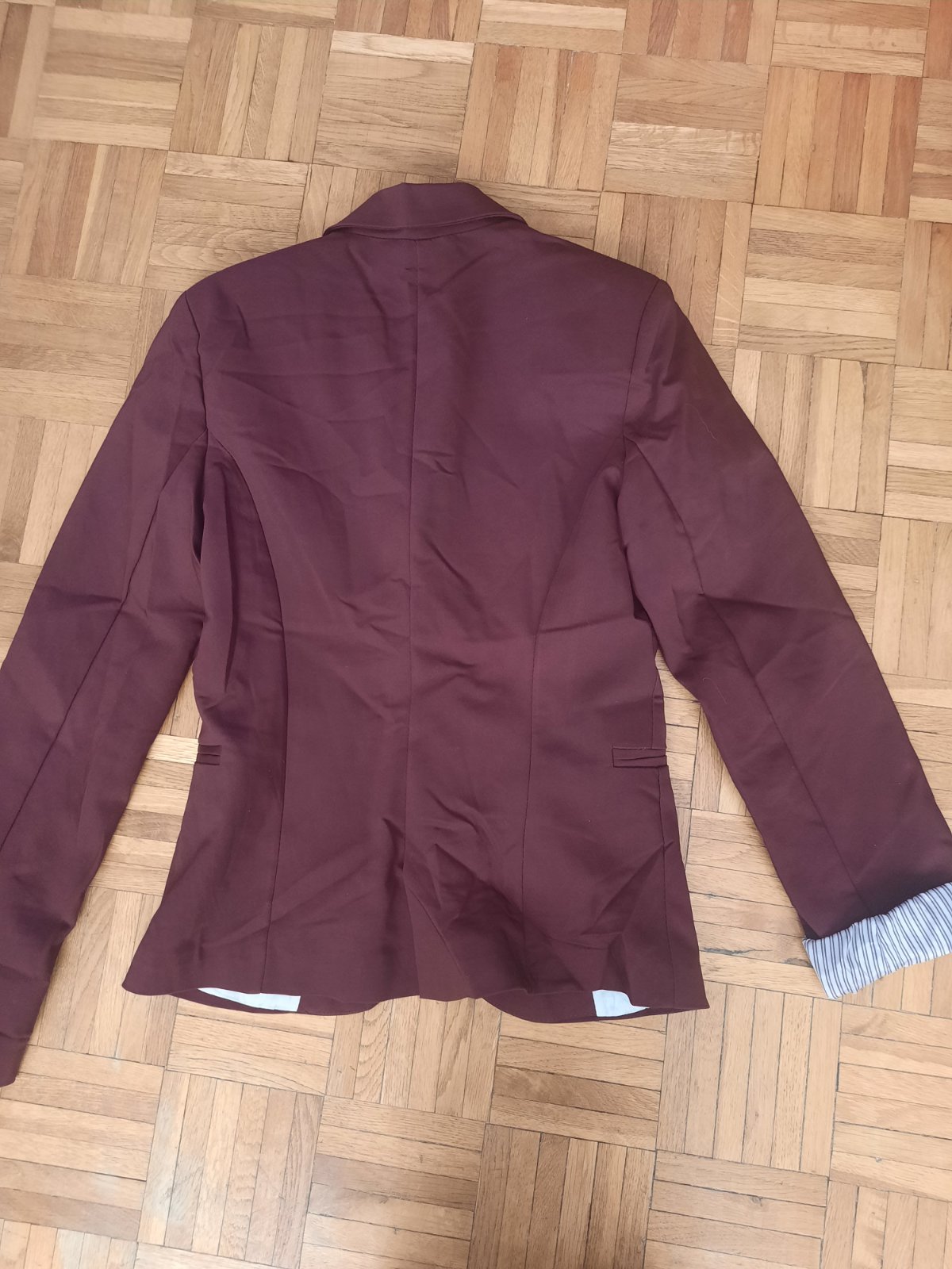 Krásne bordové sako, je aj podšité tenkou látkou. Je v top stave-bolo oblečené max.30 minút. Zapína sa na 1 gombík. Rukáv sa dá vyhrnúť-je tam pásikavá podšívka. Veľkosť píše M, ale ja odporúčam na S. Vhodné na celý rok- aj v lete na chladnejší večer.