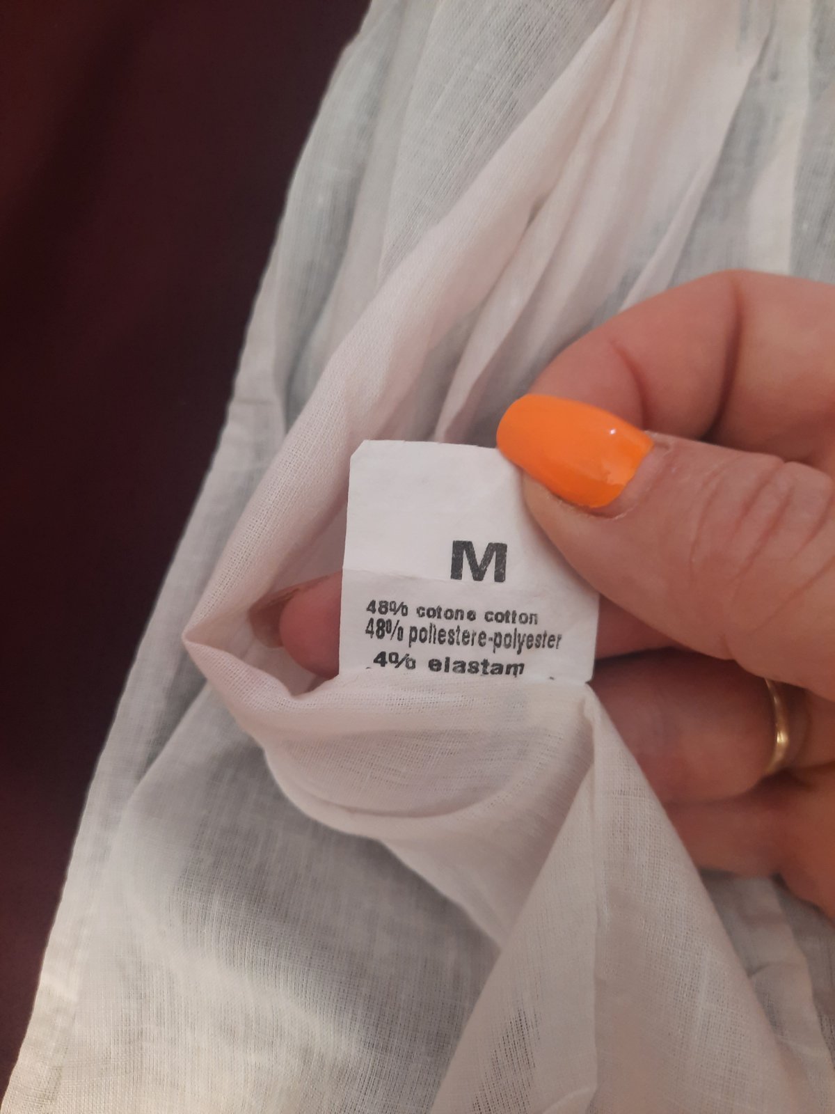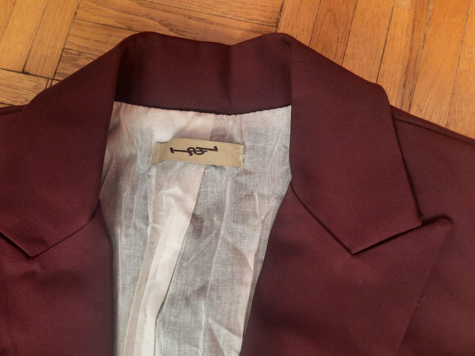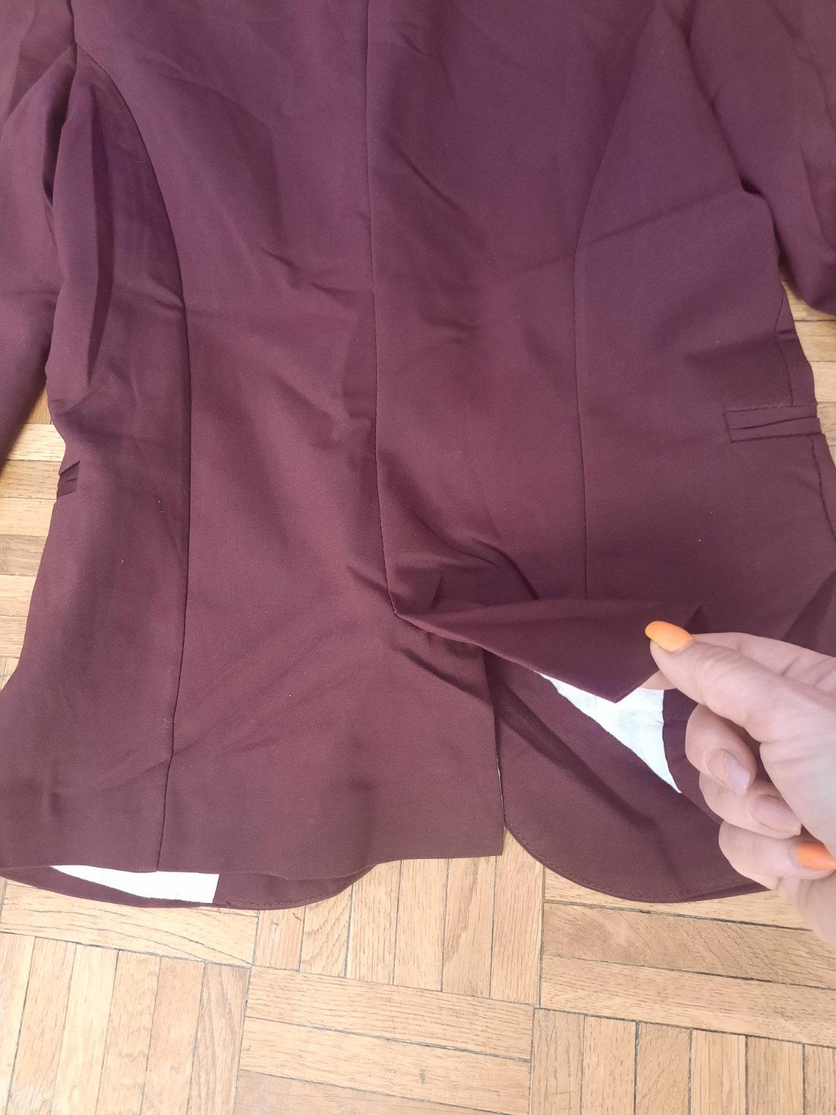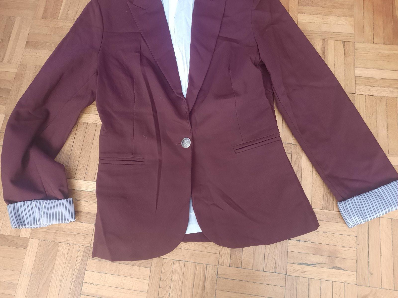 Krásne bordové sako, je aj podšité tenkou látkou. Je v top stave-bolo oblečené max.30 minút. Zapína sa na 1 gombík. Rukáv sa dá vyhrnúť-je tam pásikavá podšívka. Veľkosť píše M, ale ja odporúčam na S. Vhodné na celý rok- aj v lete na chladnejší večer.