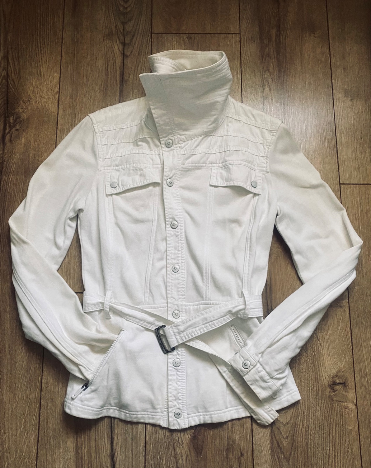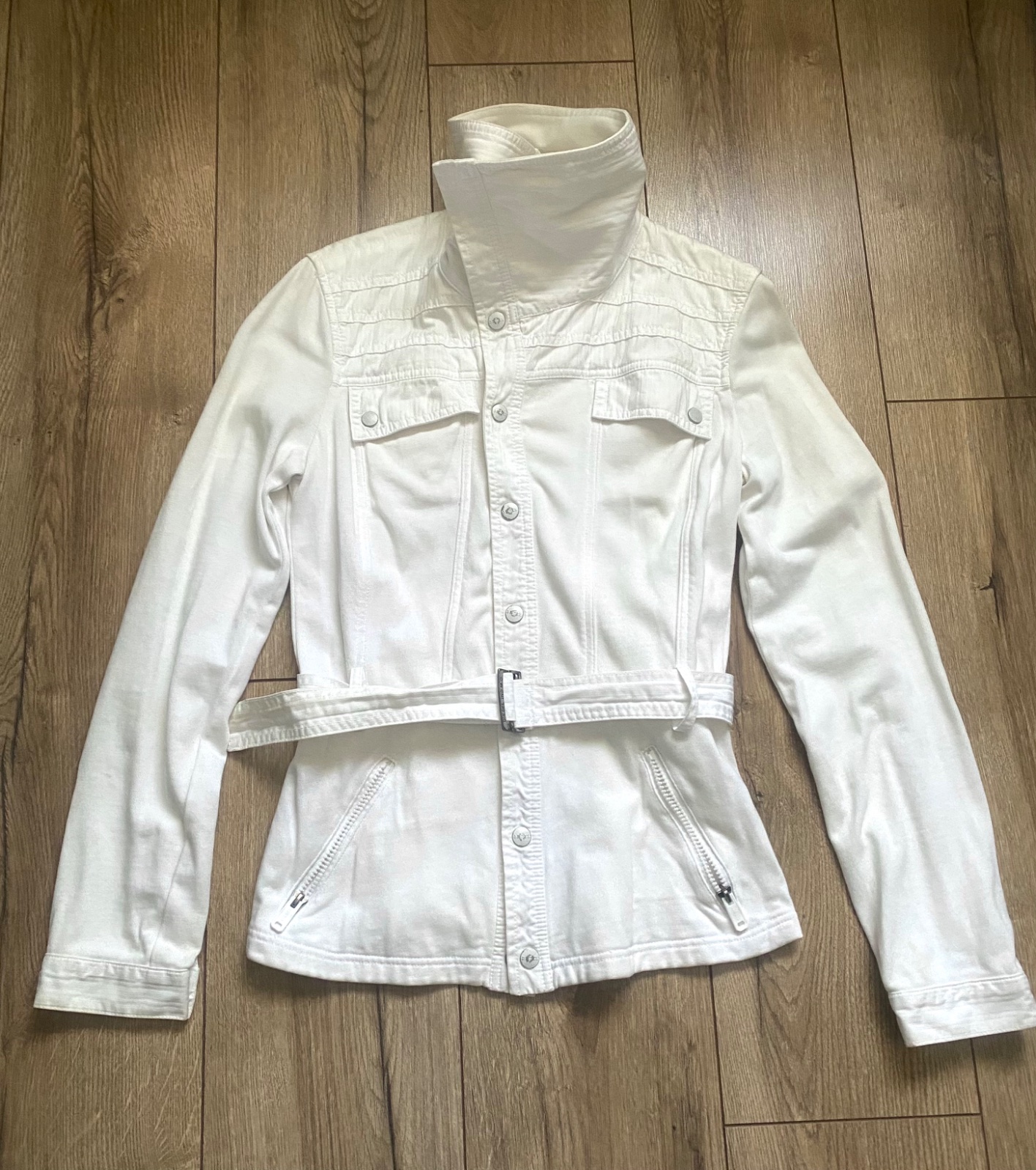 predám bundu z UK bez poškodenia manžety sa dajú odopnúť , farba je snehobiela dĺžka - 55cm, prsia- 50cm, pás - 42cm, rukávy - 63cm,