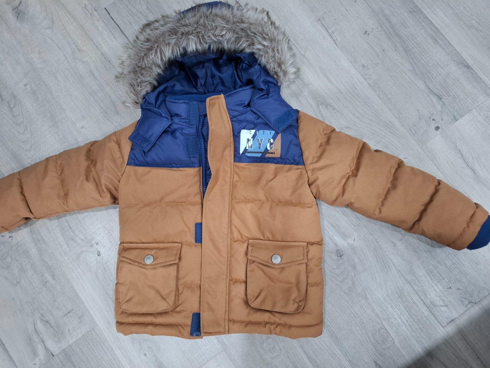 Perfektná zimná bunda,vhodná aj na lyžovačku -reflexna,vnútri stahovací pás na cvoky aby nepodfukovalo,sťahovanie rukavov,nosená ale super stav,110,4-5rokov.