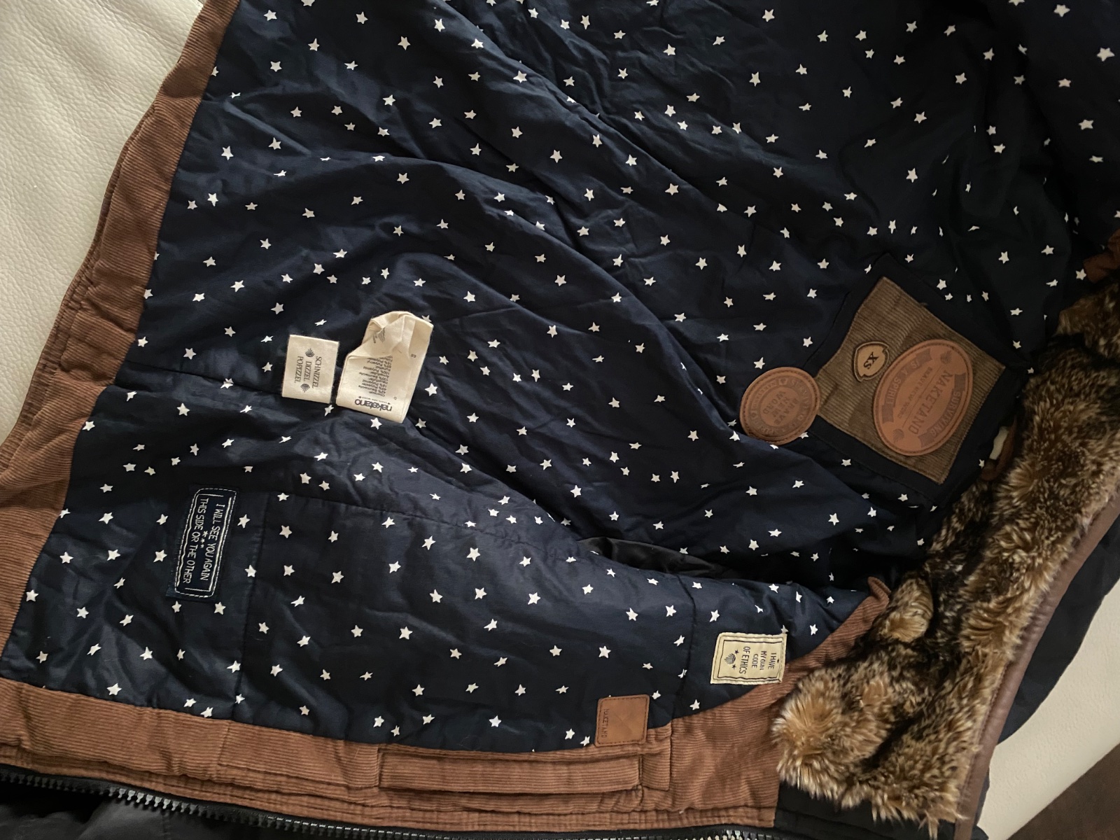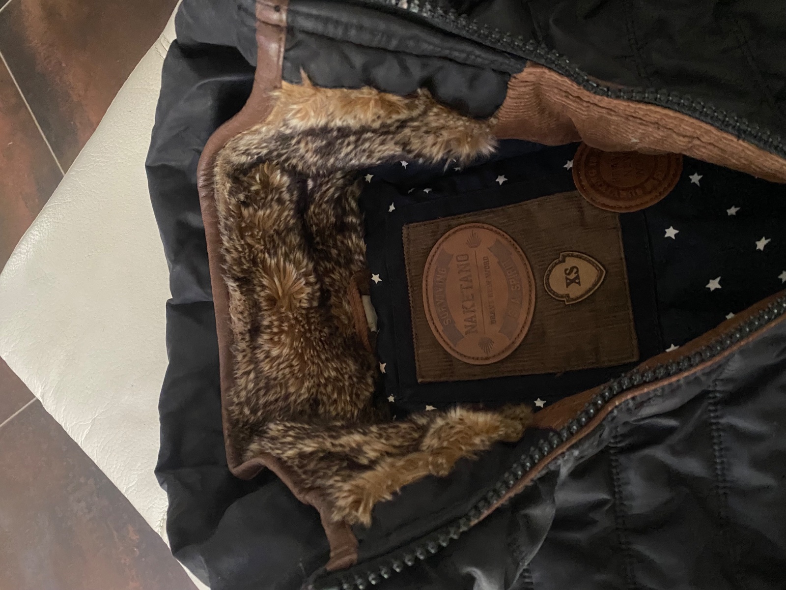 **SUPER stav*. Bez poškodenia. Štýlová bunda, aj do teplejšej zimy. Materiál: 100% bavlna, Podšívka: 100% polyester , Kožušina: umelá Miery: dĺ -75cm (chrbát od začiatku kapucne) š -48cm (pod pazuc...