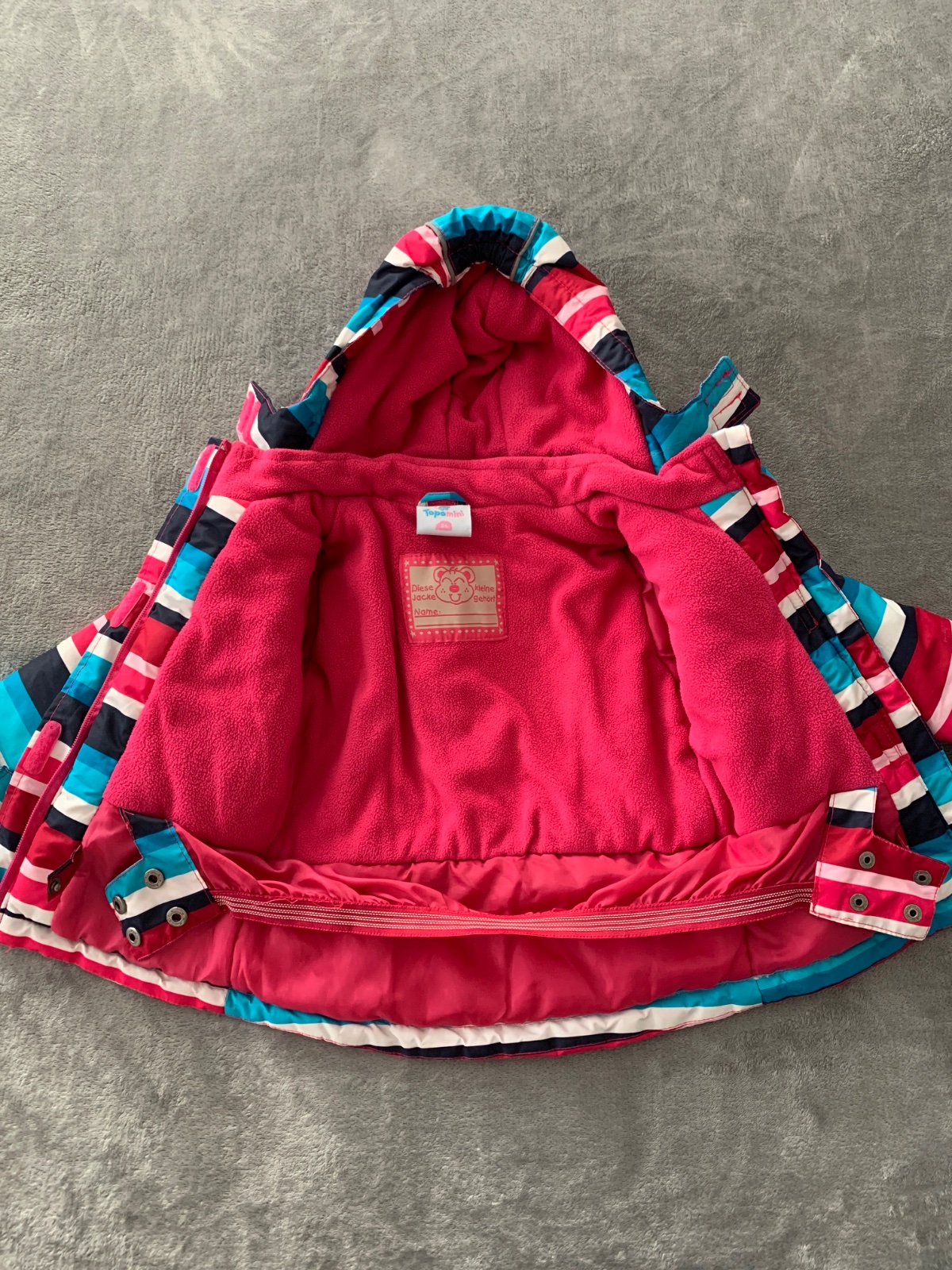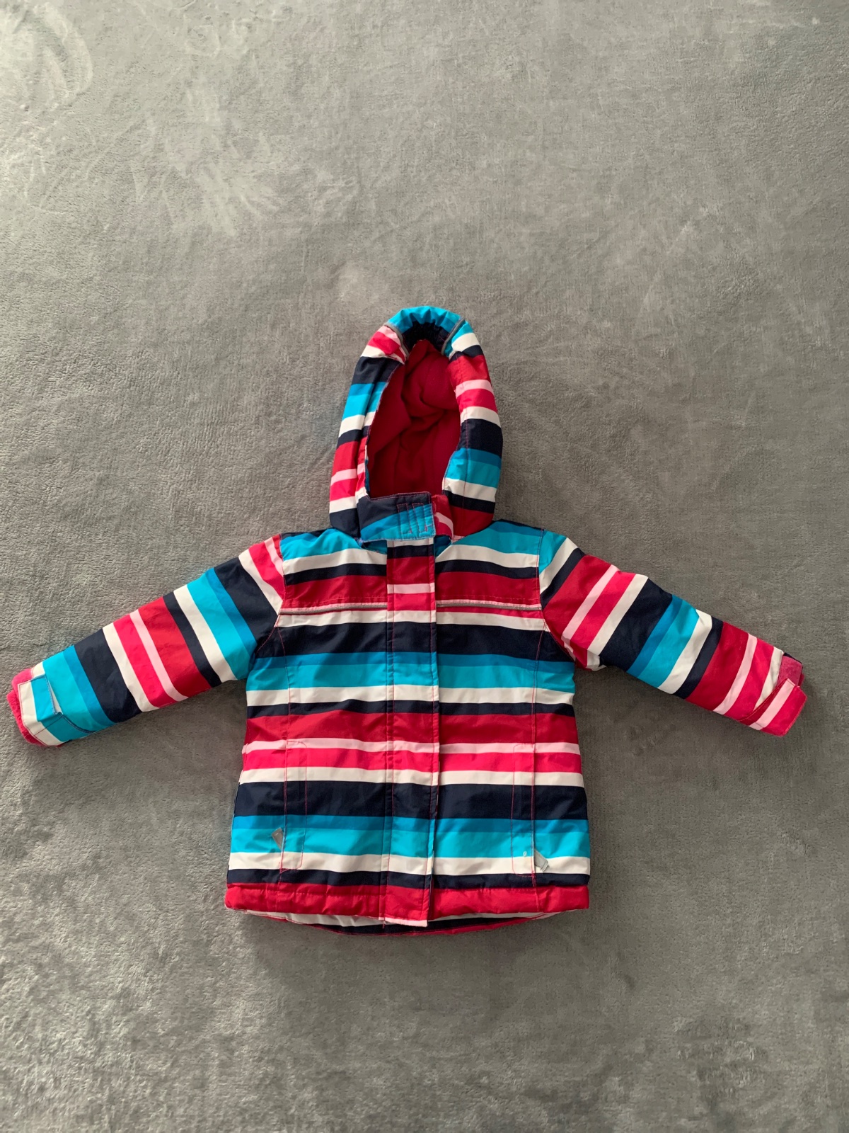 Flisom podšitá bundička v super stave. Farba niečo medzi ostro-ružovou a bordovou. Dĺžka 36 cm. Obvod pod pazuchami 76 cm. Rukáv od ramena 34 cm, od kapuce 44 cm. 2 vrecká. Kapuca na cvoky. *P003*