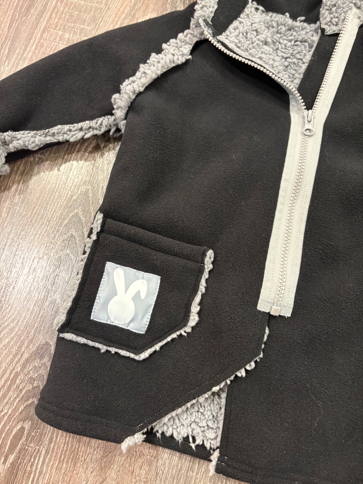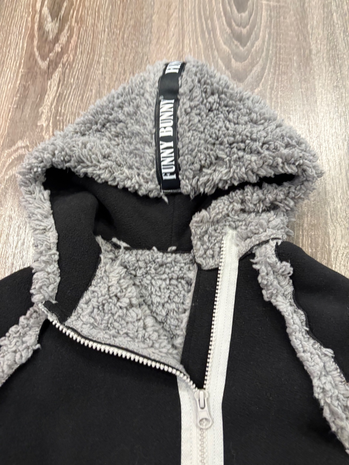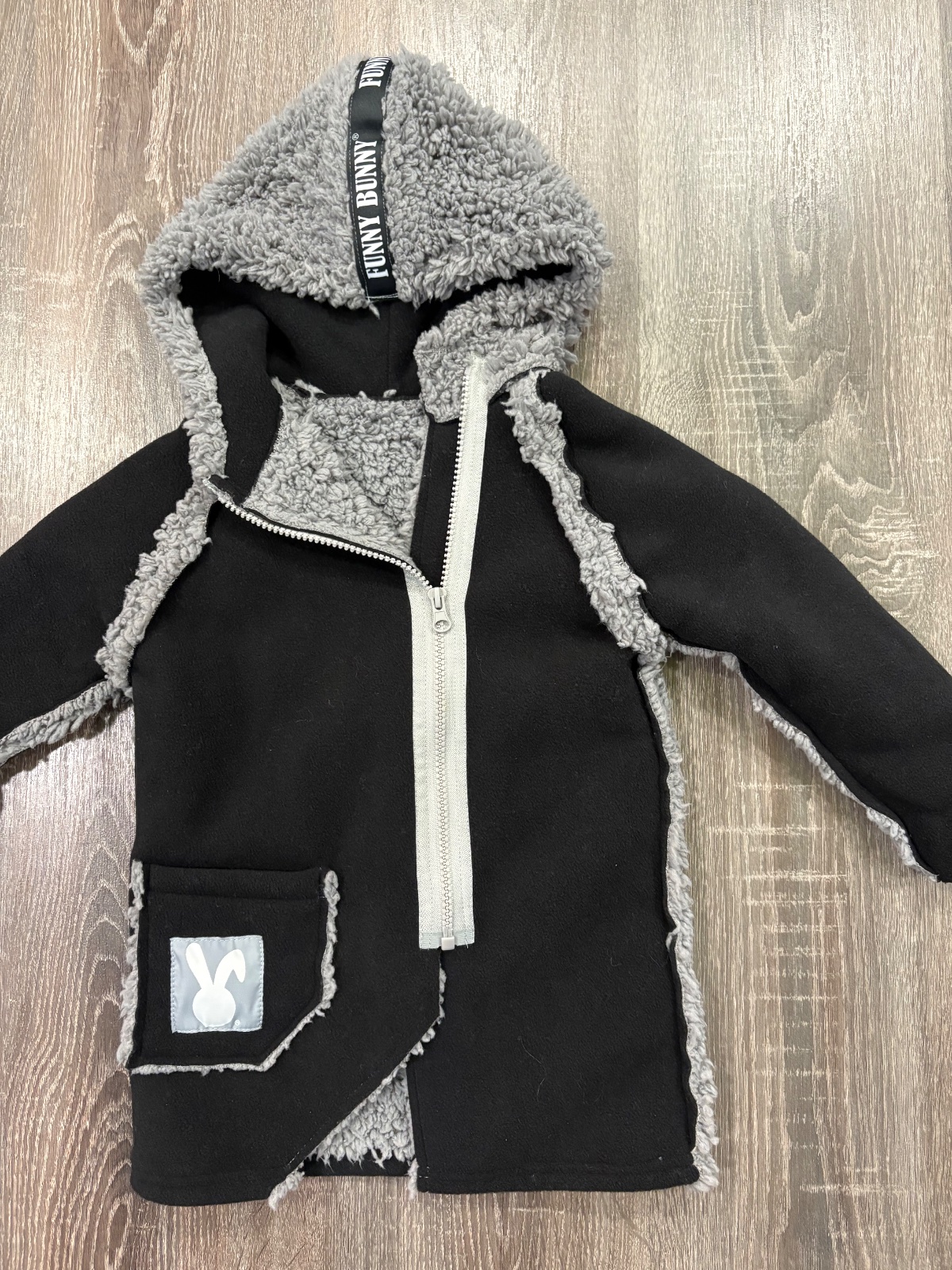 99.Funny Bunny hunaty kabatik s piskajucim vreckom, je rastuci nakolko sa rukav da podohnut …fakt krasny a ako novy,s kapucnou.Velkost 1-2 roky,dlzka je 48cm,dlzka rukava od krku je 41cm a sirka v podpazusi je od 33x2cm do 39x2cm