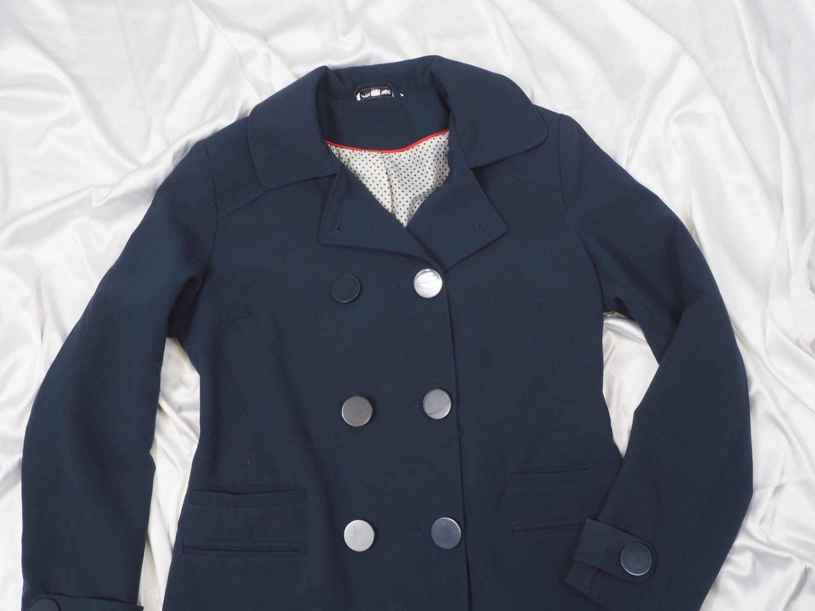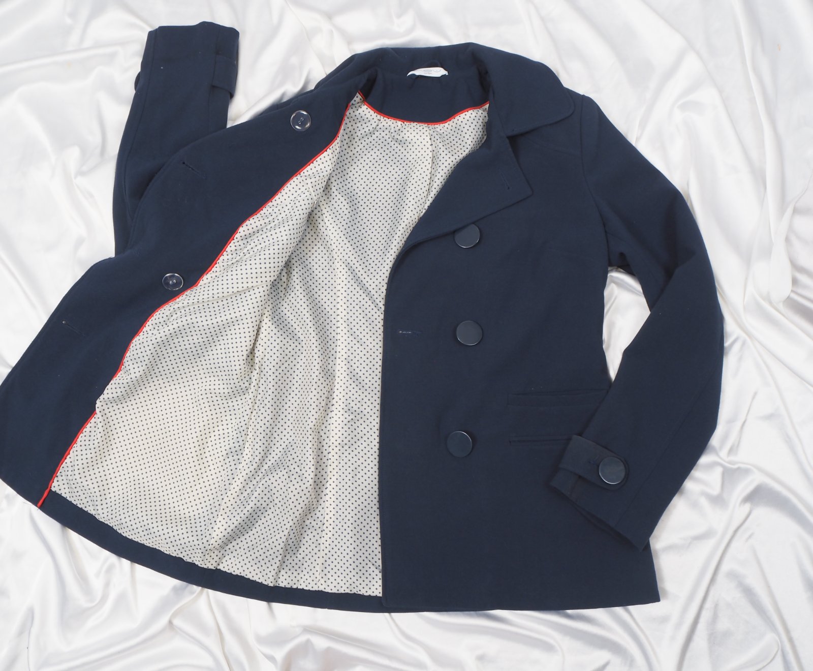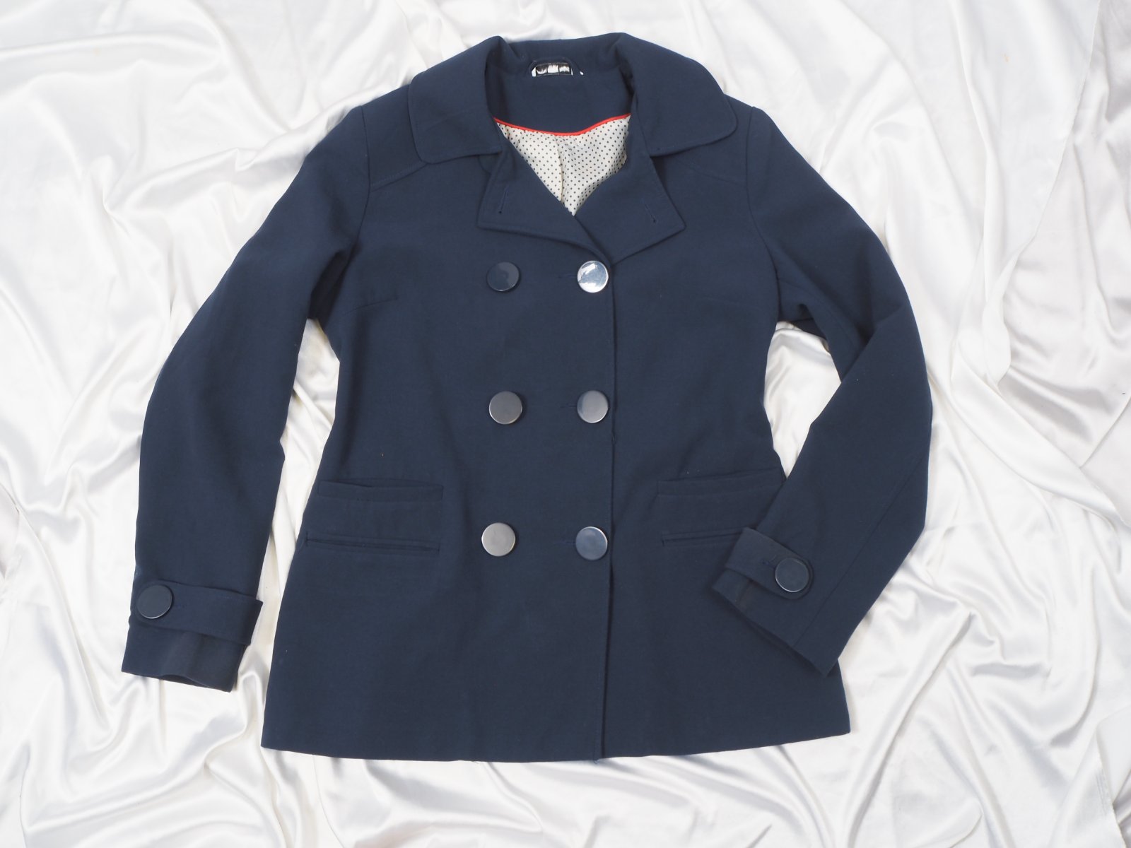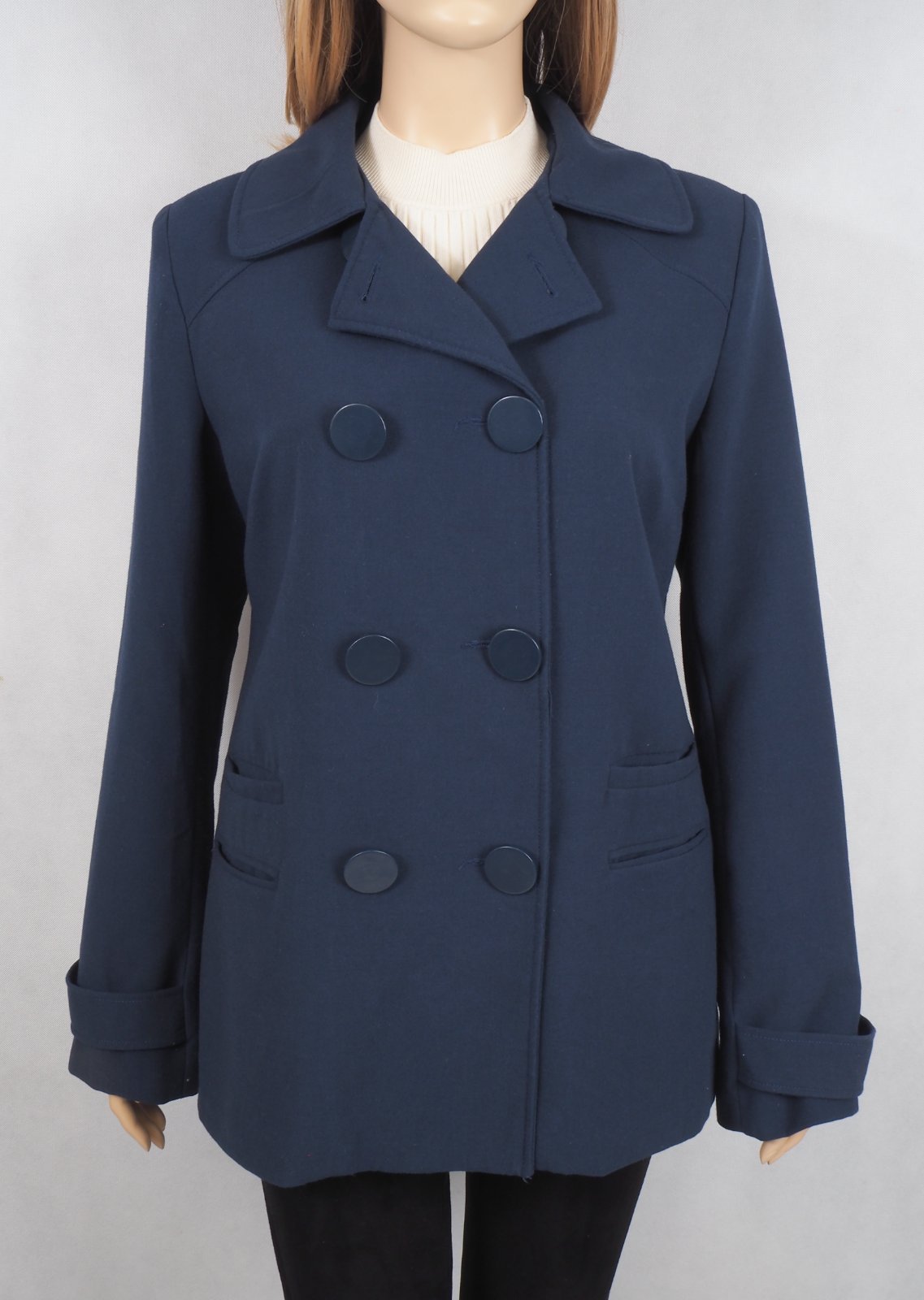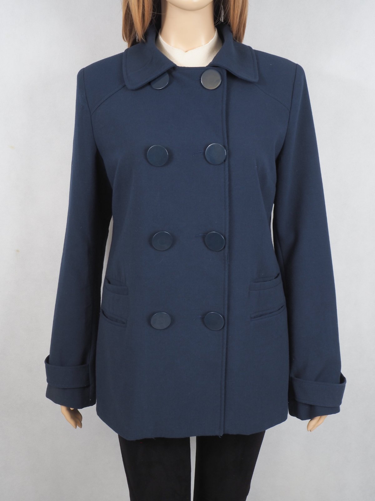 Kvalitný prechodný kabát, dvojradové zapínanie, podšitý, materiál 64% polyester, 31% viskóza, 5% elastan, super stav.
