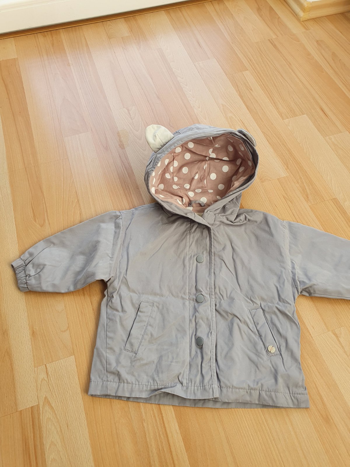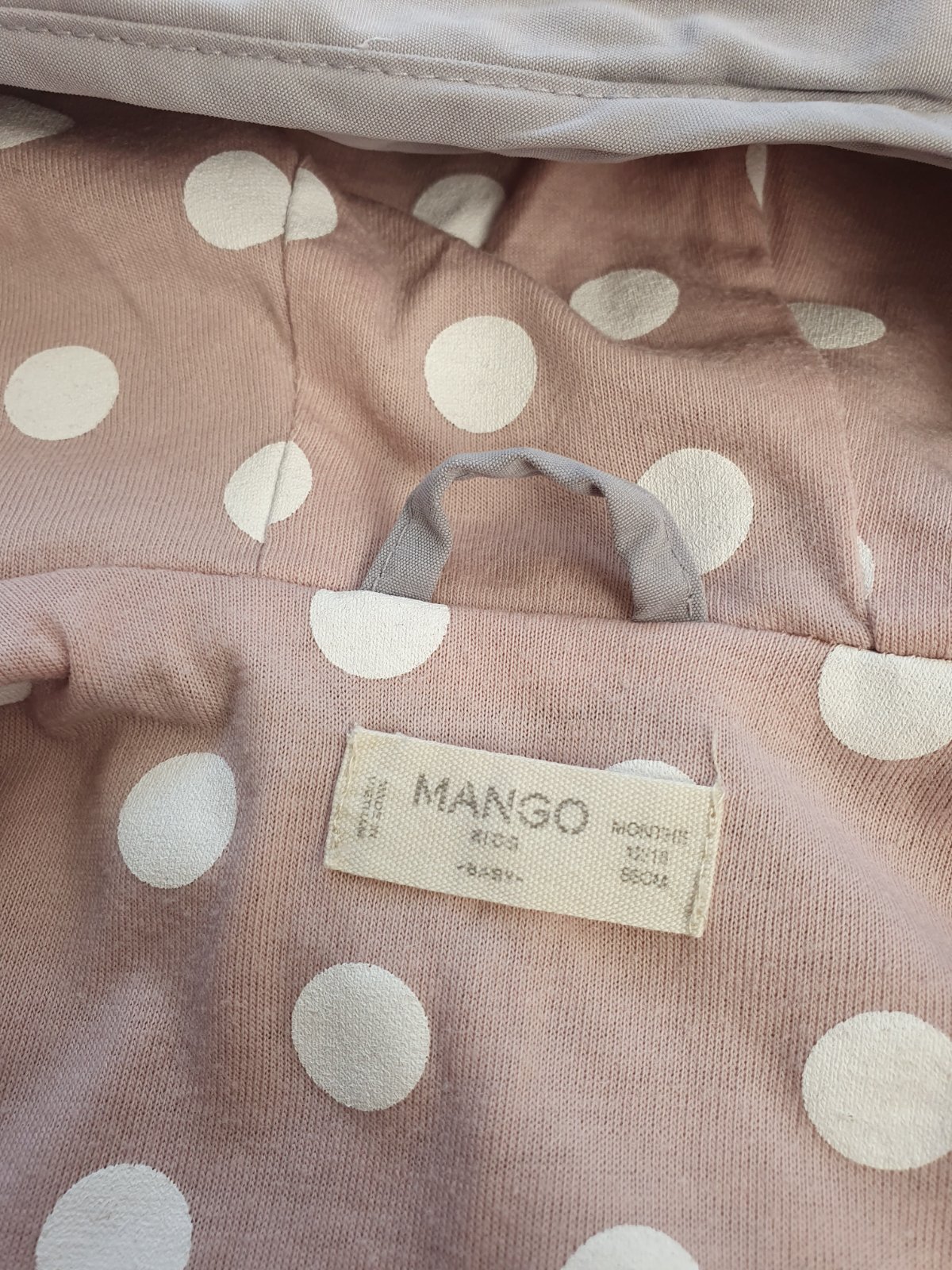 krasnamalo nosena prechodna bundicka MANGO bez poskodenia velkost 12-18m.Dl 34cm,s 2x 35cm,rukav od ramena 25cm.Neprefukava a nepremokava.