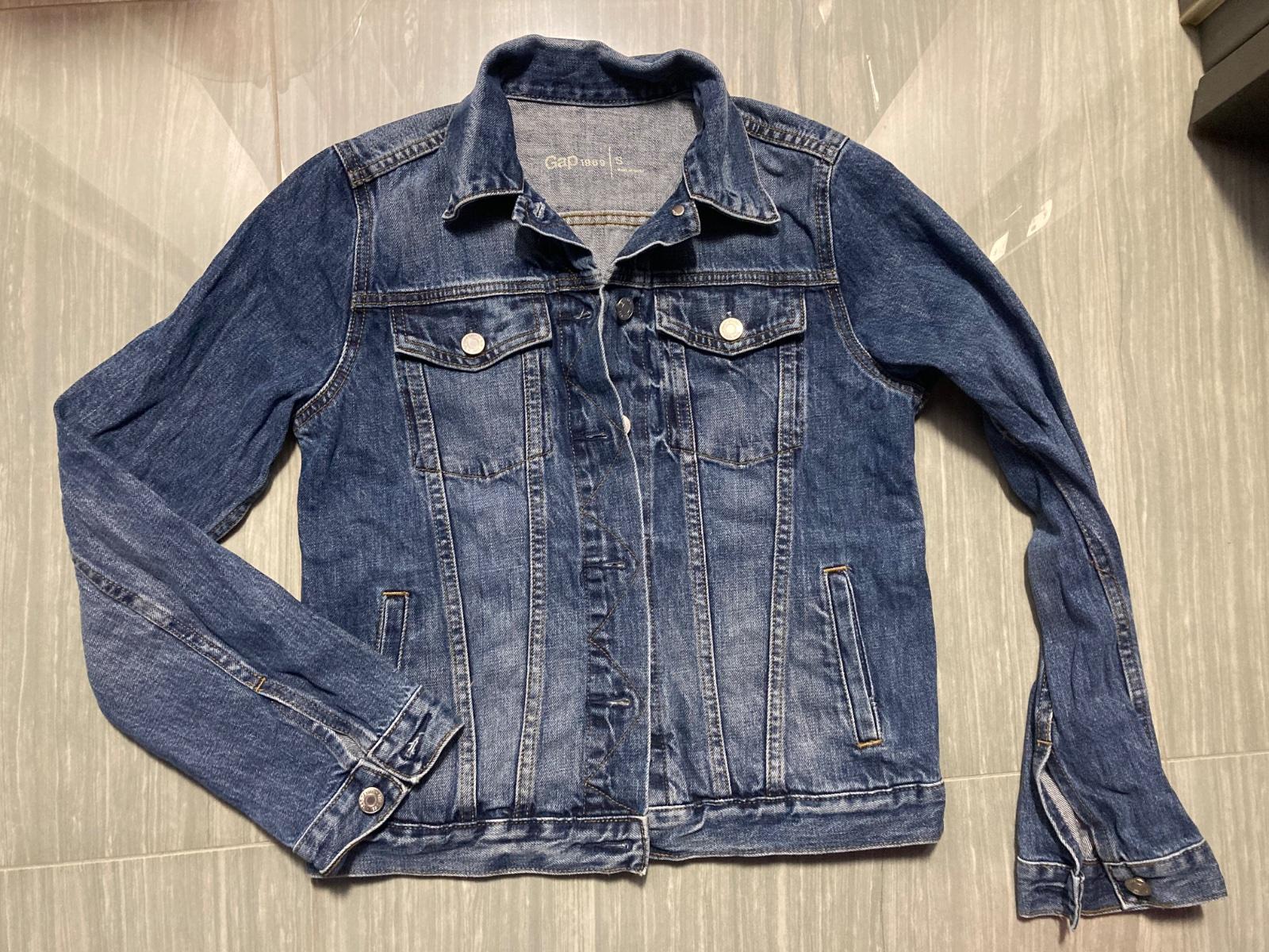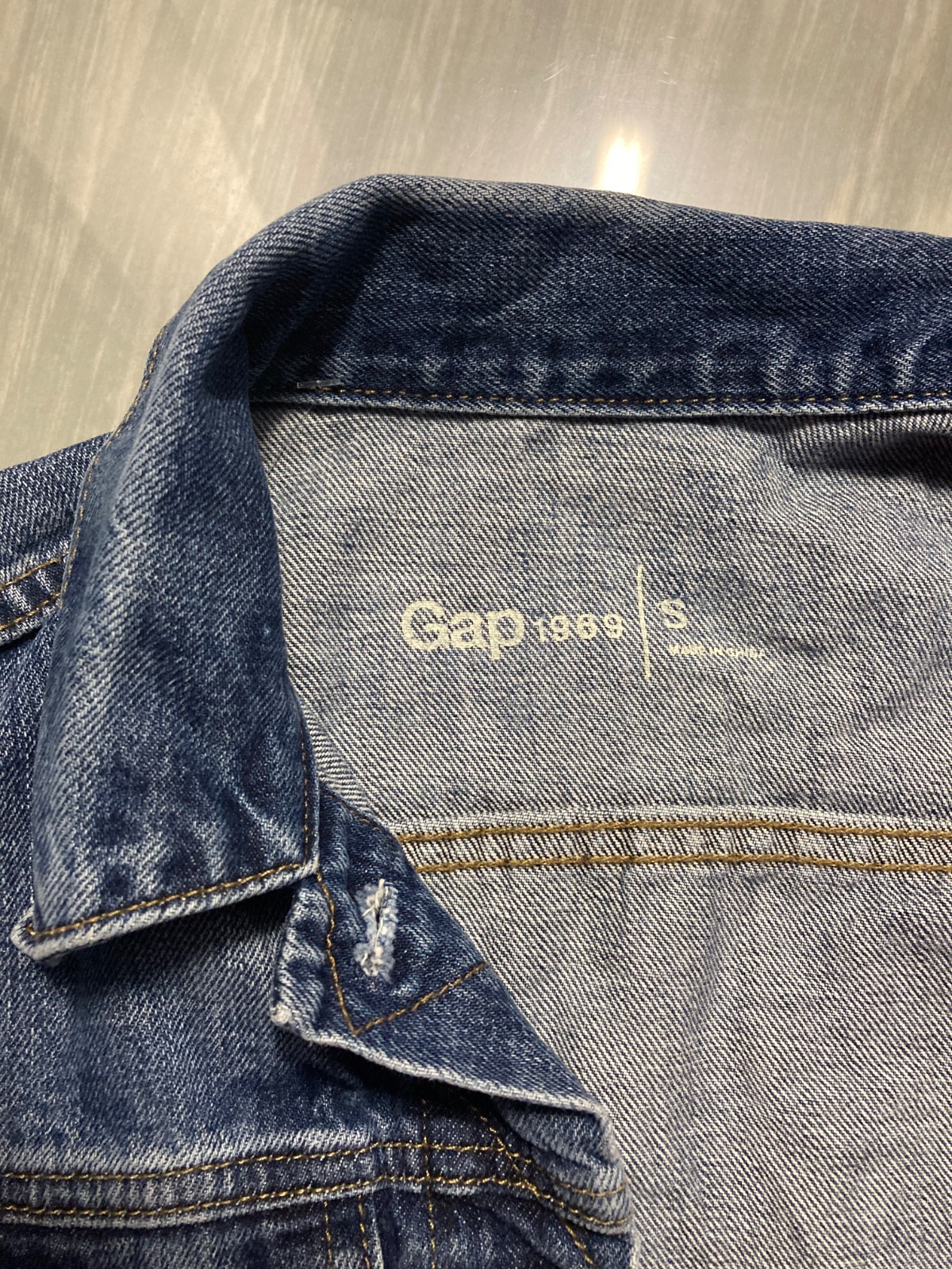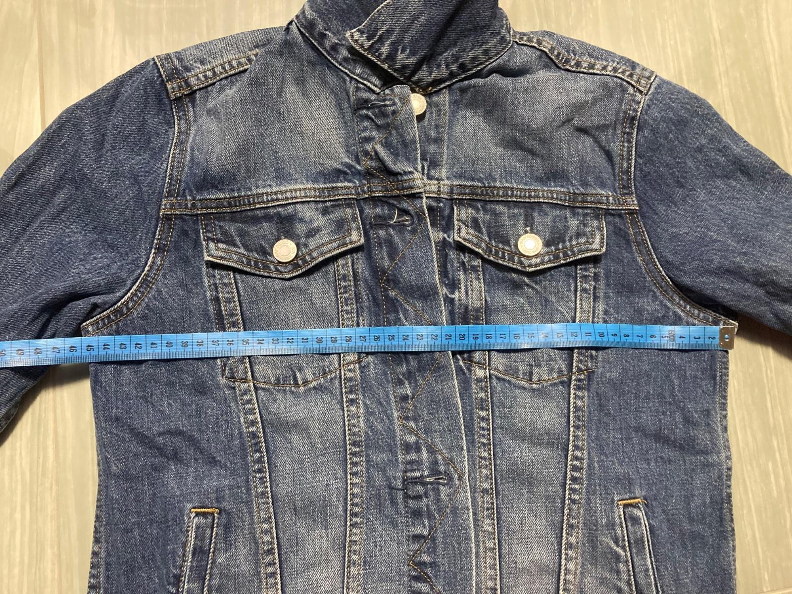 Kvalitná riflovka GAP, veľkosť S, farba ako na prvej foto. Univerzálny kúsok. 100% bavlna. Bez poškodení, nenosila som, je mi úzka cez prsia. Rozmery na foto.
