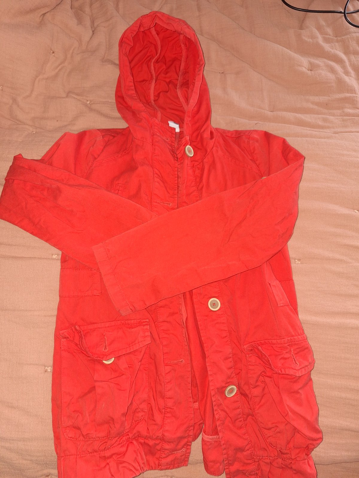 Bundicka do dazda, odnimatelna kapucna, dobry stav. Rukav 49cm + 8cm patent, dlzka bundy 55cm