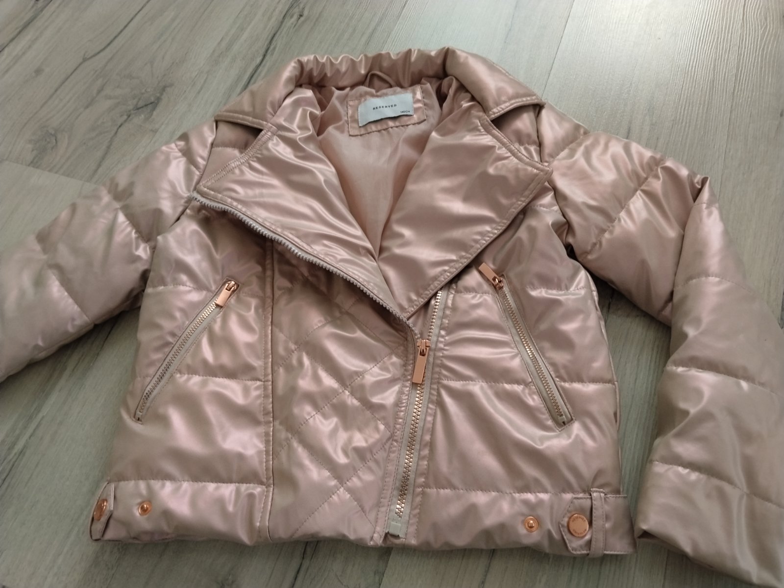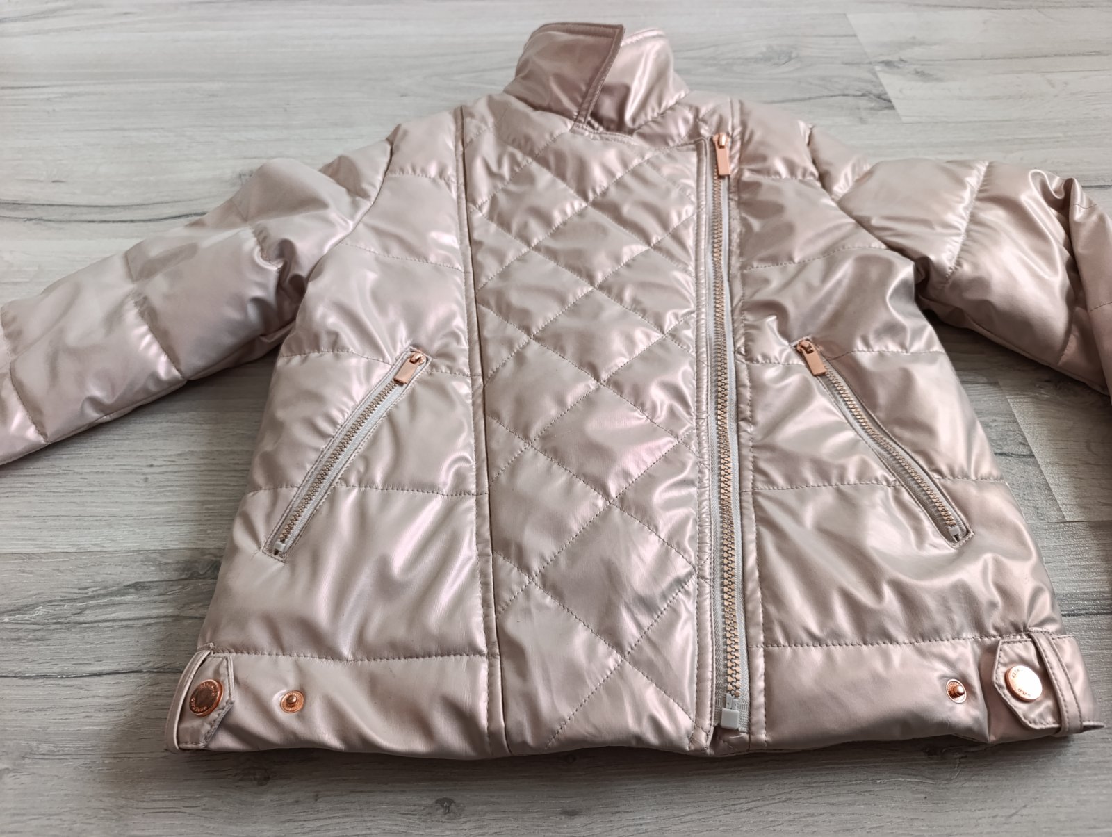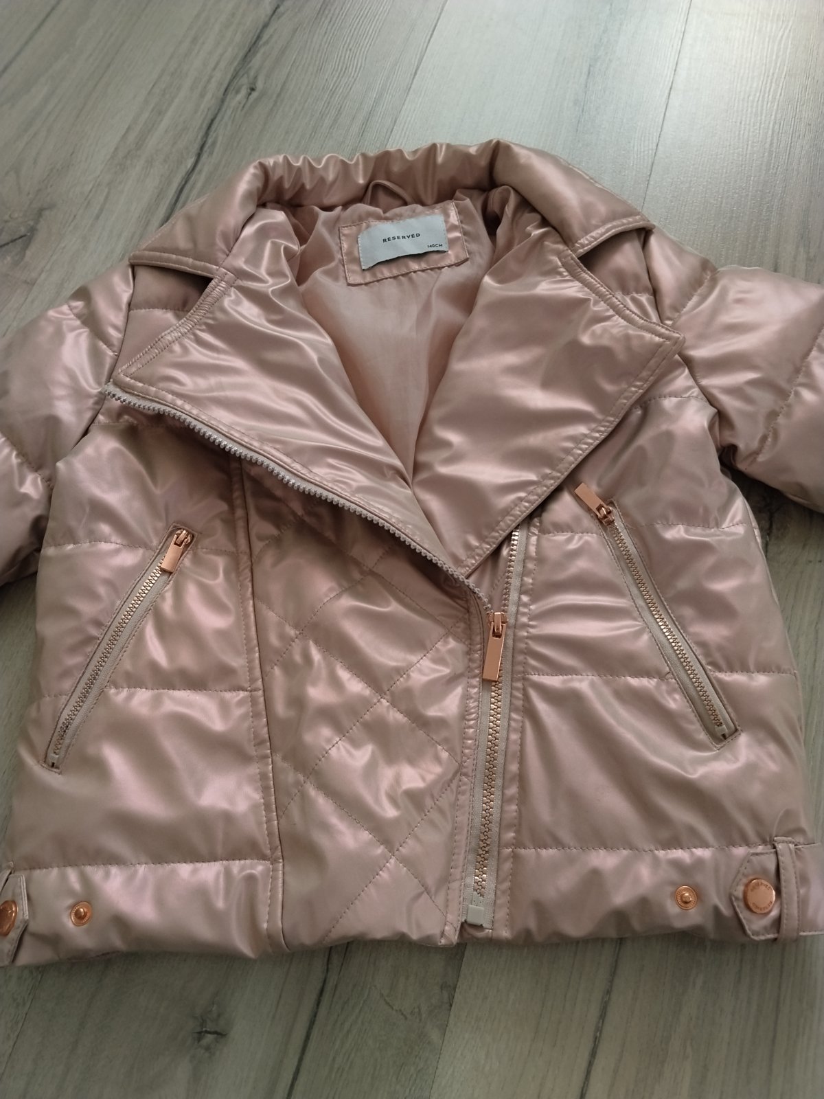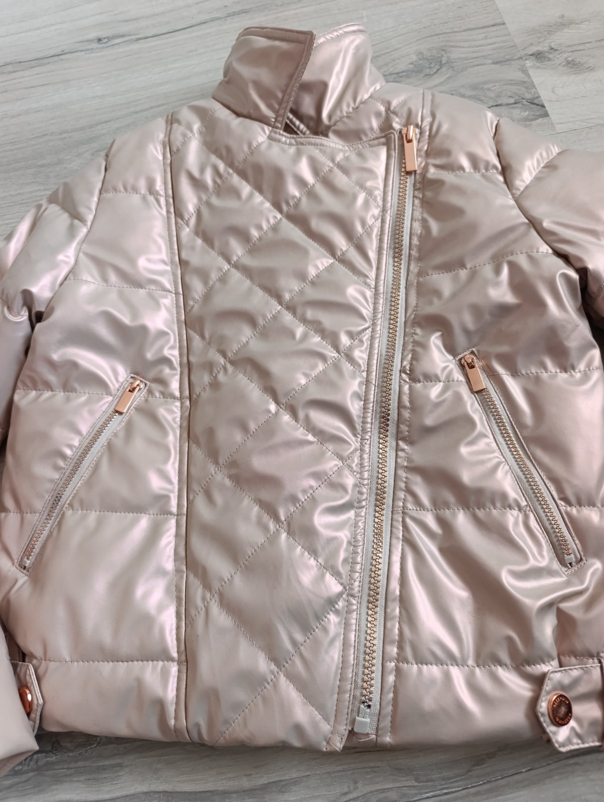 Moderná lesklá bunda perleťovej farby, materiál ekokoženka, je vatovaná tak je aj dosť teplá. Krátko nosená, výborný stav bez poškodení. Pri výmene 14€