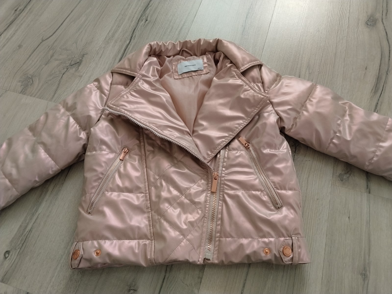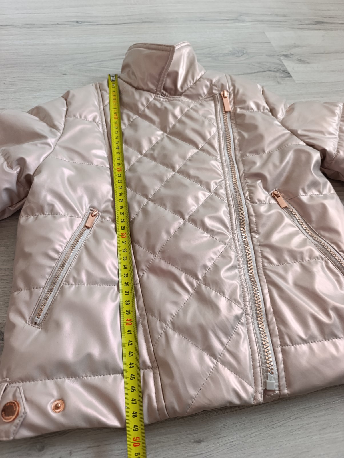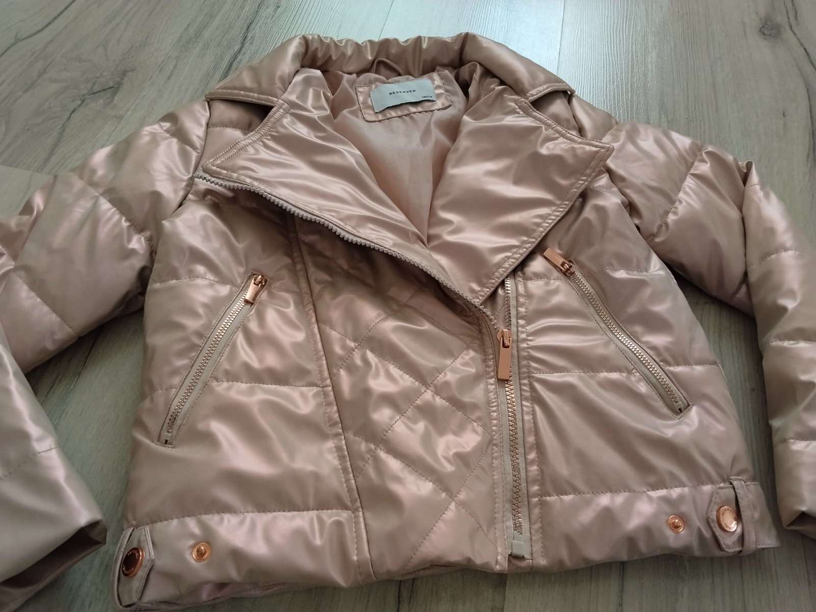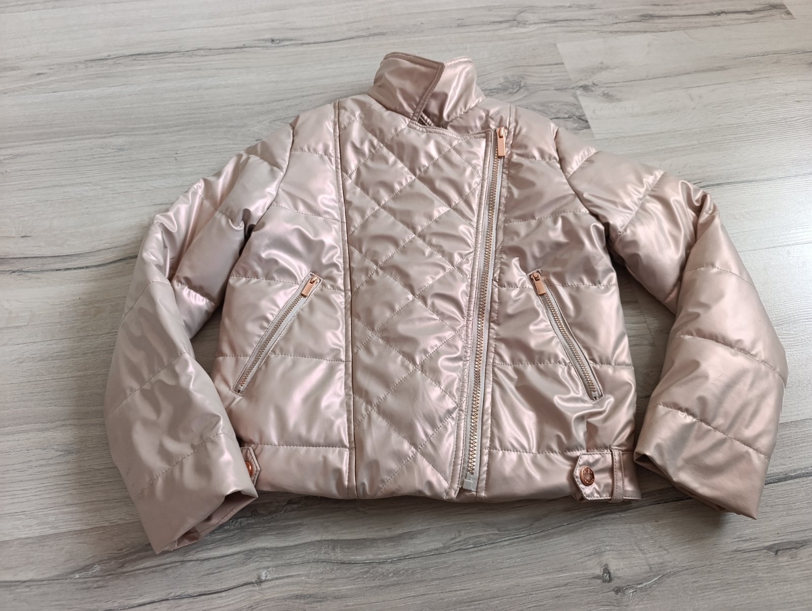 Moderná lesklá bunda perleťovej farby, materiál ekokoženka, je vatovaná tak je aj dosť teplá. Krátko nosená, výborný stav bez poškodení. Pri výmene 14€