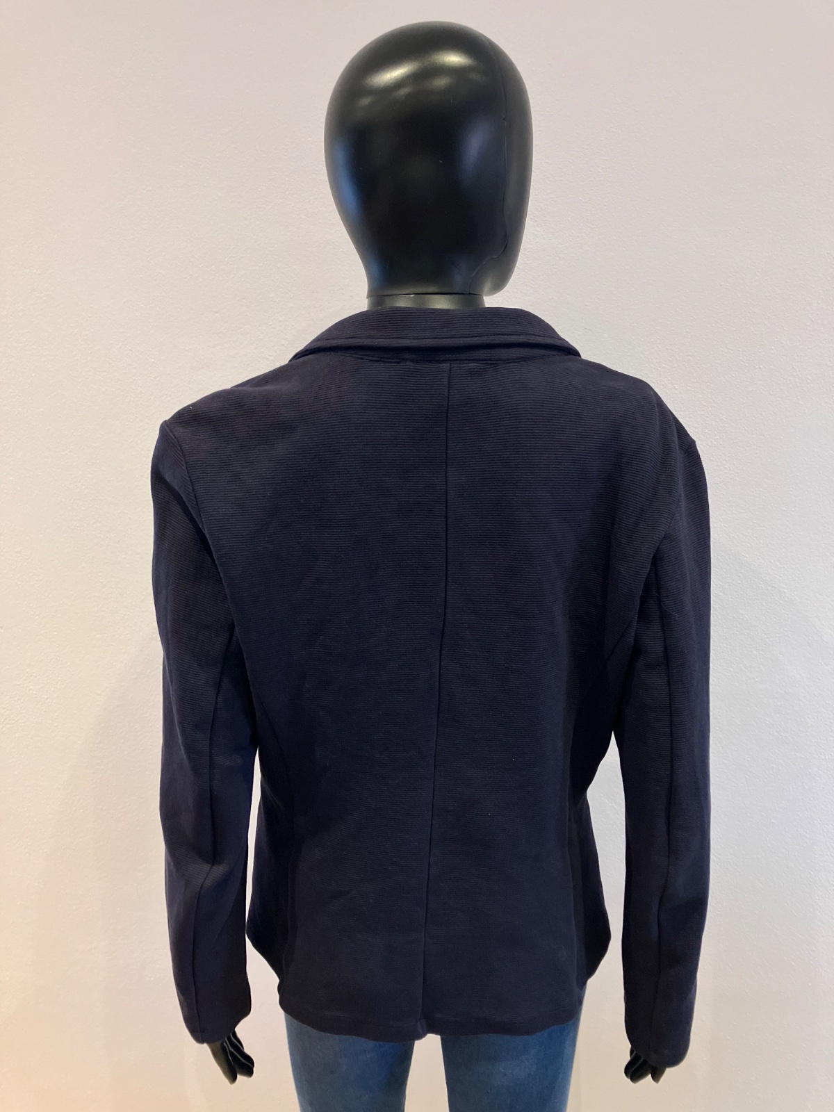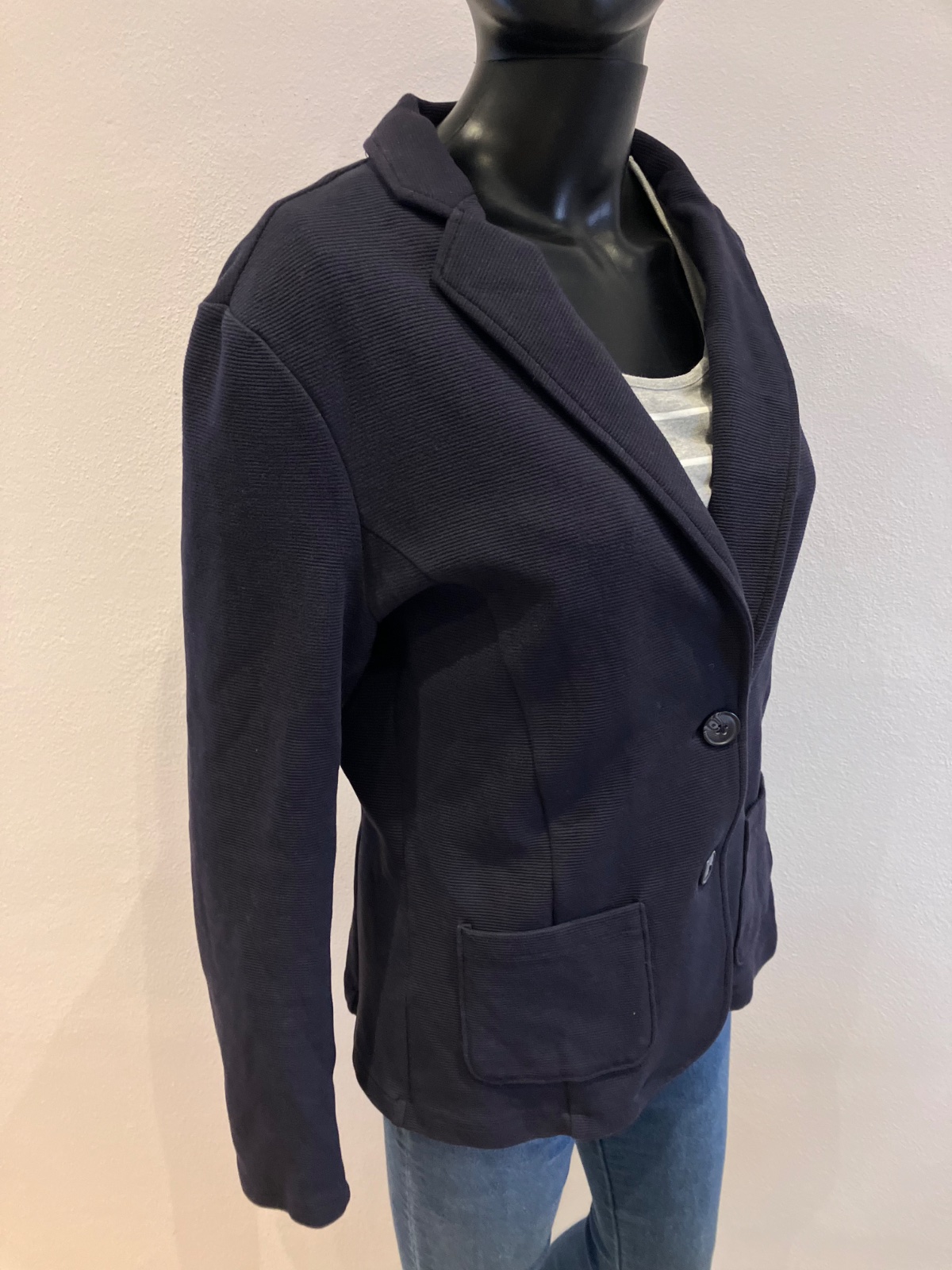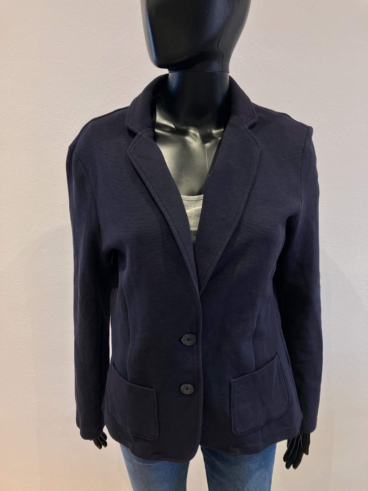 Dámske tmavomodré sako, zapínanie na dve gombíky, dve predné vrecká, elastické, materiál 98%bavlna 2%elastan.