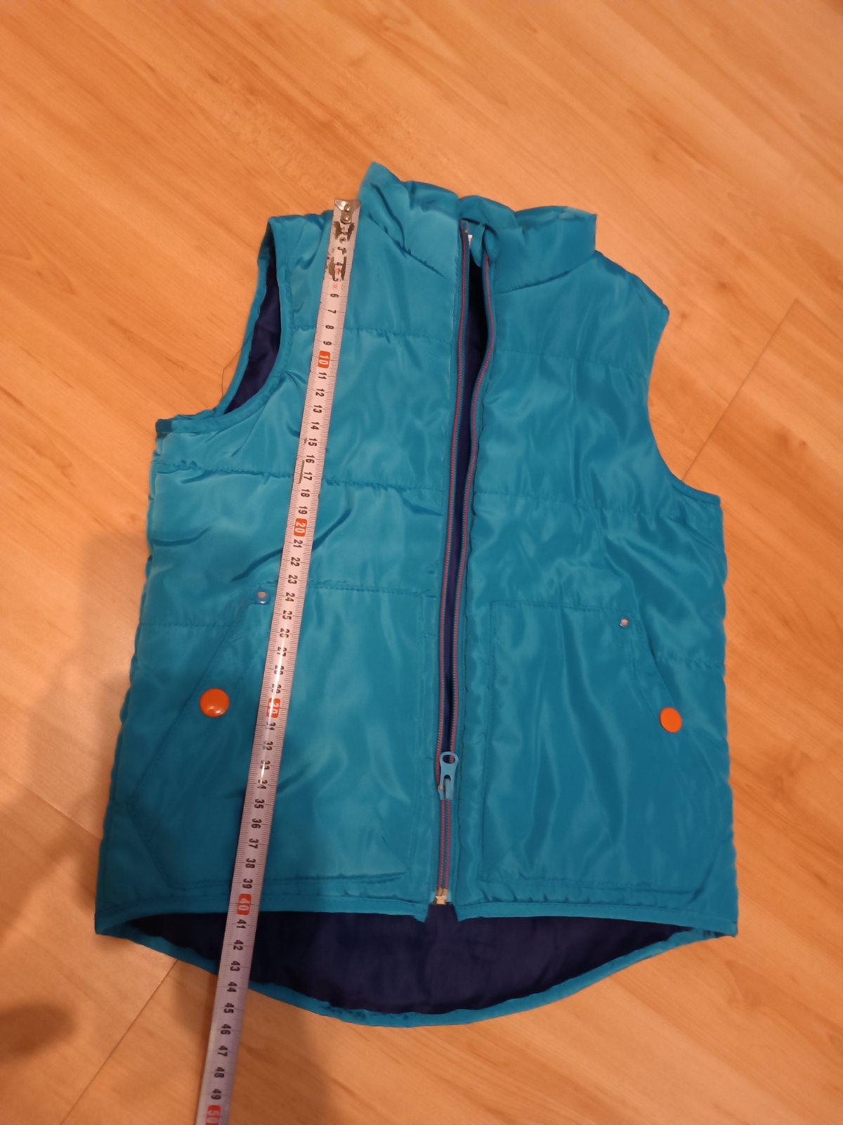 Málo nosená hrubšia vesta, bez poškodenia. Đĺžka od krku je 43 cm+ golier 5cm. Šírka pod pazuchami je 36×2cm.Jemne lesklá.