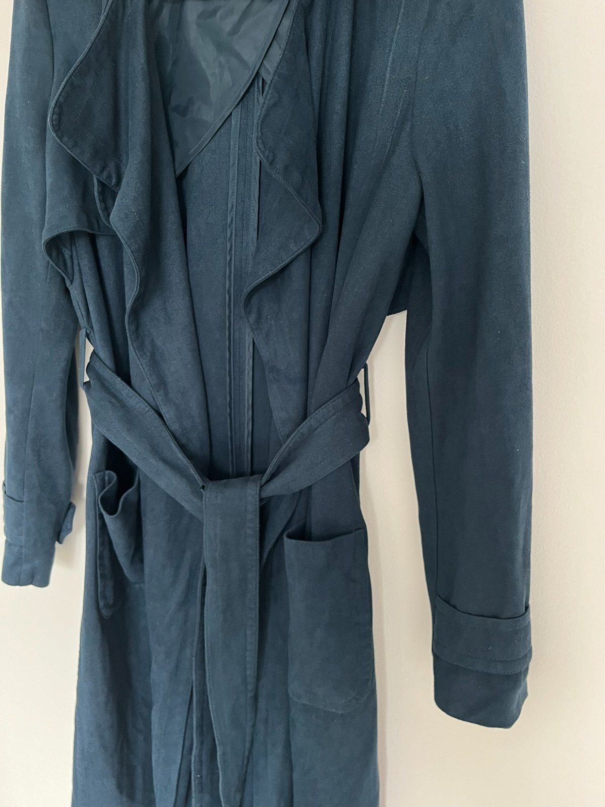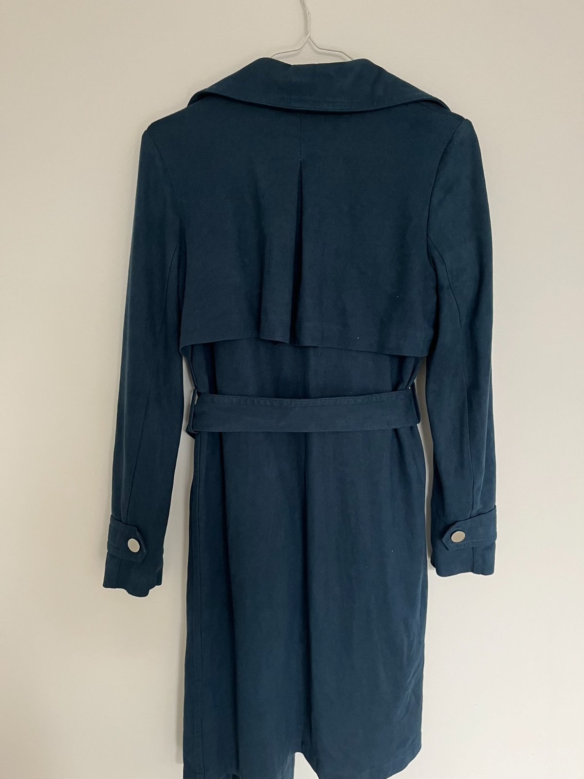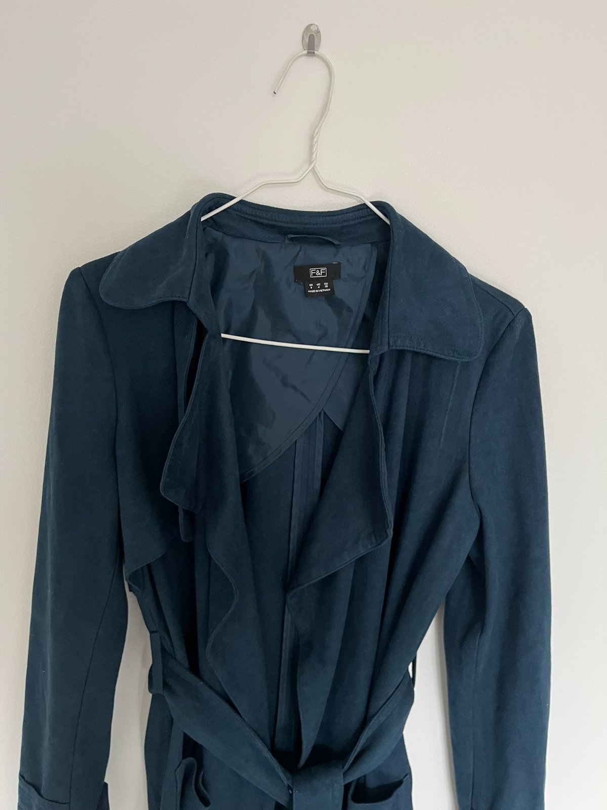 Tmavomodrý semišový elegantný prechodný trenčkot