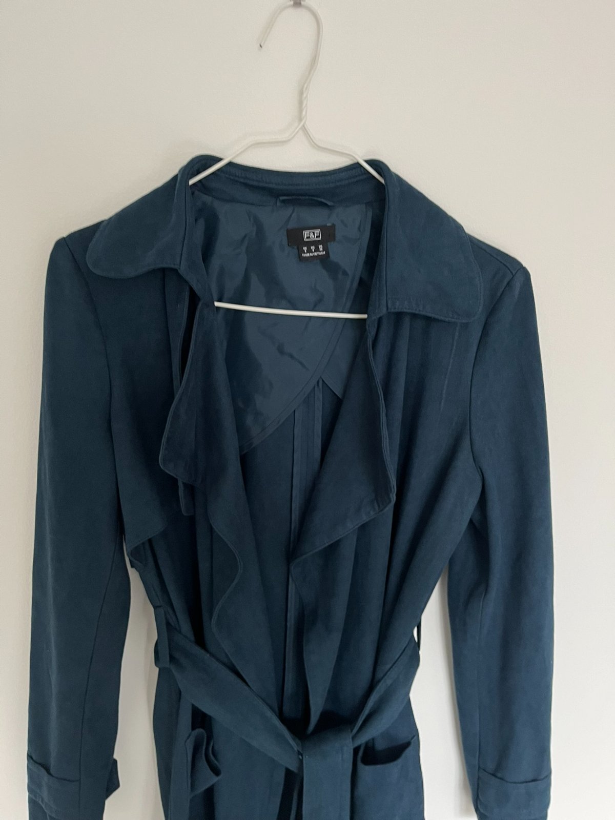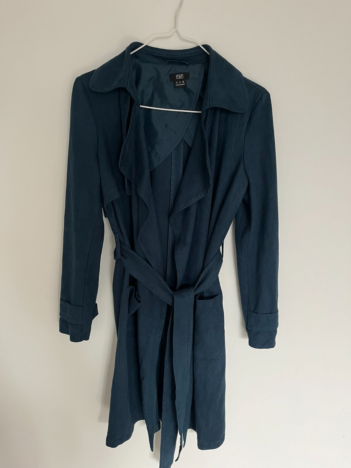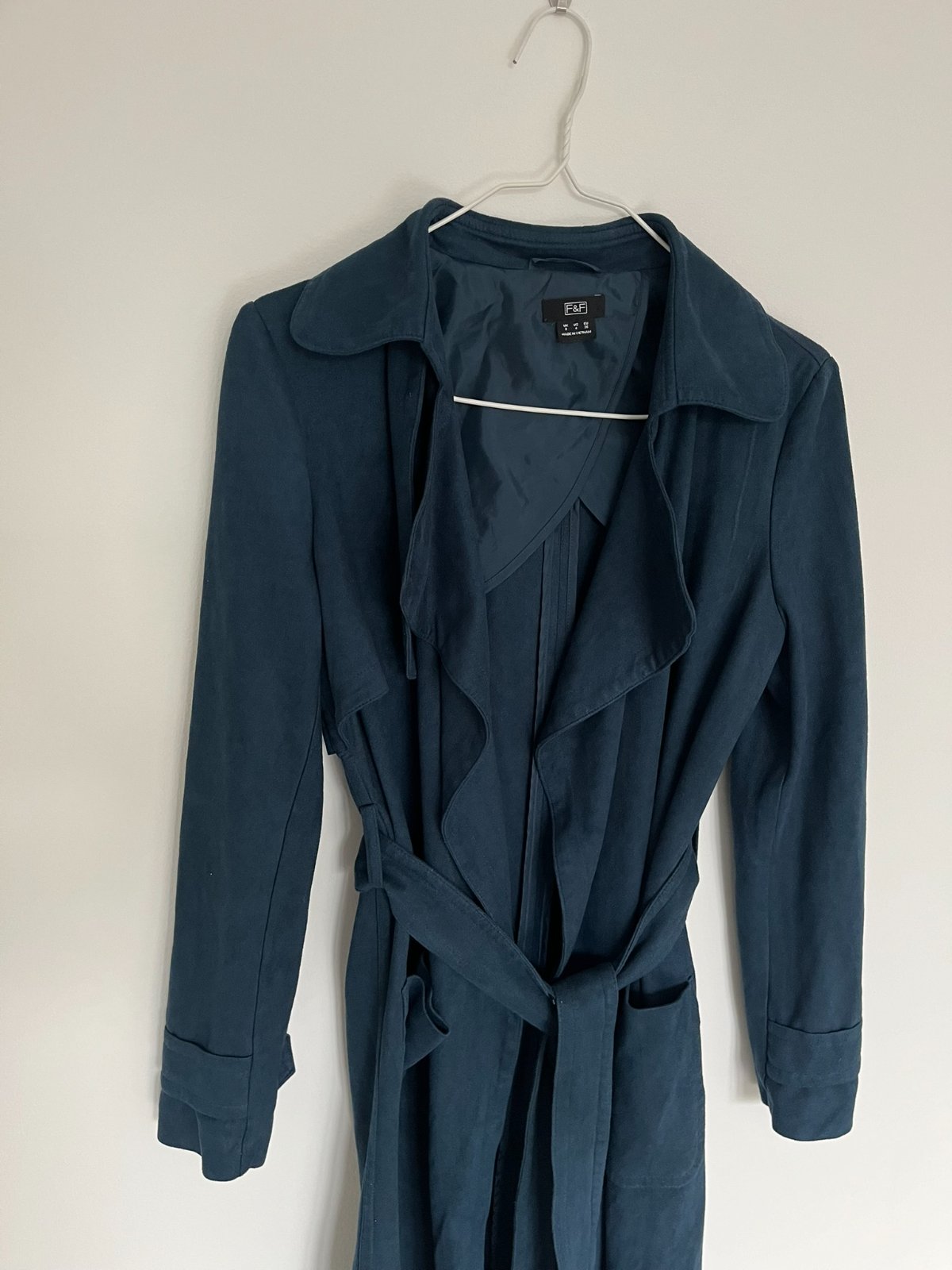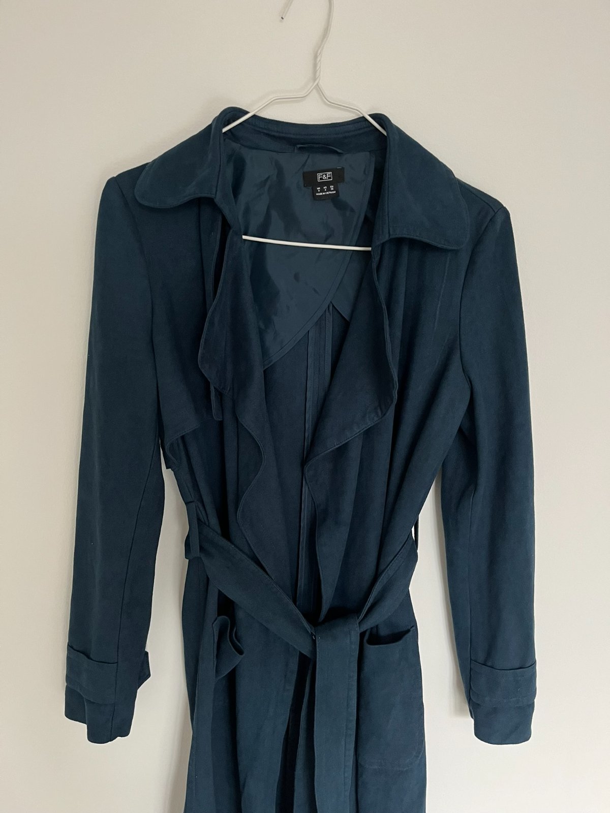 Tmavomodrý semišový elegantný prechodný trenčkot