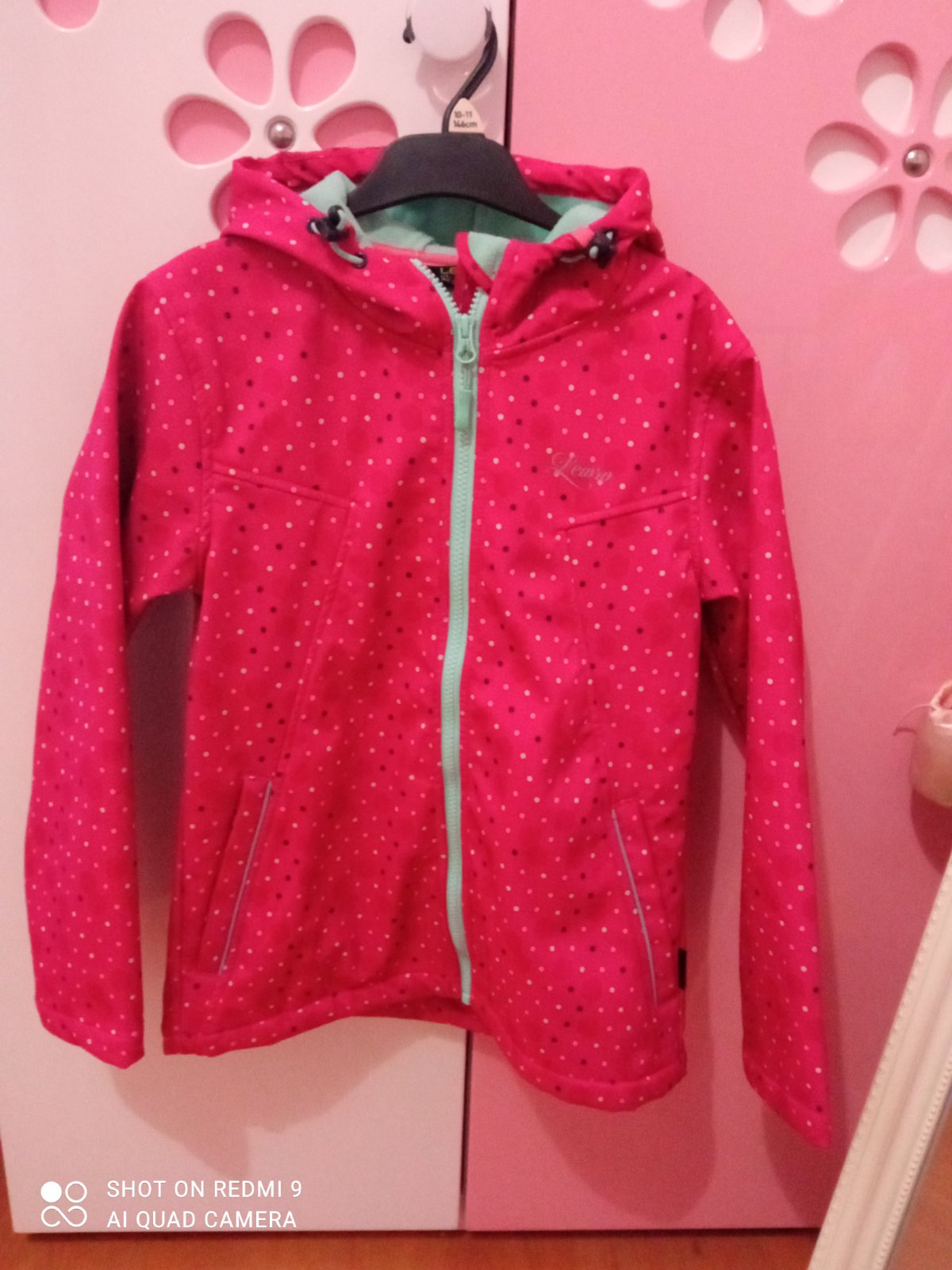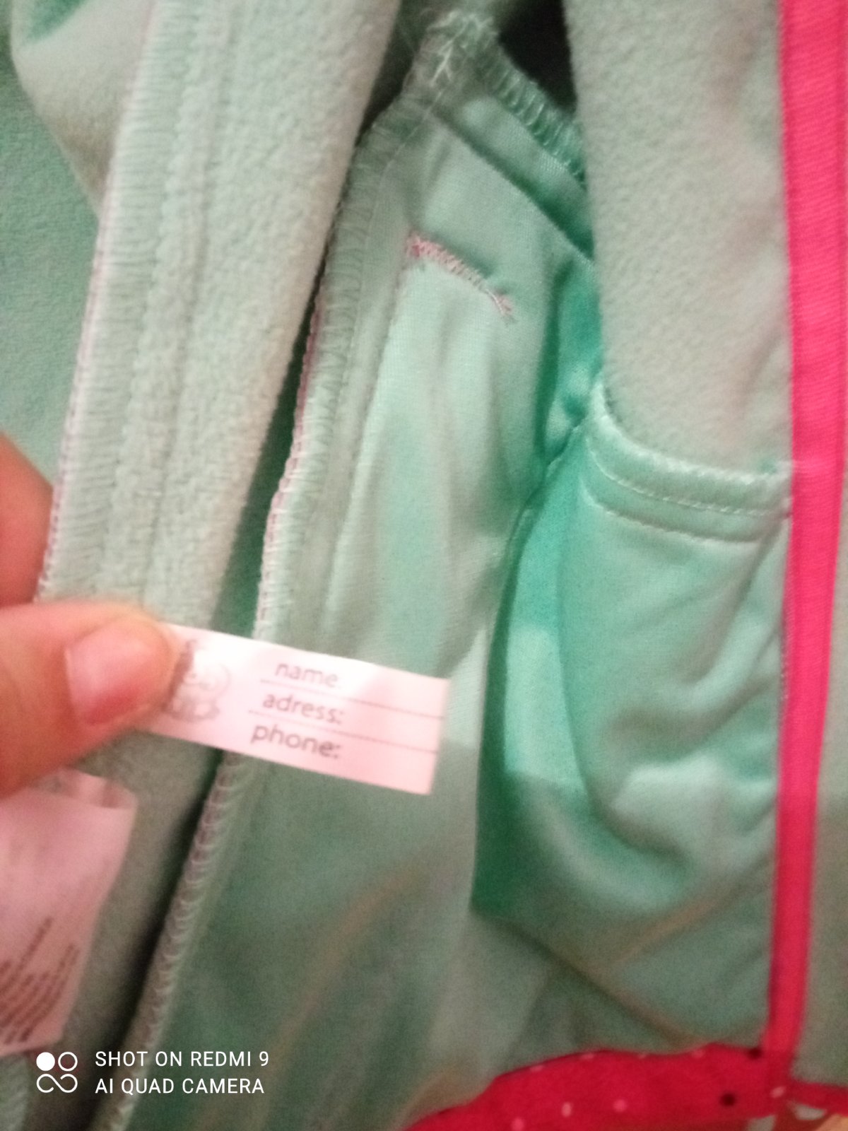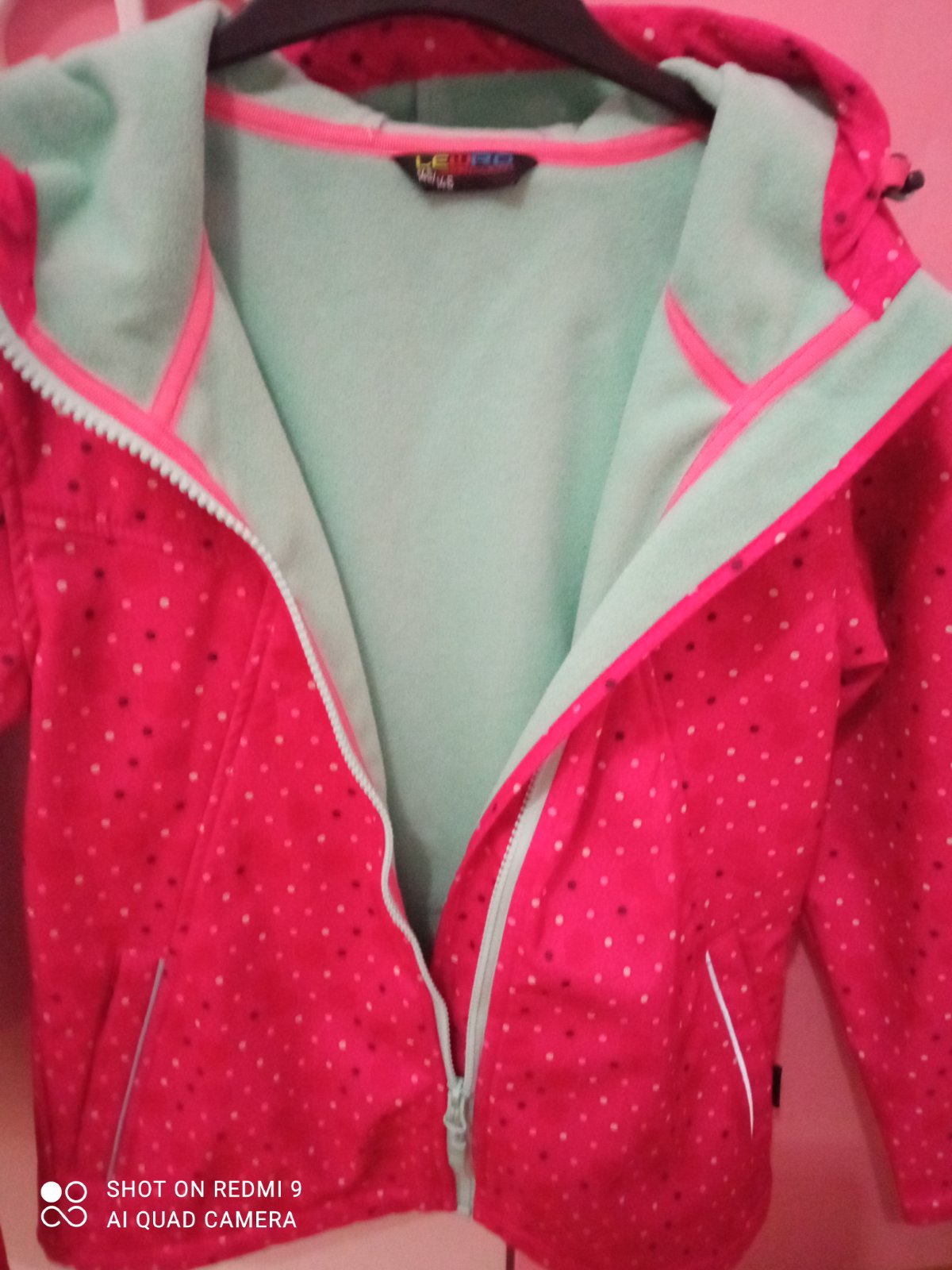 Vnútro a zips pastelovej zelenkavej farby, s penvou kapucou.