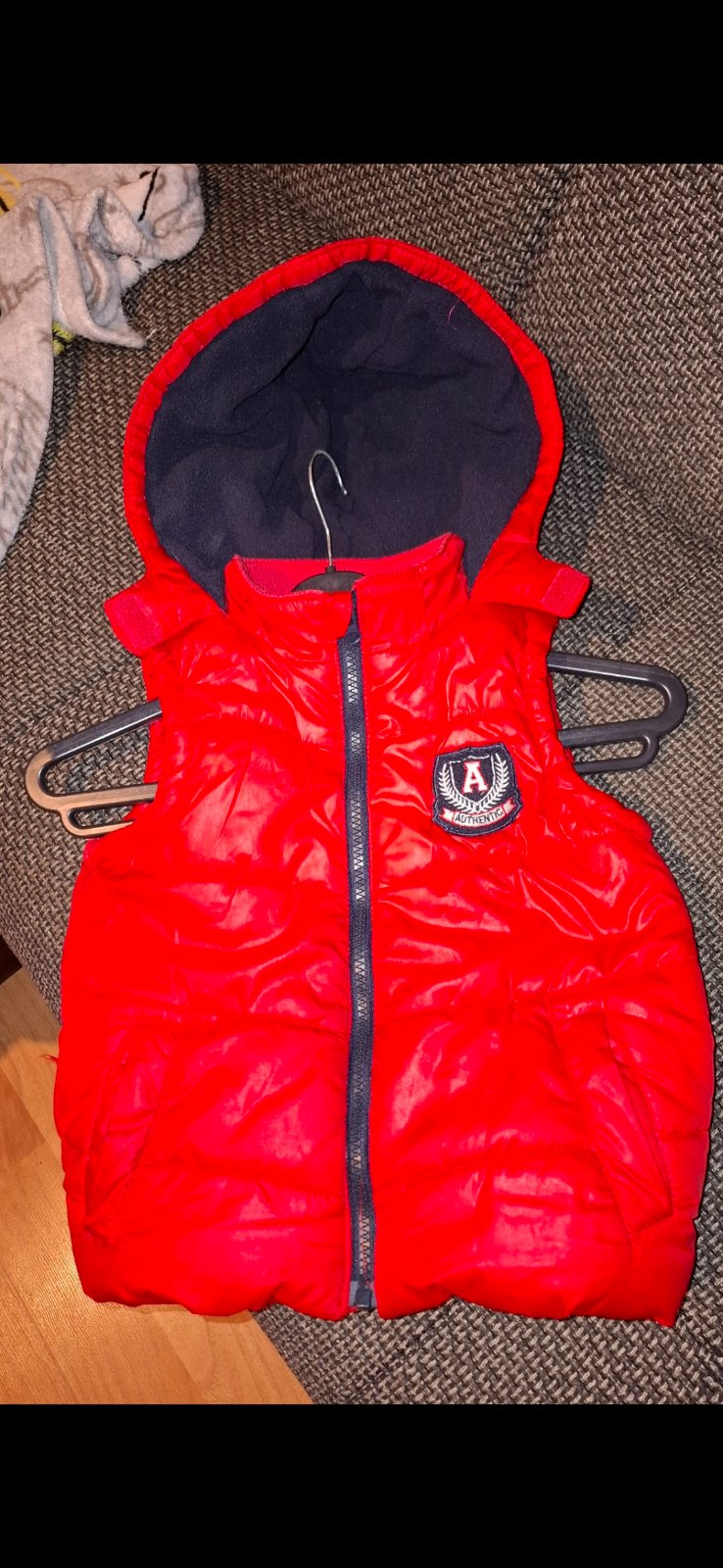 Krásna jasná červená farba. Vestička má vrecká. Kapucňa sa dá odopnút. Dlžka 40cm.