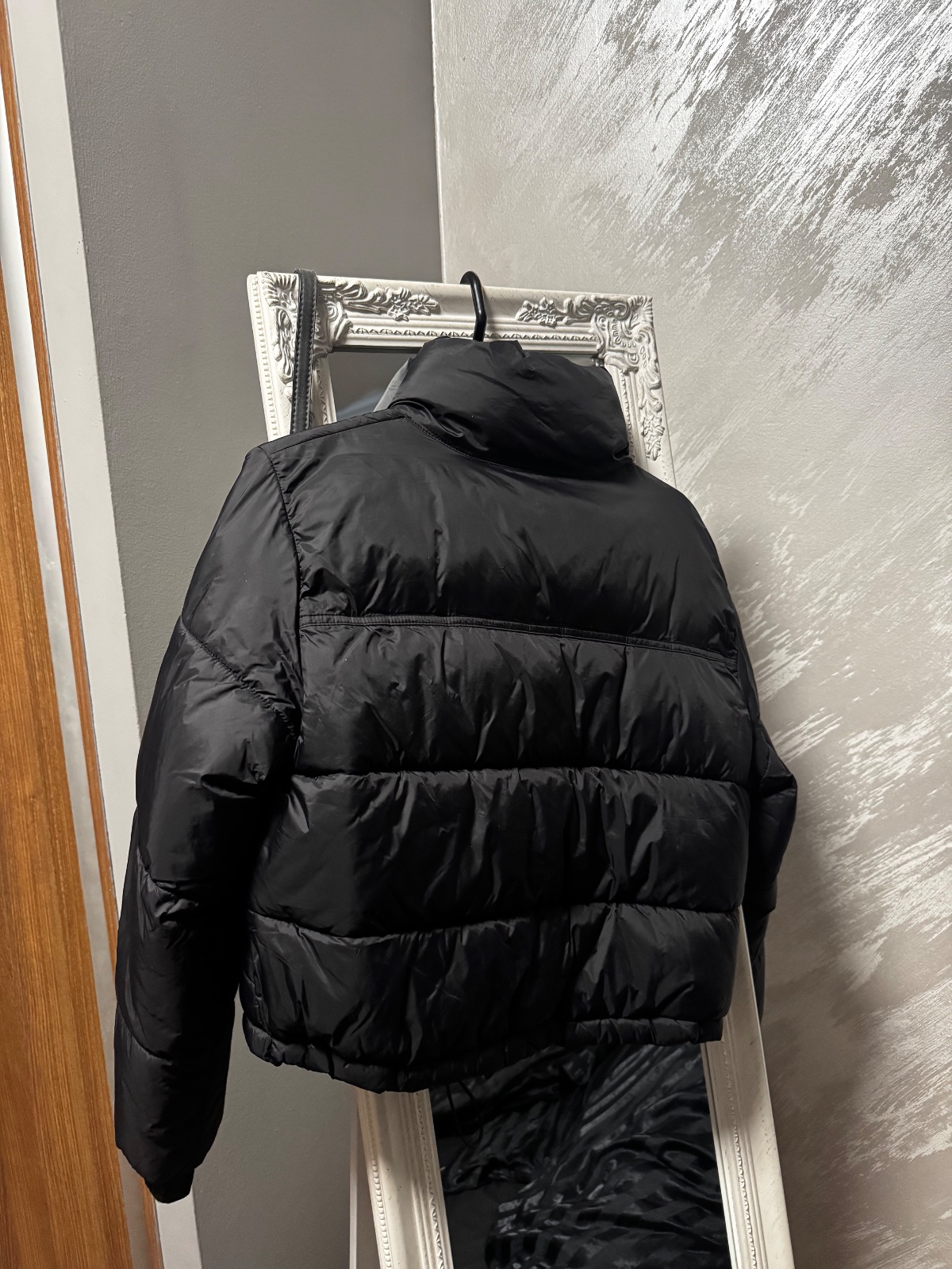 krásna, čierna farba, kapucna napevno, velkost S ale sedí aj na M, na páse sa dá stiahnut, málo nosena, bez chyby iba na pravom vrecku z vnutornej strany je uvolnena latka okolo cvoku, vid foto