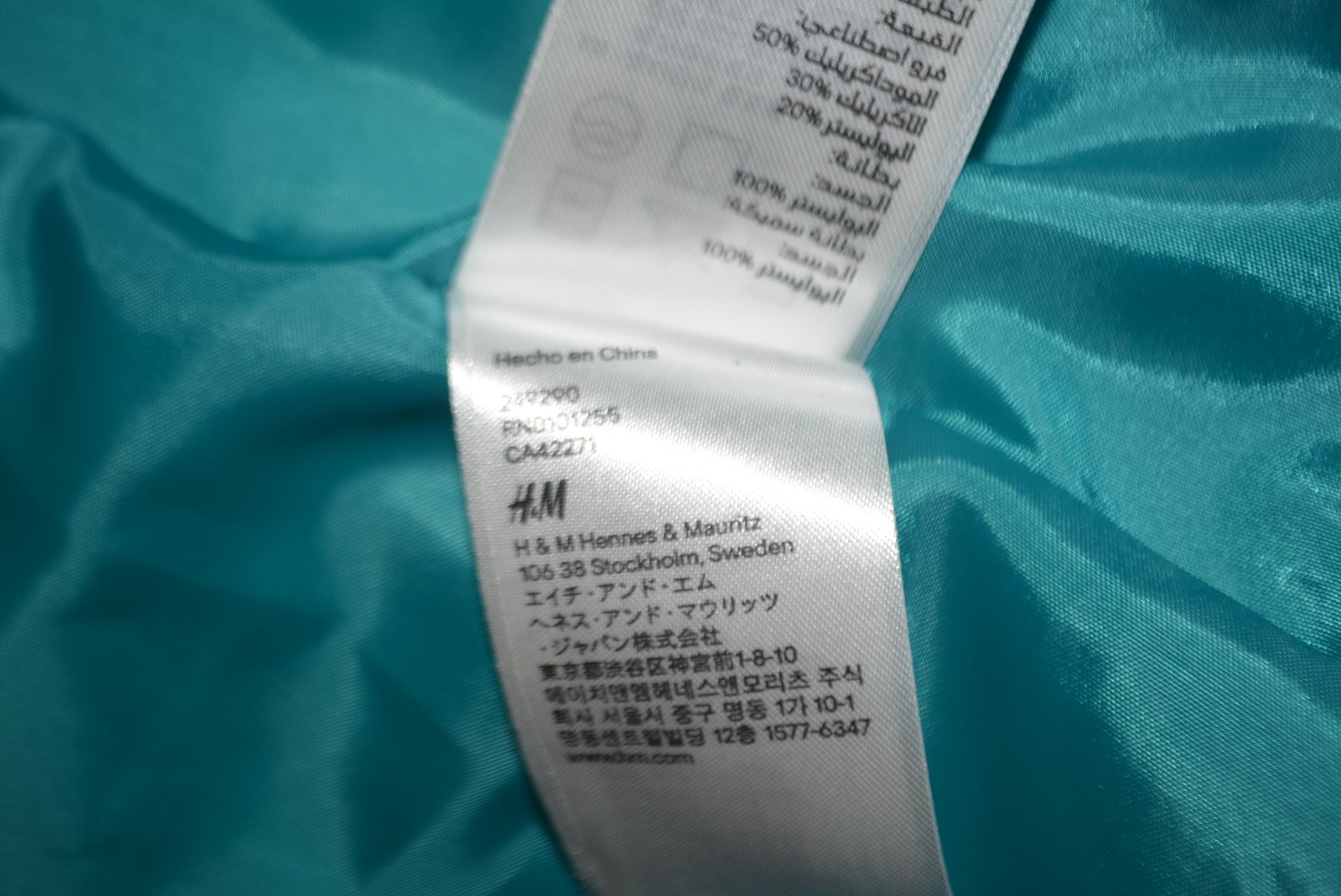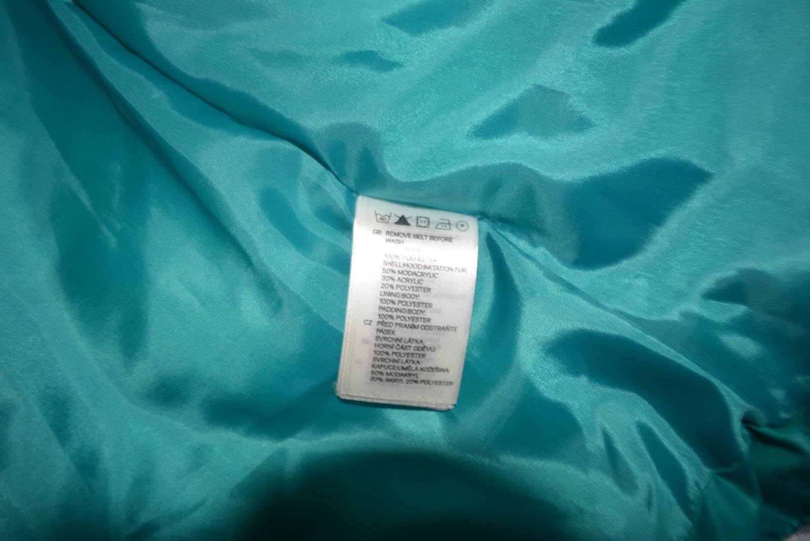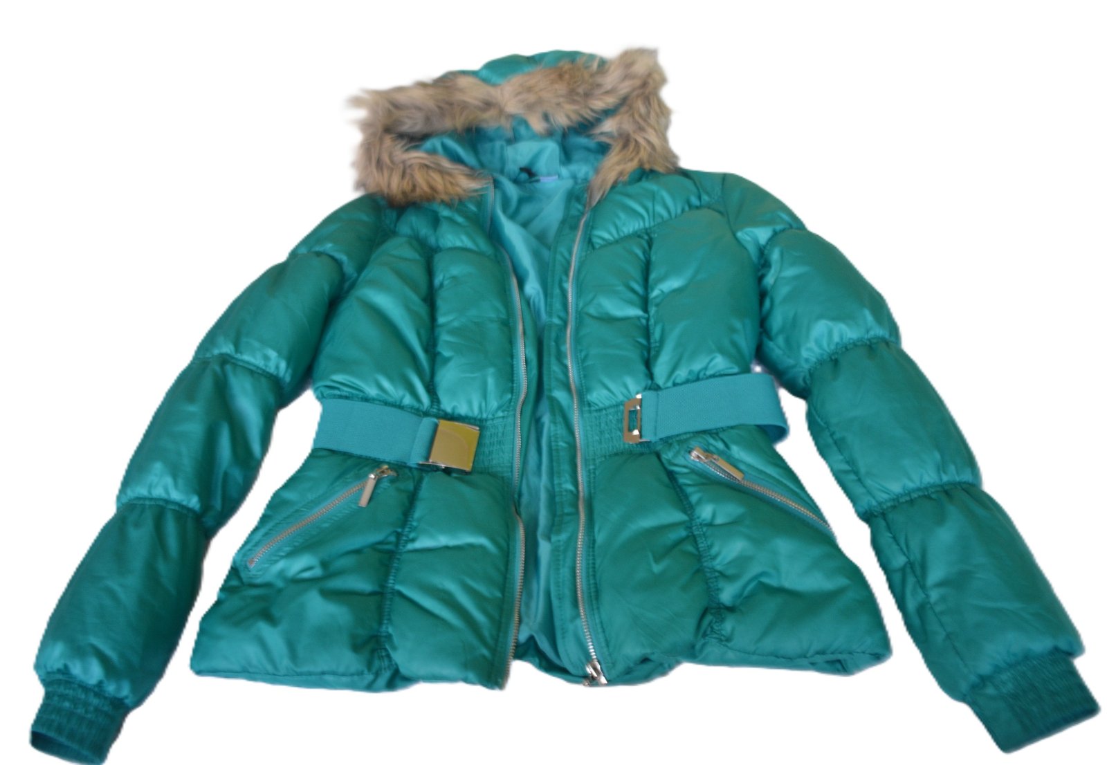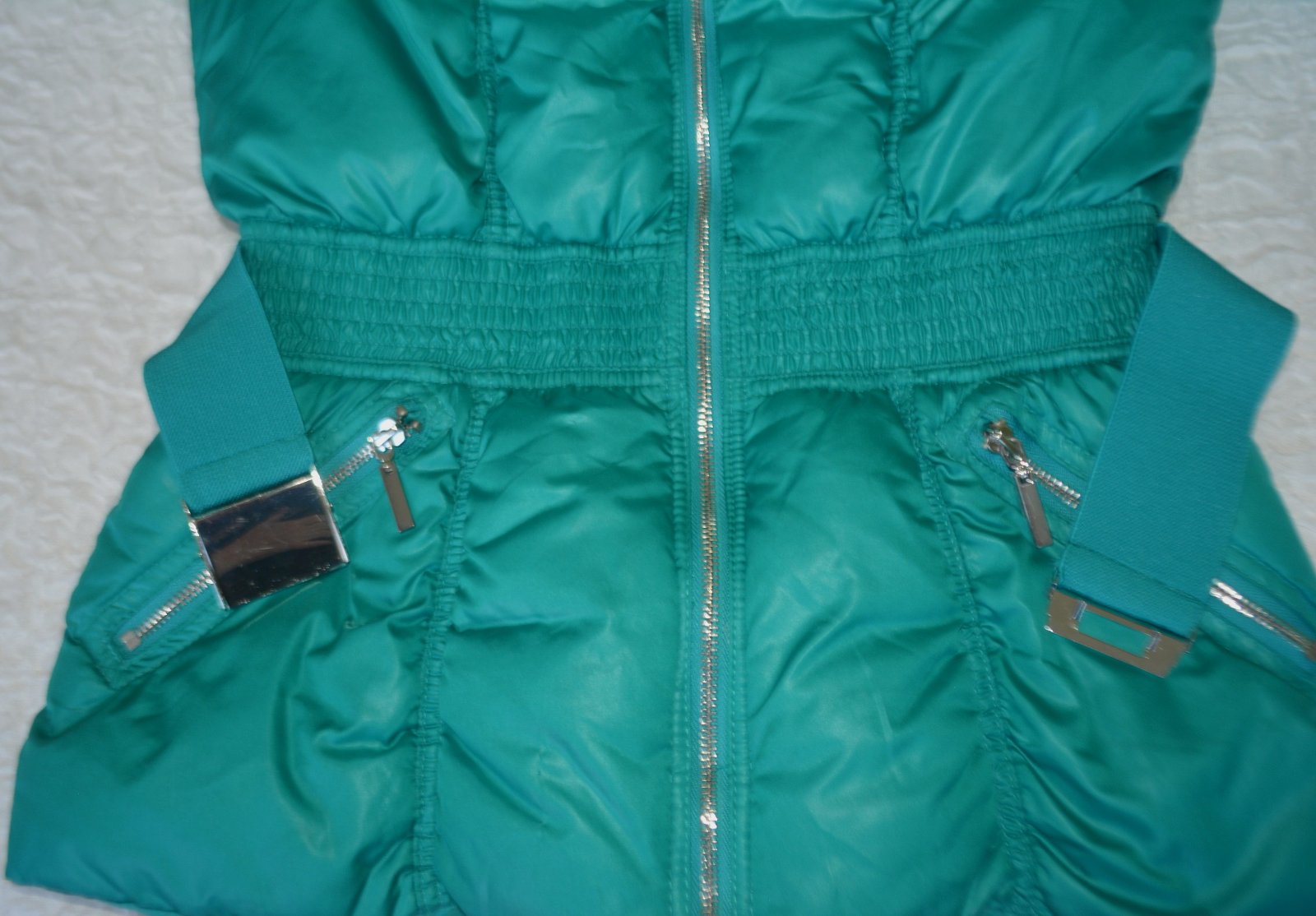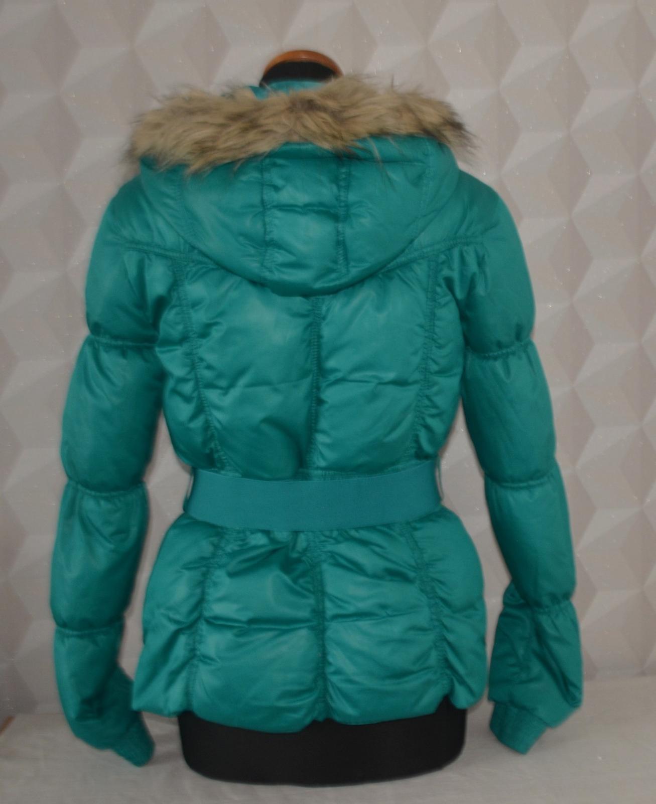 Dámska bunda na zimu z H&M, krásna zelená farba, veľ.38, rozmery: dlžka 64cm, pod pazuchami 2x46cm, rukáv od krku 76, od pleca 66 a od pazuchy 50cm.
