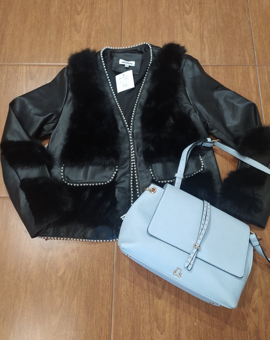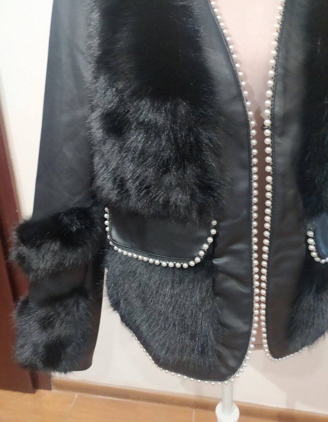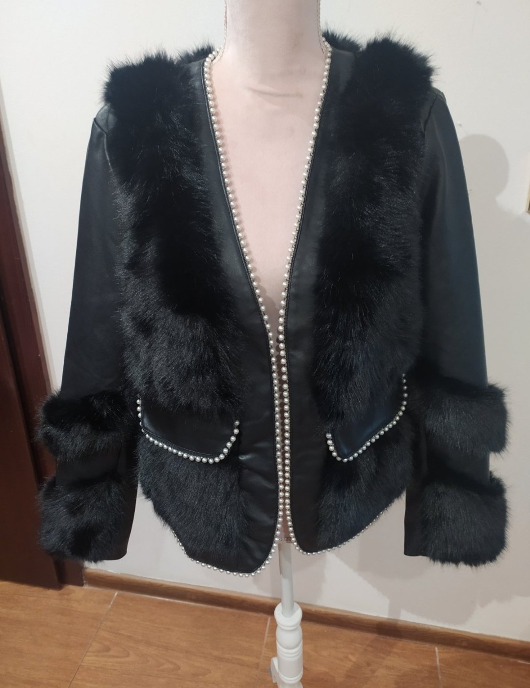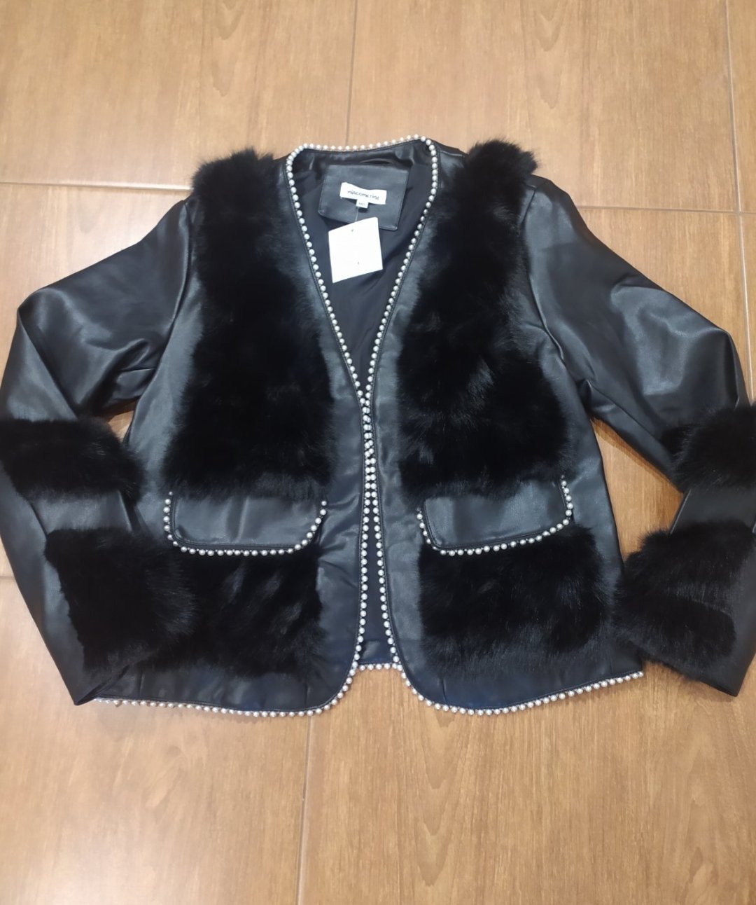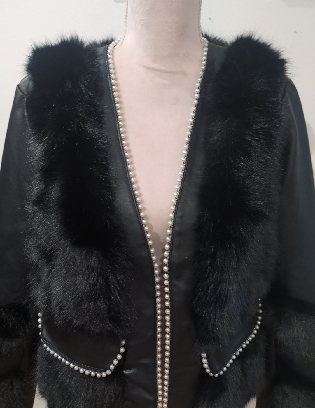 Luxusná koženkova bunda,z kombinovaná kožušinou,zdobená perličkami .Vpredu falošné vrecká,podsita ,na zapínanie.Vel uvedená M/L