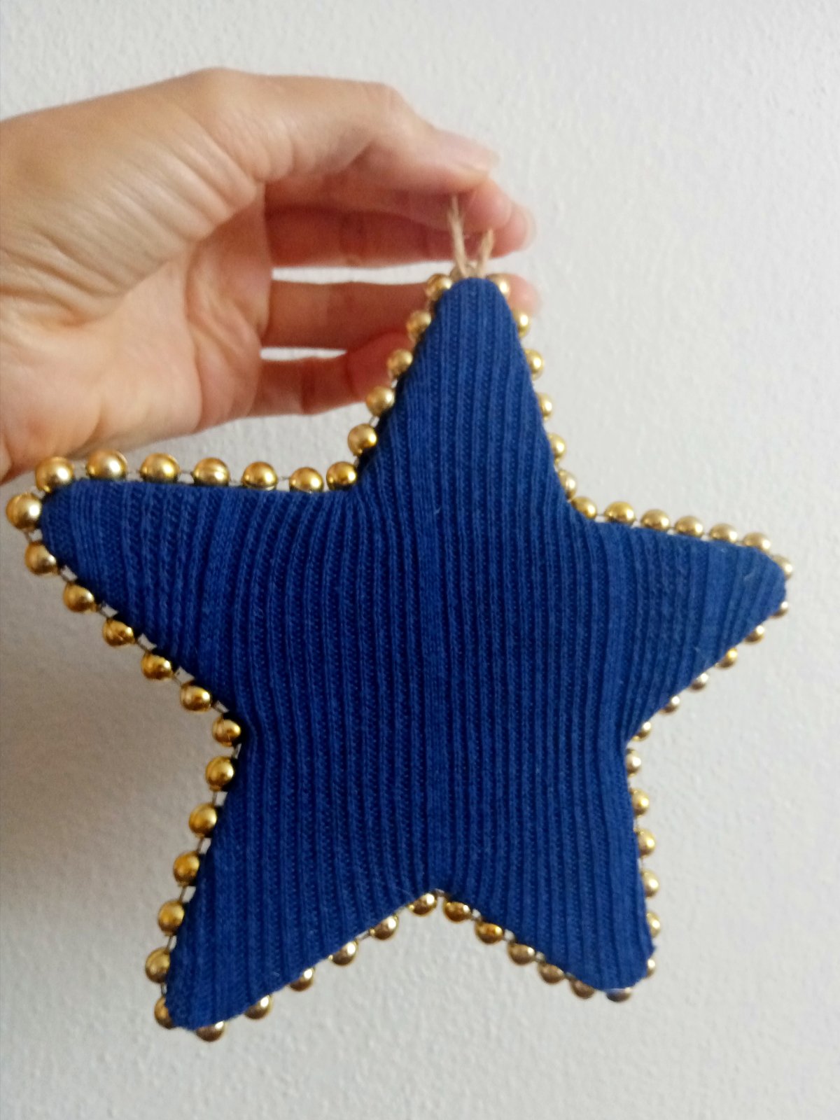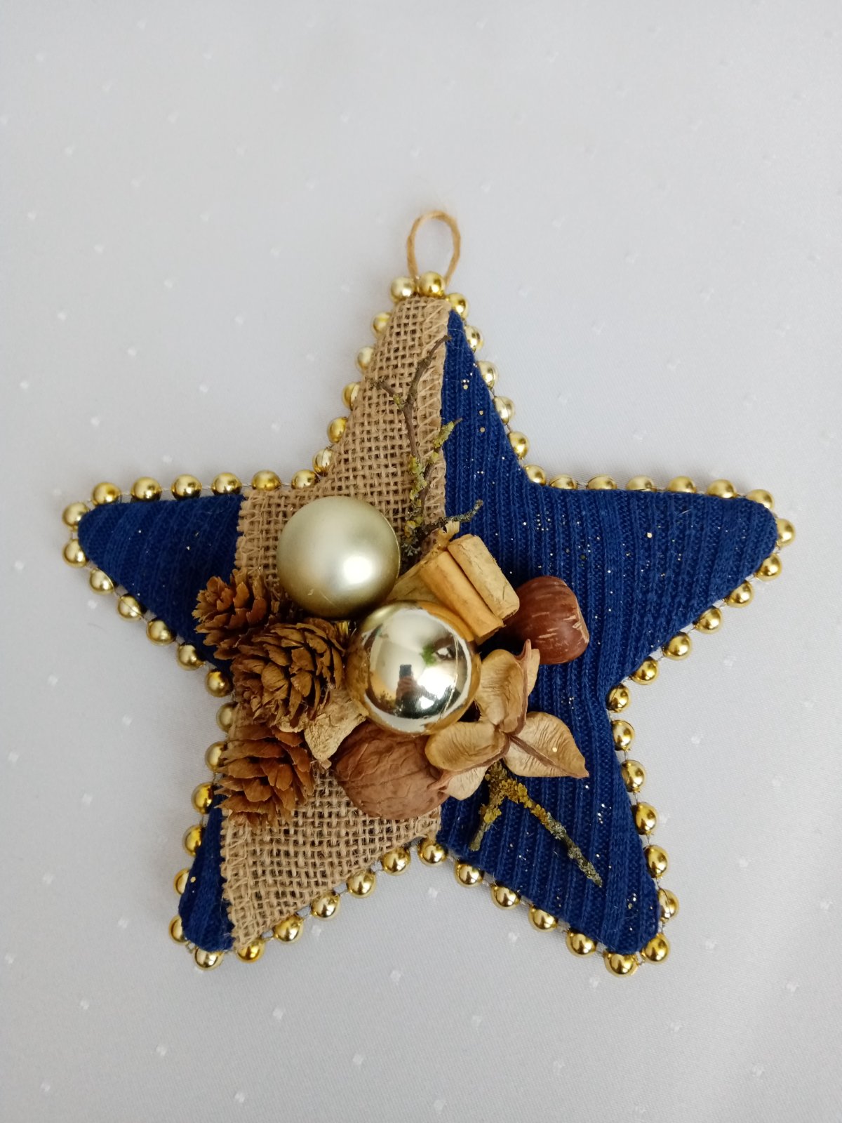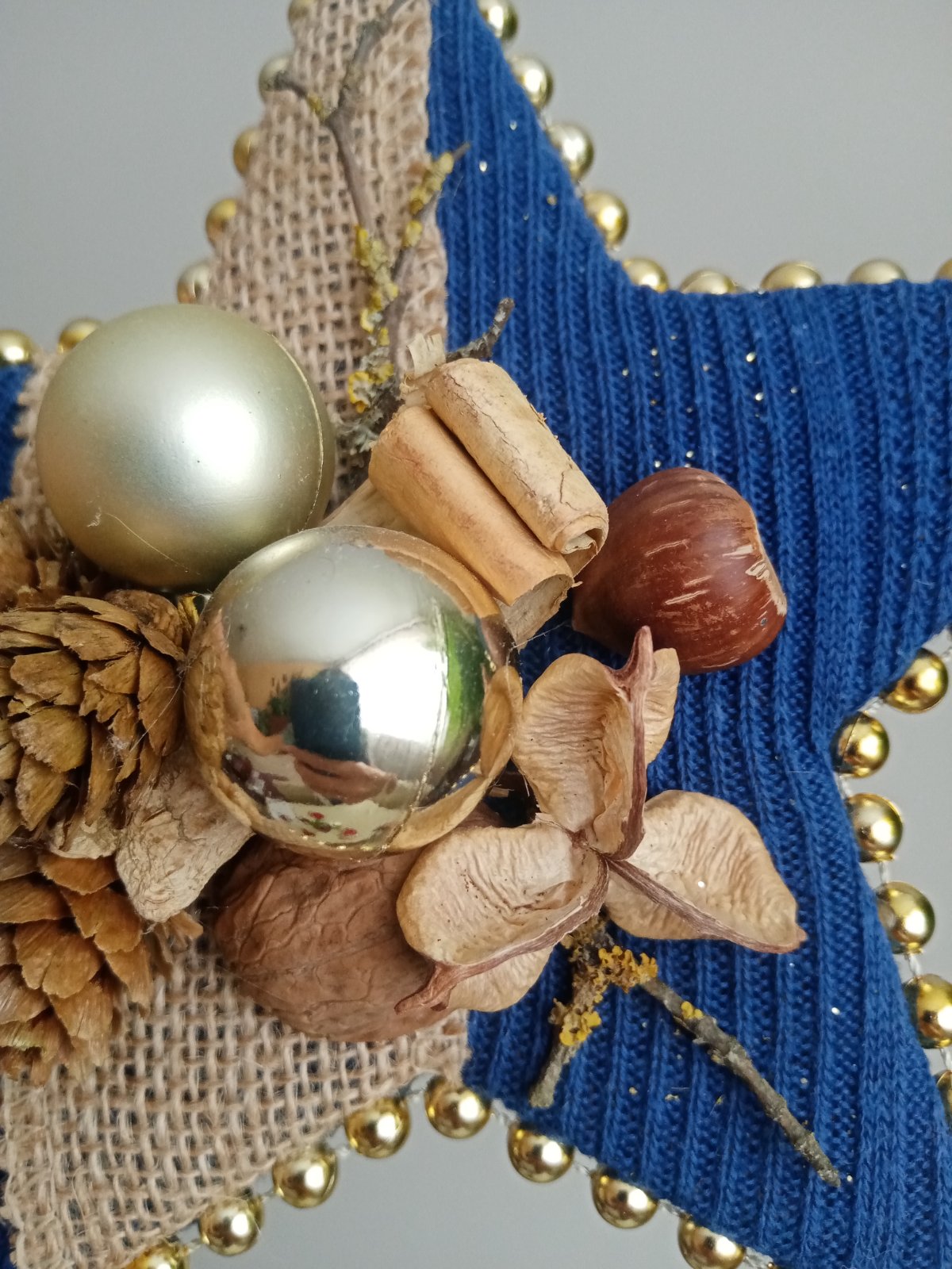 Závesná hviezda je vyrobená ručnou prácou z prevažne prírodných a recyklovaných materiálov, v elegantnej kombinácii tmavomodrej, hnedej a zlatej farby. Stačí ju zavesiť na dvere, na stenu, či okno a zútuľniť si tak domov počas vianočného obdobia.