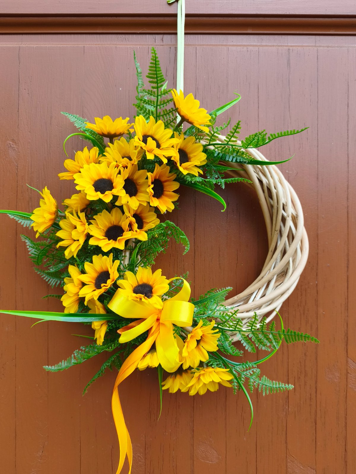Prútený základ zdobený umelými slnečnicami, priemer 30 cm.