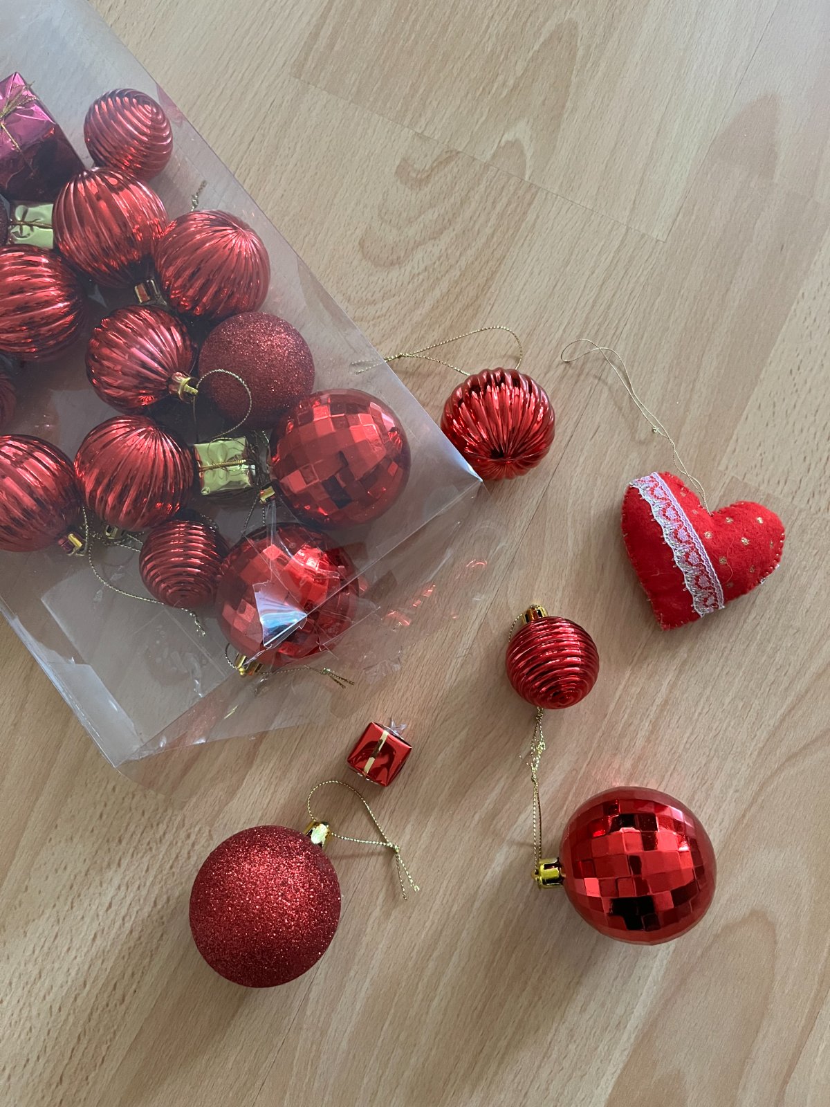 Sada vianočných ozdôb v červenej farbe.