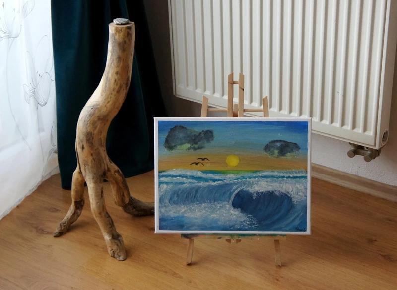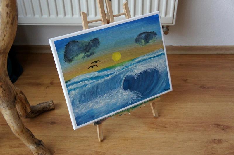 Predám ručne maľovaný obraz s motívom morskej vlny počas západu slnka. Maľované akrylom na plátne.