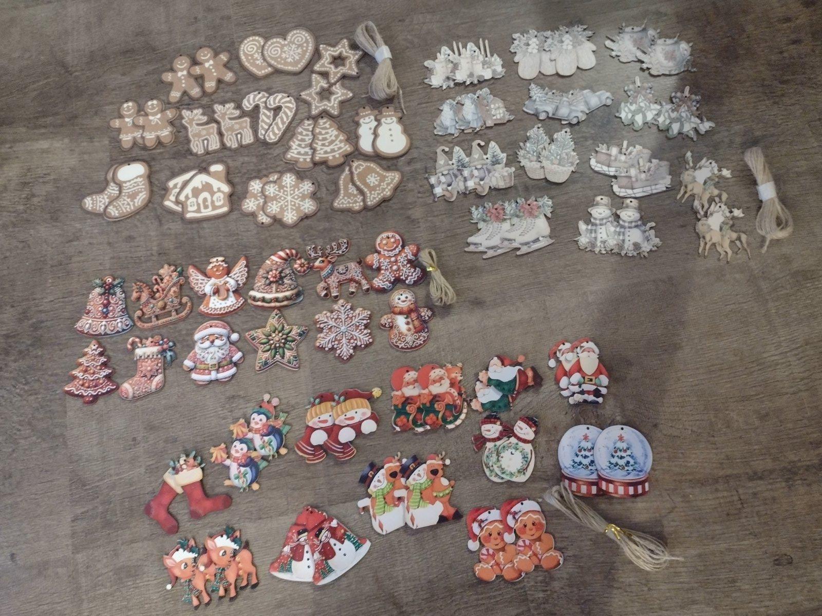 Drevené ozdoby v ľavo perničky počet kusov 24 cena 3eura. V pravo ozdoby 24ks cena 3eura. Perničky v strede počet ks 12 cena 2eura. Dolu ozdoby 24ks cena 3eura. Všetko spolu cena 10 eur.
