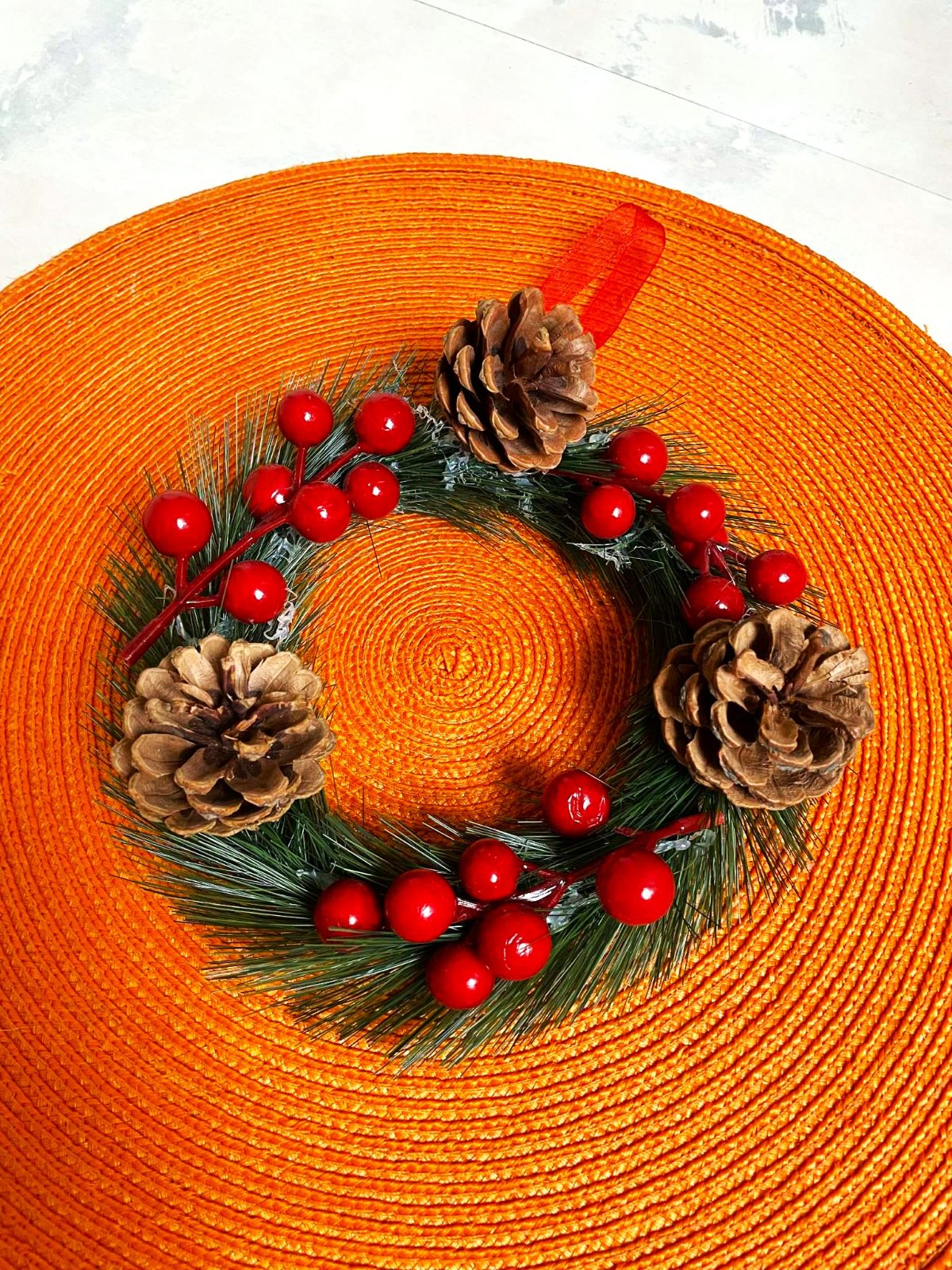 netuctový vianočný venček,vhodný na stôl alebo na zavesenie na dvere,priemer cca 18 cm,použitý na 1 Vianoce,výborne vyzerá aj v strede stola a uprostred sviečka