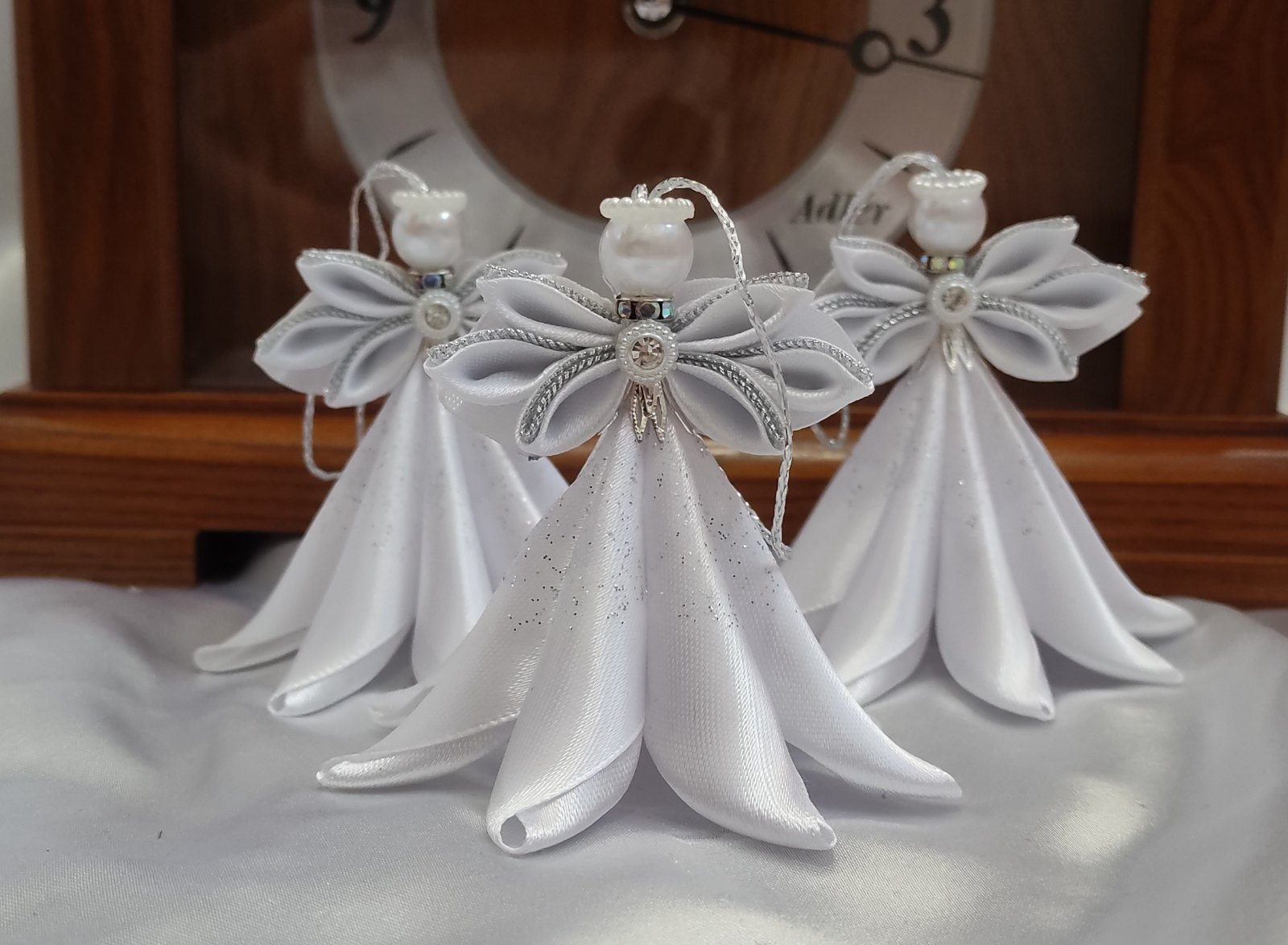 Tento elegantný anjel vyrobený z jemnej saténovej a organzovej stuhy je dokonalým doplnkom vašej vianočnej výzdoby.