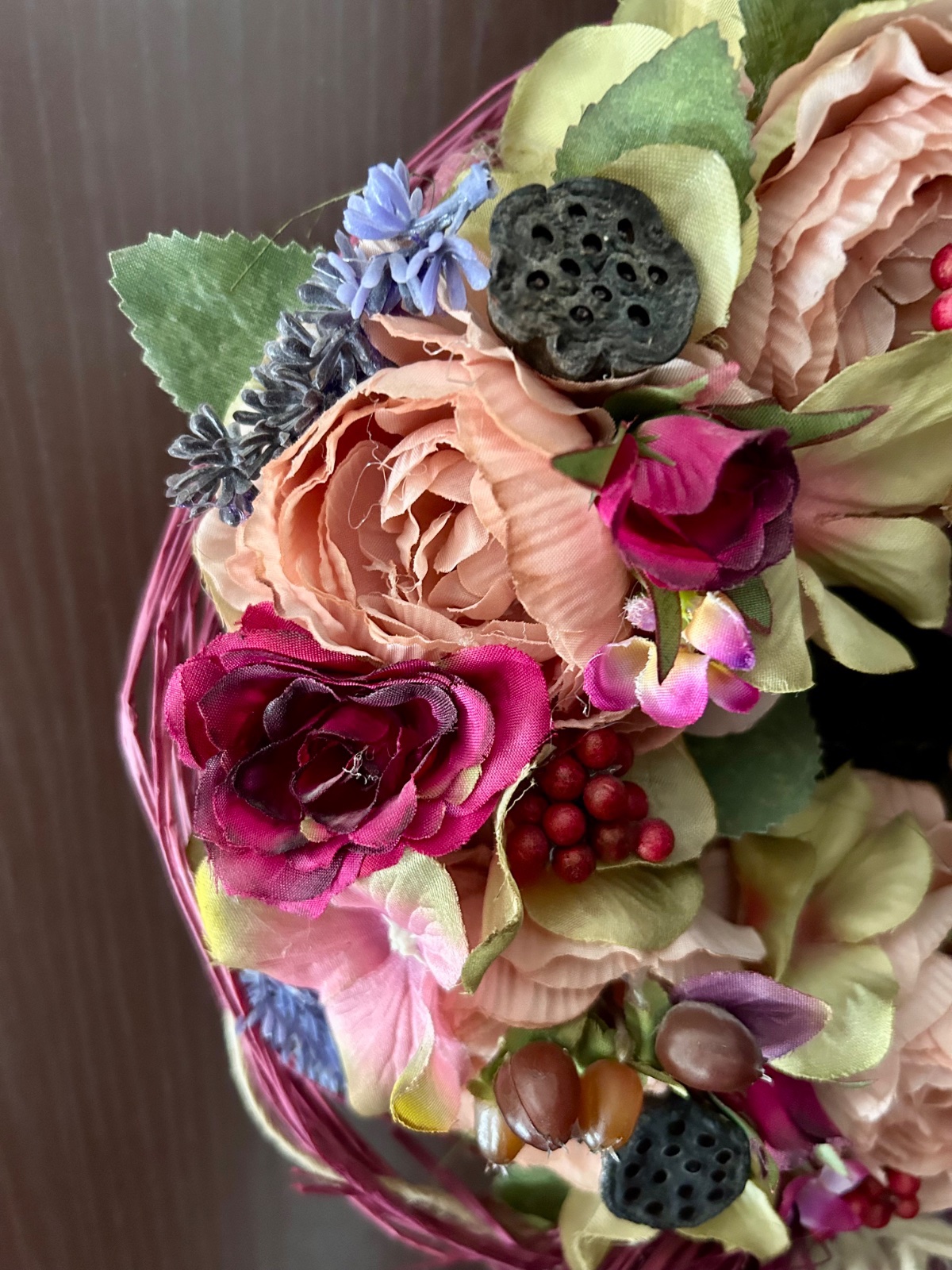 Predám celoročnú dekoráciu na dvere z pestrofarebných sušených kvetov, priemer 25 cm.