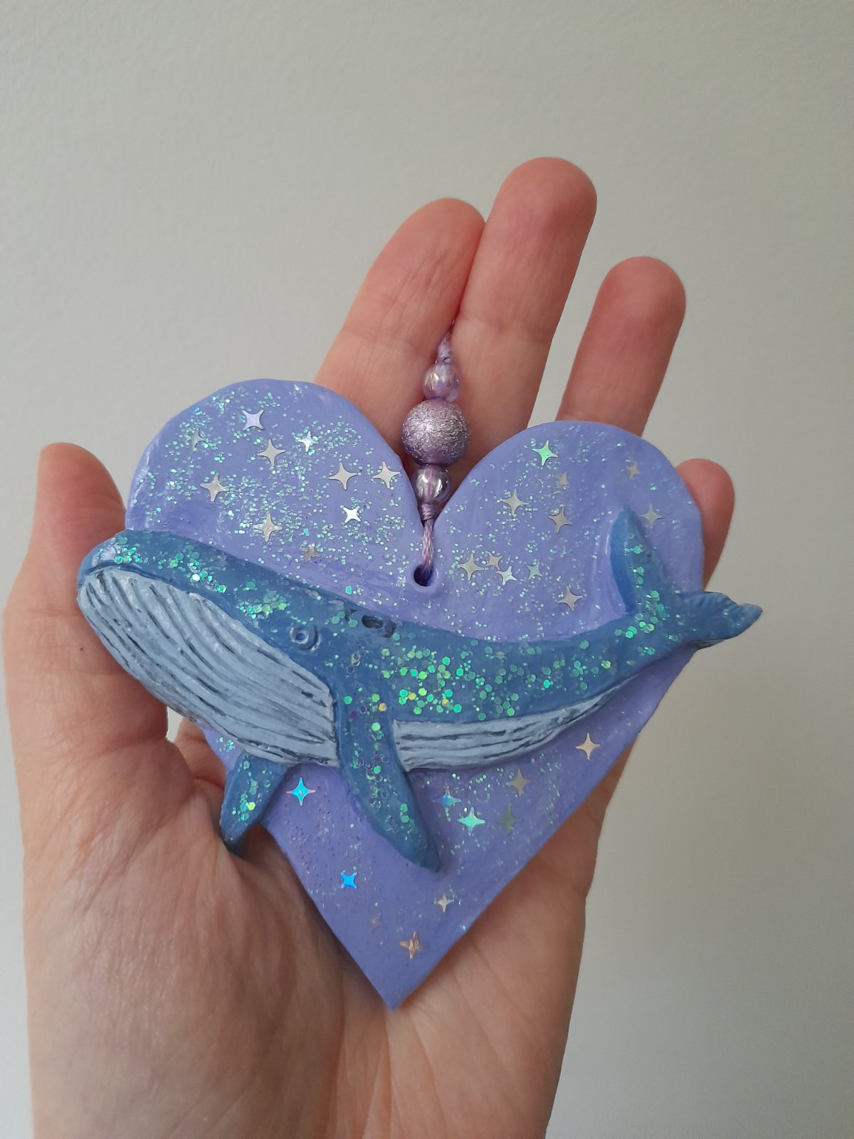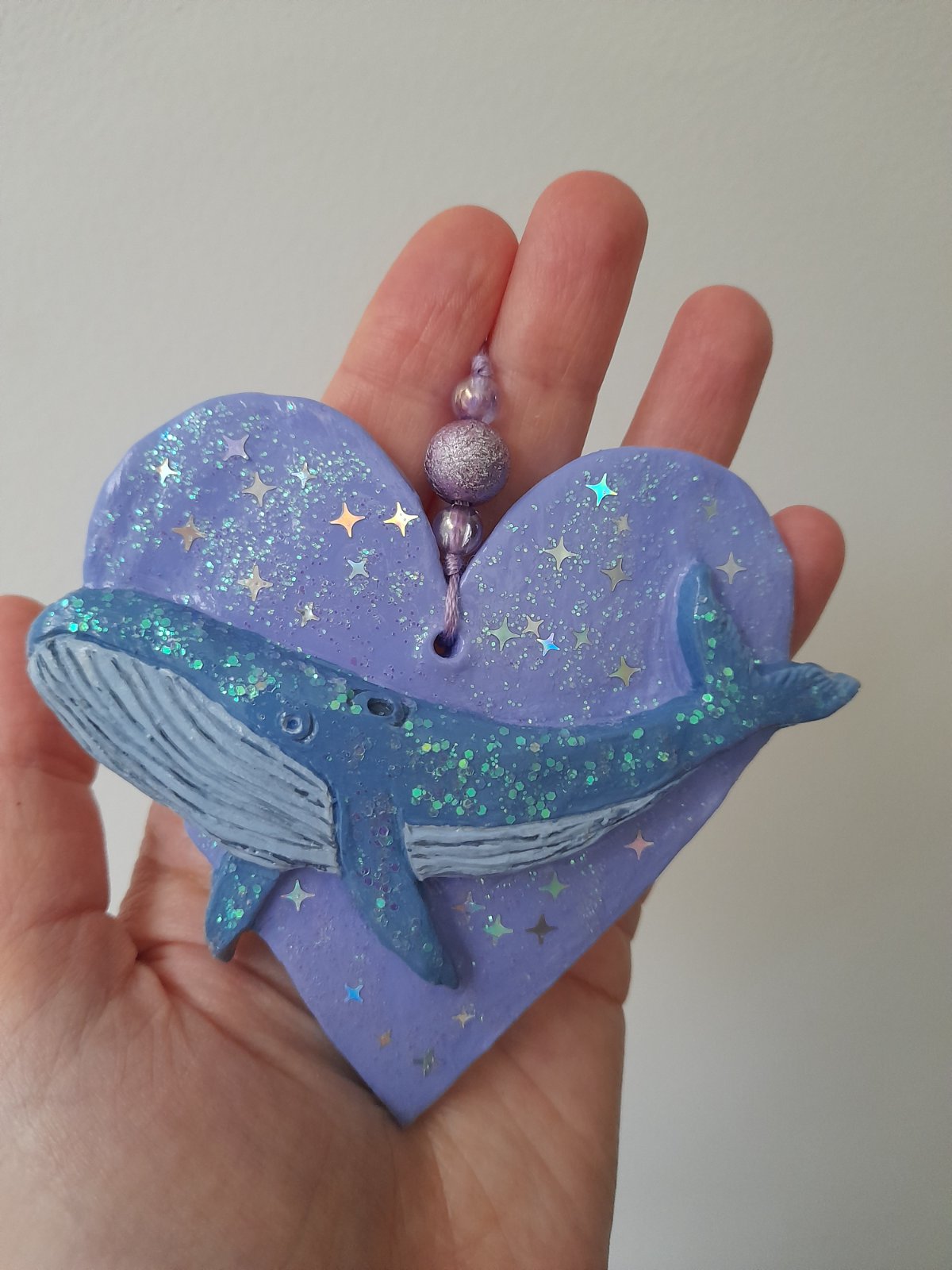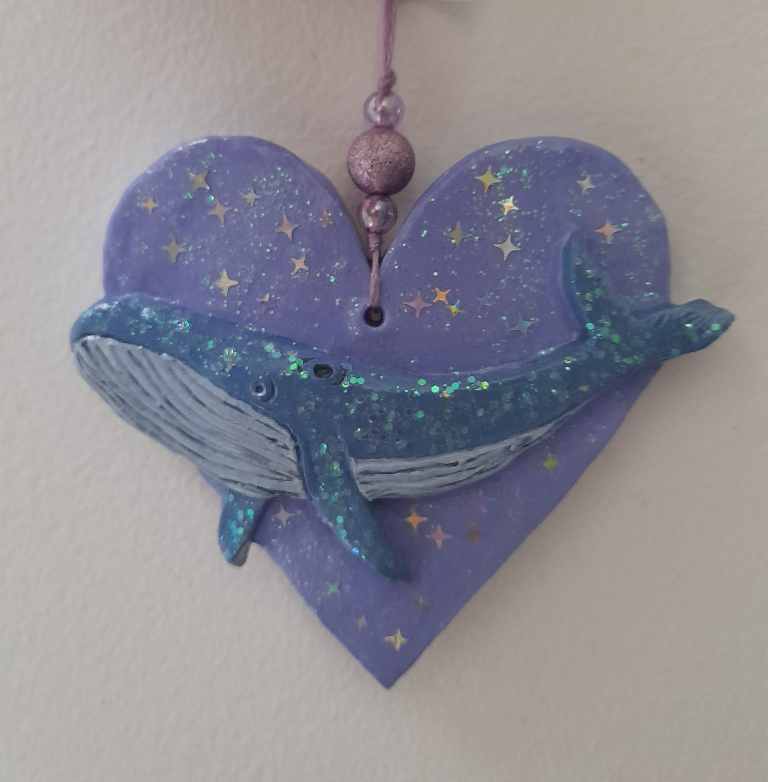 Srdce s veľrybkou. Závesná handmade dekorácia vyrobená zo samotvrdnúcej hliny. Maľovaná akrylom. Ošetrená lakom.
