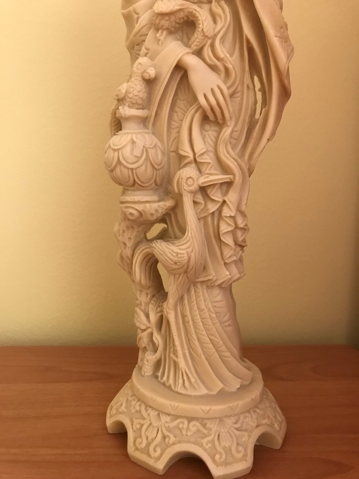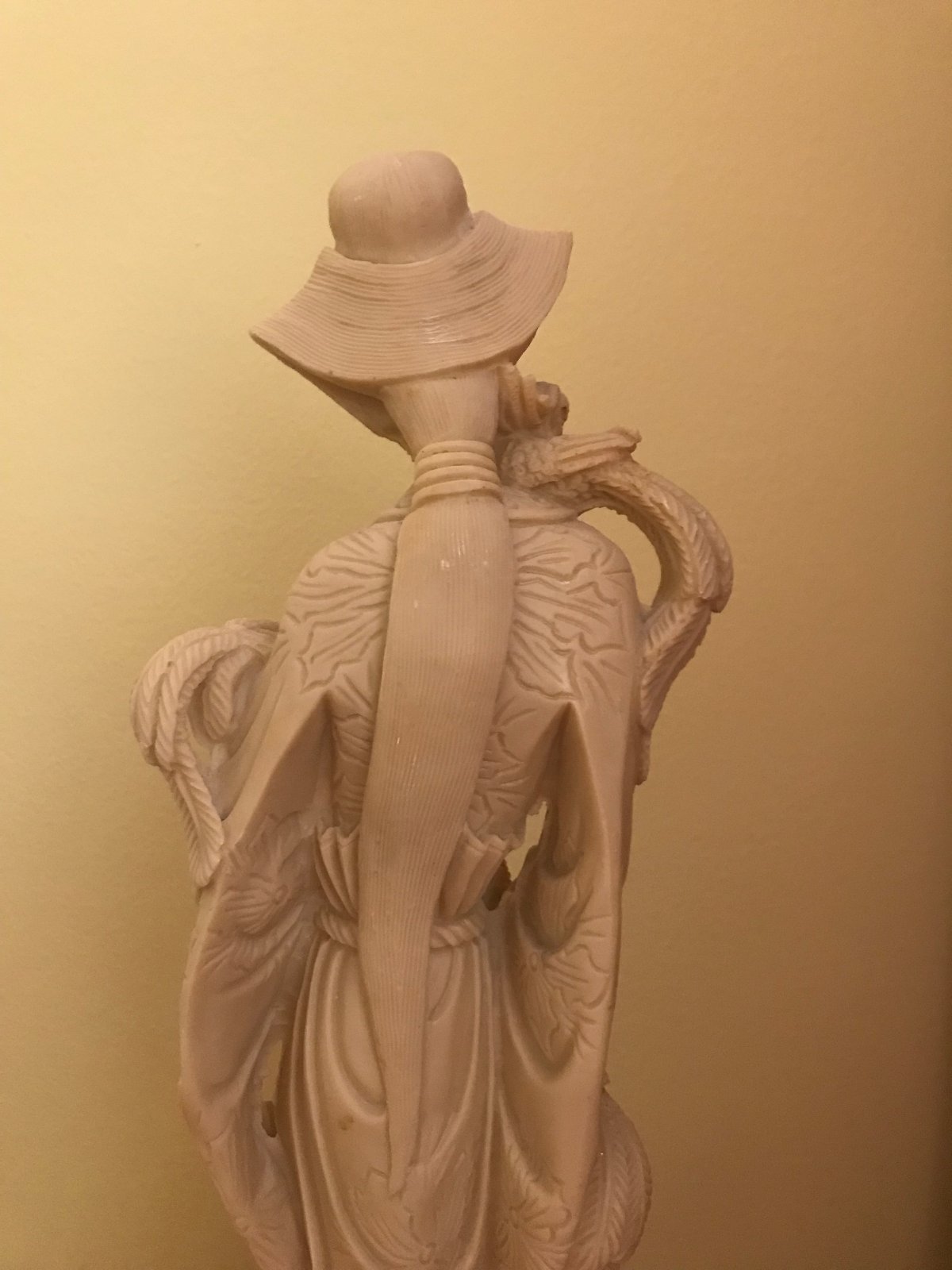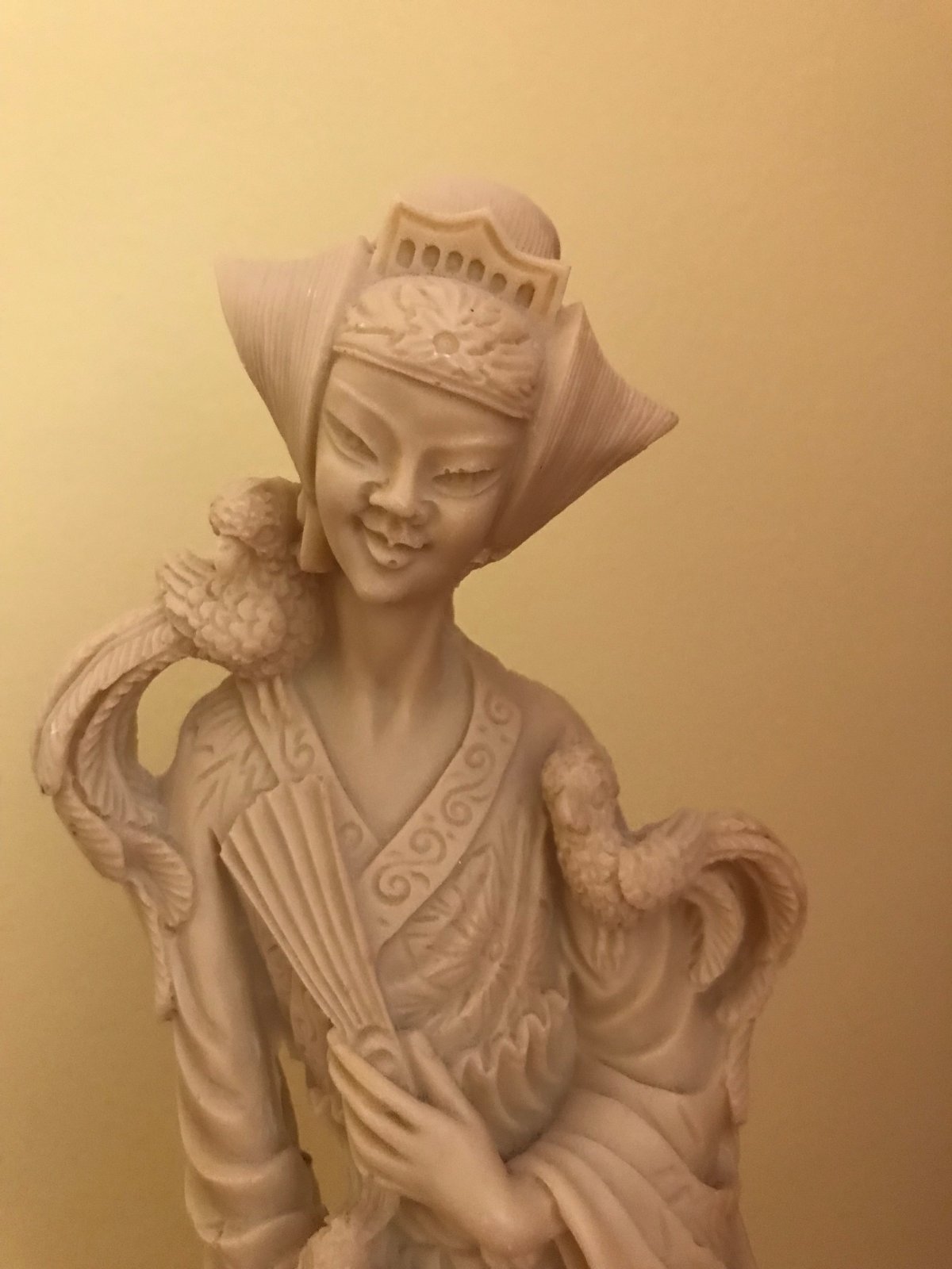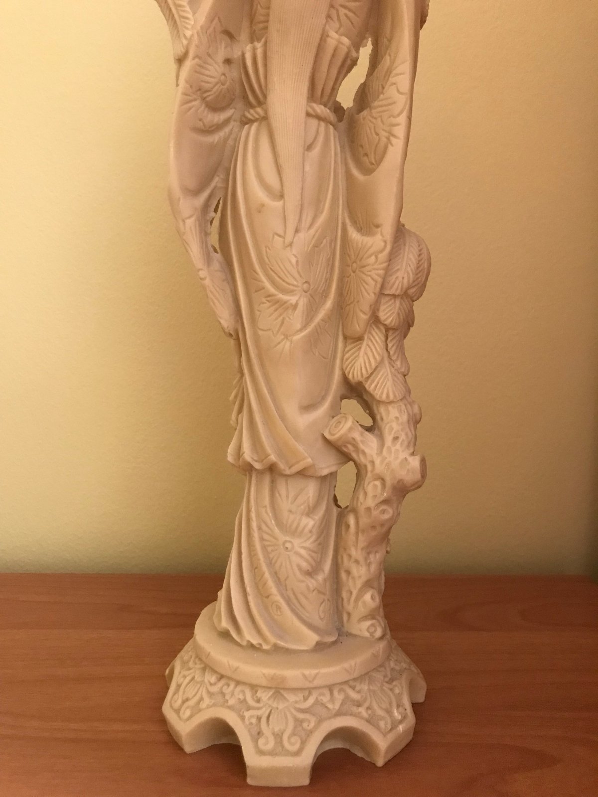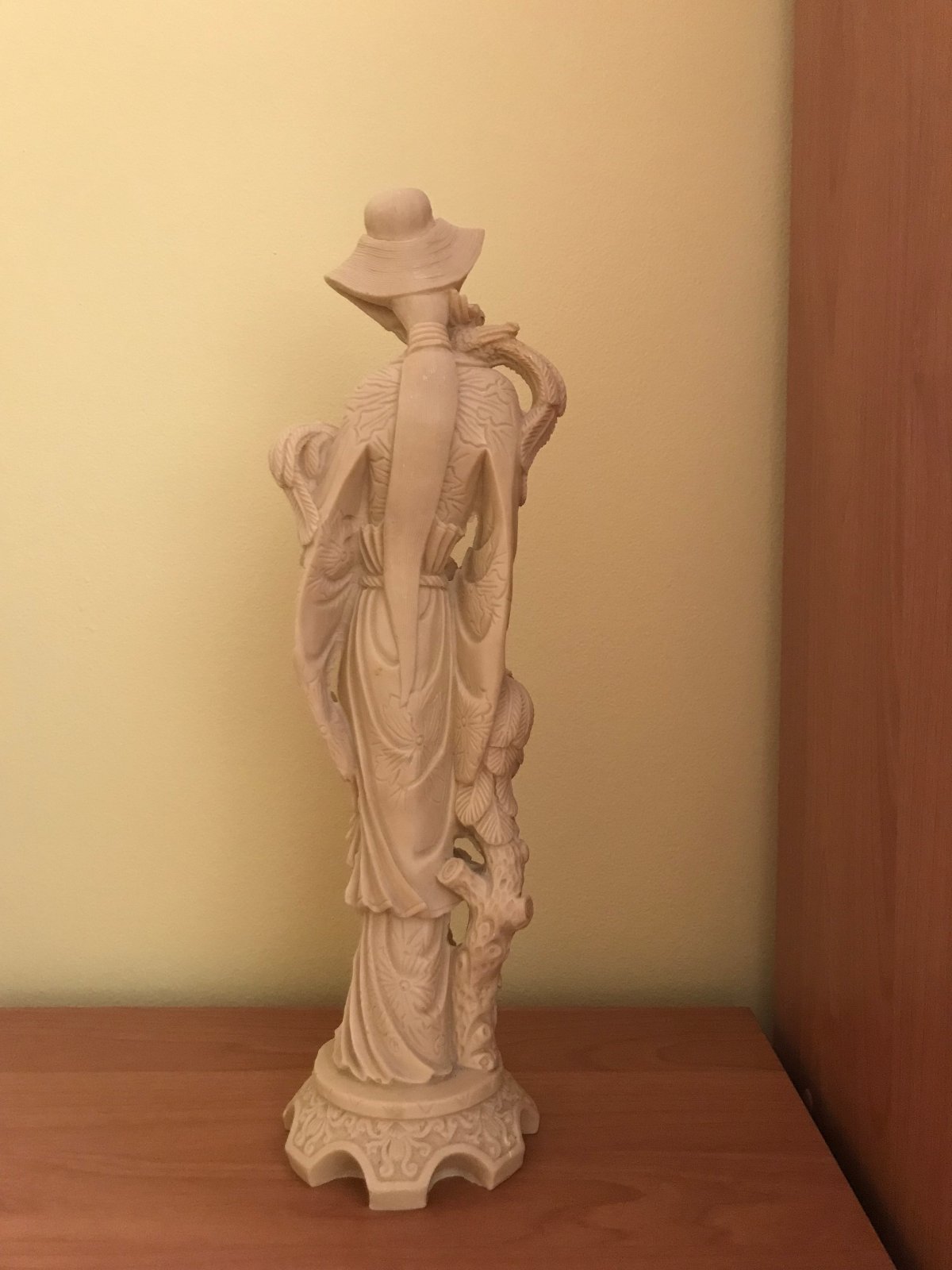 Dekoračná soška z 80. rokov; materiál: imitácia slonoviny, o aký konkrétny materiál ide neviem. Detaily sú veľmi precízne spracované. Rozmery: výška - 36 cm; priemer podstavca - 10 x 11 cm. Bez vád.