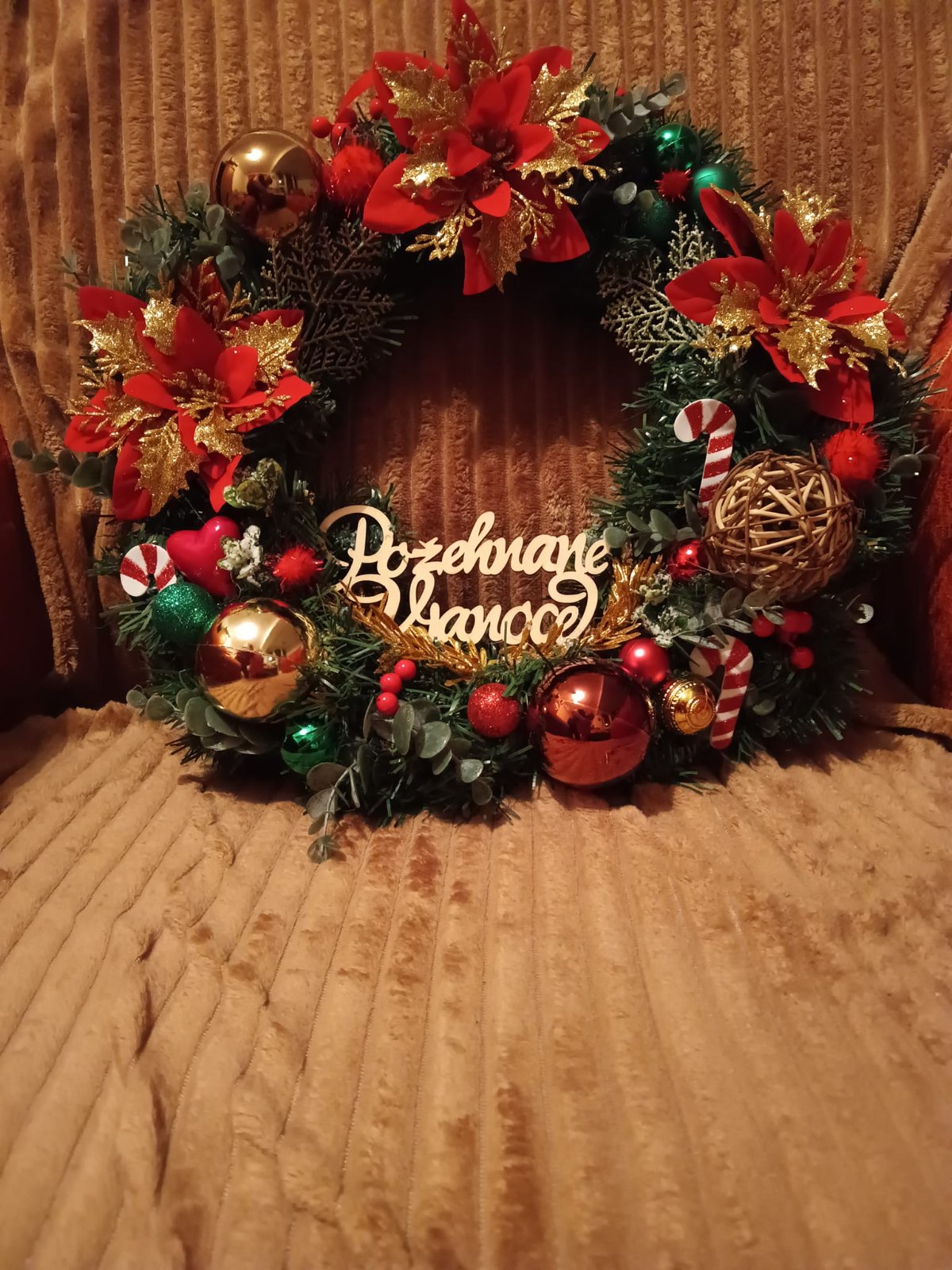 PREDAM veniec na dvere s ružami a napisom Požehnane Vianoce priemer 38cm,,Cena 28e +poštovne.PLATBA VOPRED ,NA DOBIERKU NEPOSIELAM