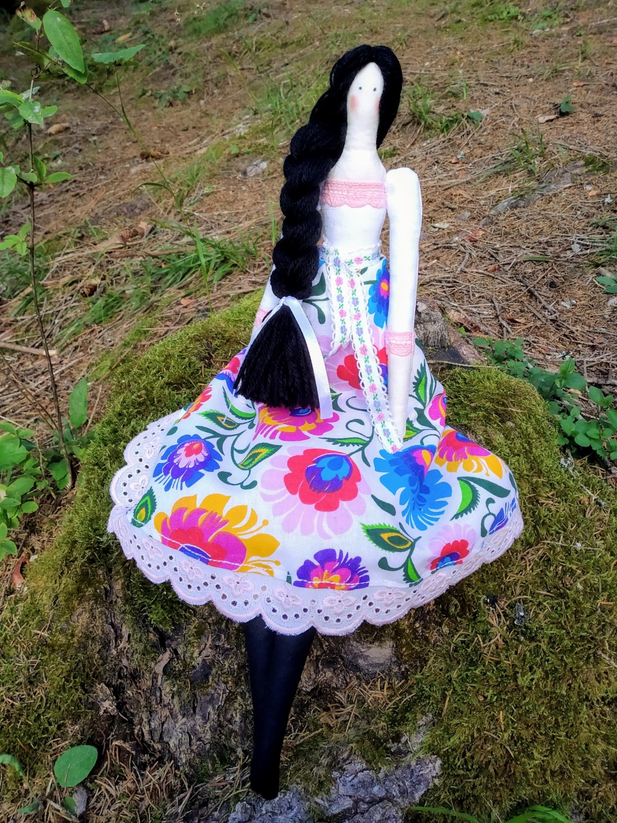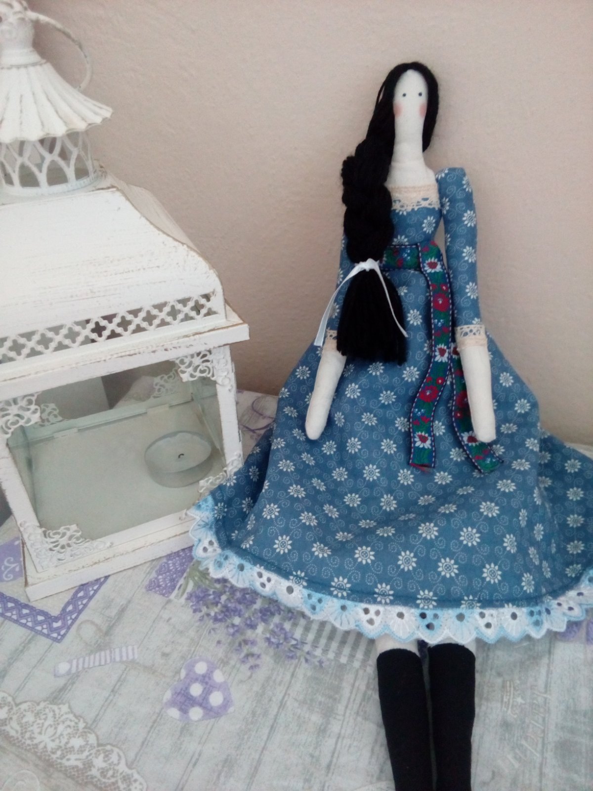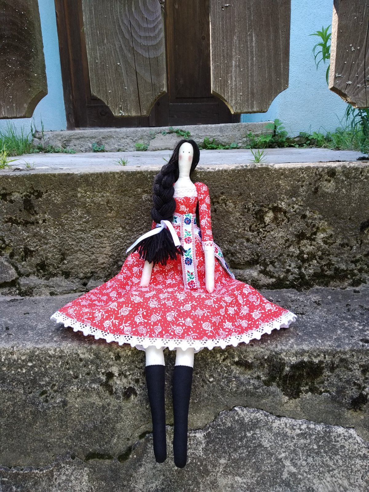 Ušitá z bavlnených látok..výplň duté vlákno..má aj spodničku a pantofoe..krásny darček..doplnok..šaty vo folklornom štýle ..usijeem do týždňa