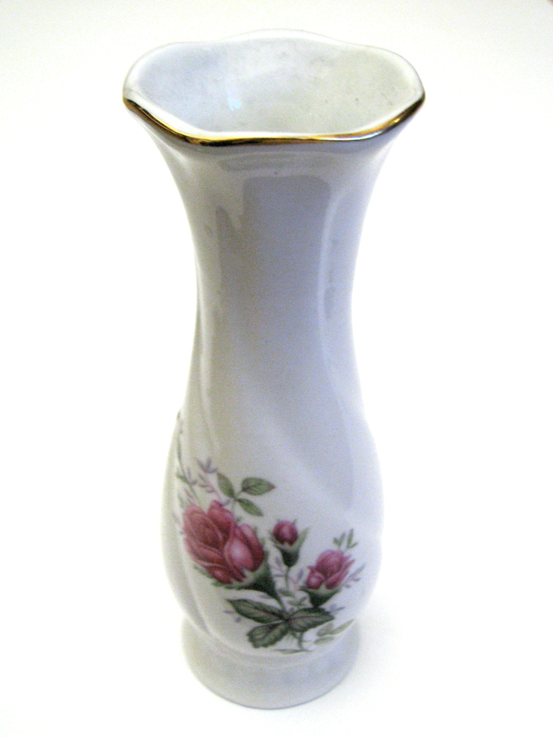 Menšia vázička z porcelánu, s obrázkom ruží a zláteným okrajom. Výborne zachovalá, bez poškodení. V prípade záujmu odmeriam.