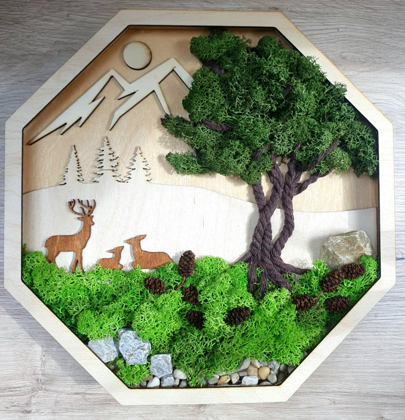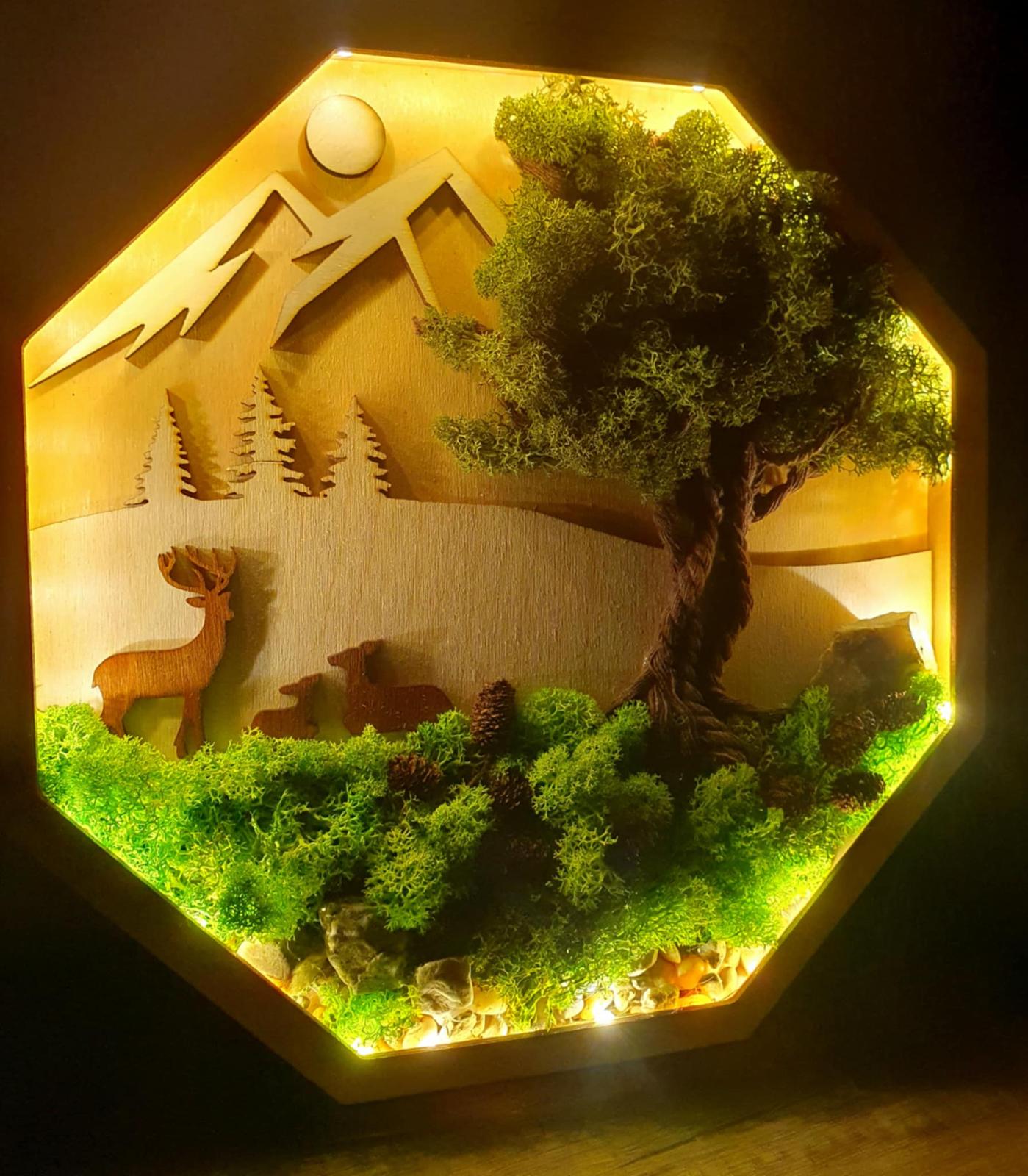 Vneste kúsok prírody k sebe domov! Ručne vyrábaný 3D obraz v elegantnom osemuholníkovom ráme spája stabilizovaný mach, prírodné kamienky, drevené siluety jeleňov a hôr. LED podsvietenie dodáva obrazu teplú a útulnú atmosféru. Perfektný ako dekorácia do obývačky, spálne alebo kancelárie.