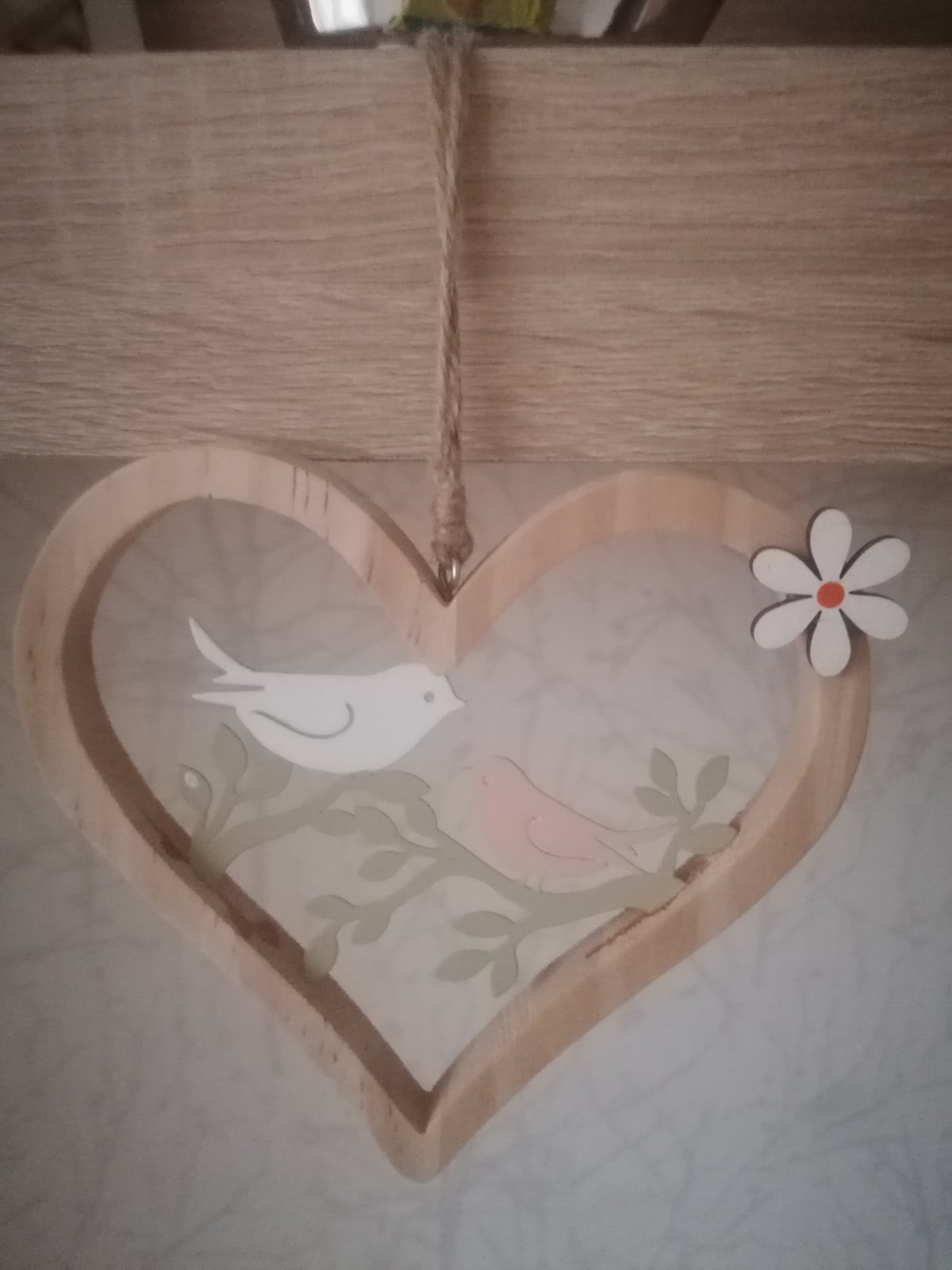 Záves srdce je vyrobený z prírodného dreva a zdobený farebnými vtáčikmi.