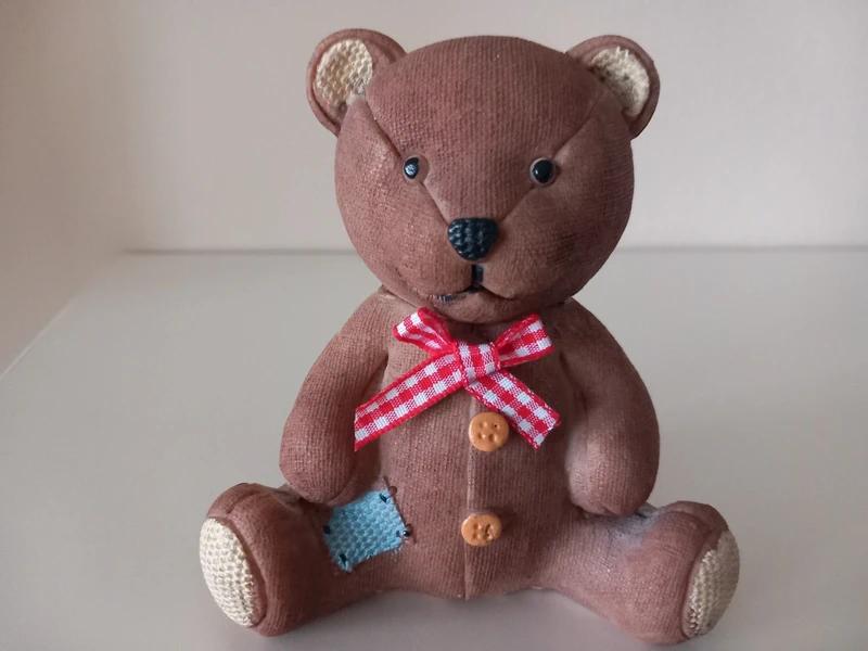 Starý sediaci medvedík vyprataný po mamine, v retro mierne šúchanom vzhľade, keramika/matný vzhľad, slúžiaci aj ako pokladnička - na chrbte otvor na vhadzovanie mincí a zospodu gumená zátka na ich vybratie. Rozmer: výška 11,5-12 cm x šírka 10 cm x hĺbka 7 cm