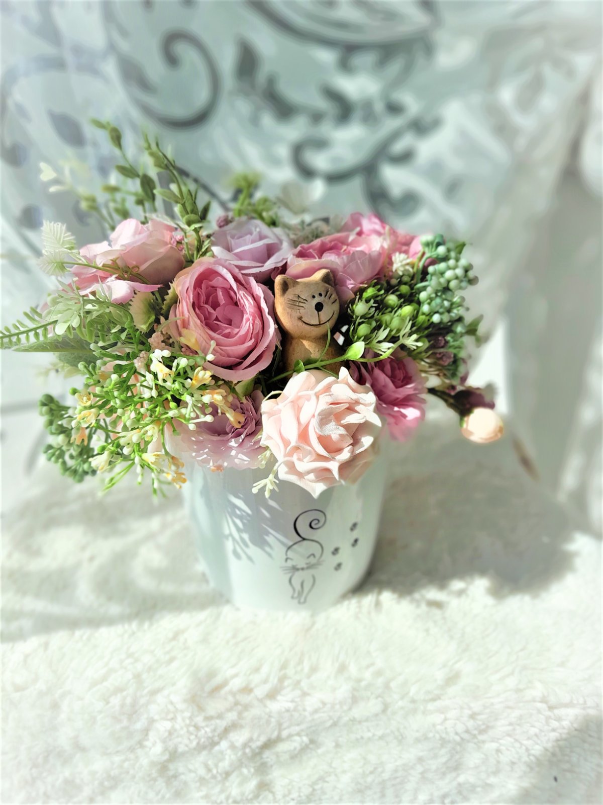 aranžmánikv keramickom črepníku-doplnený hlinenou mačičkou,bohato zdobený-rozmer 22x22cm...merané-od-do..kuk aj na iné moje inzeráty
