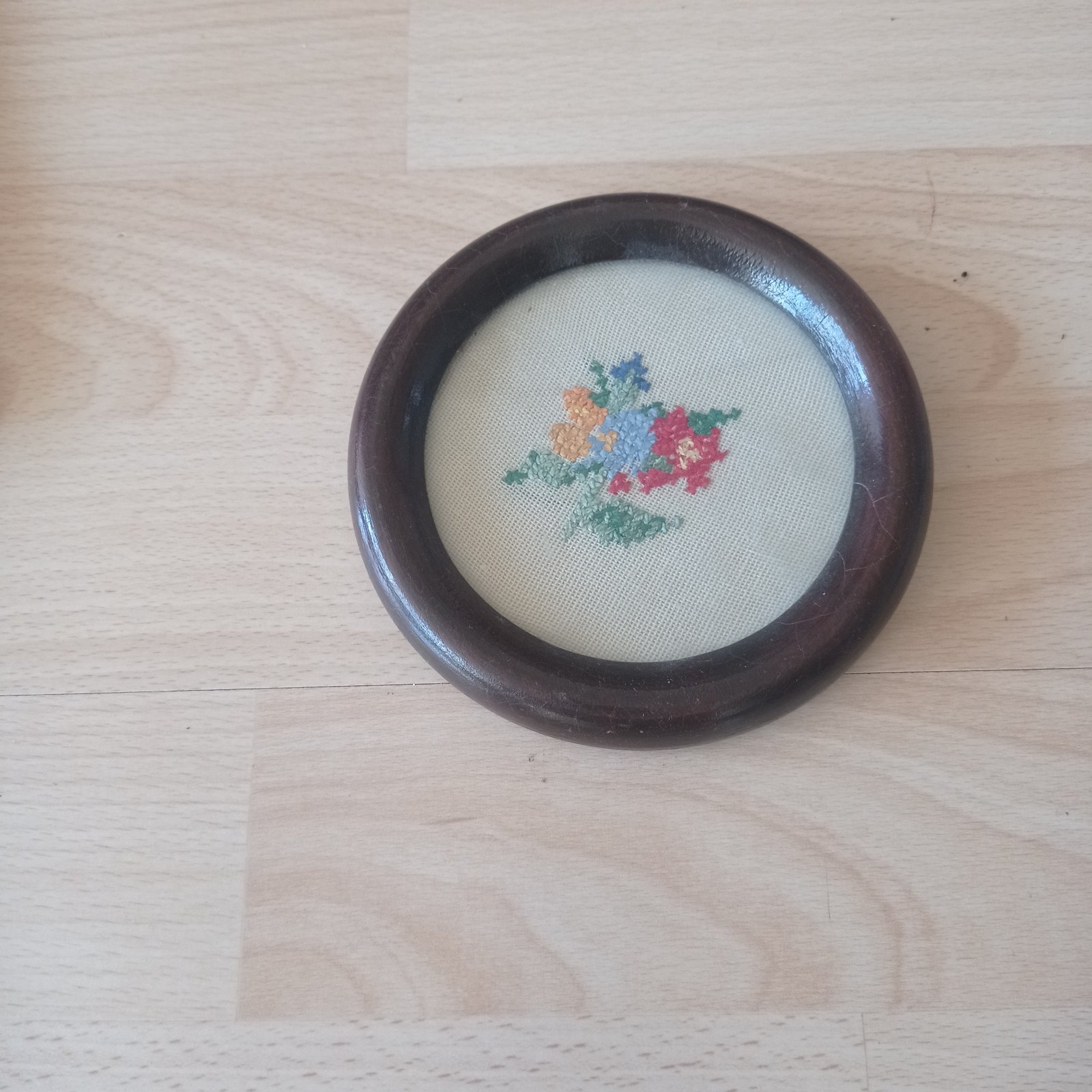 Obrazy rucne vysivane. 25,7 x 13,7 cm. 13 cm priemer okruhleho.