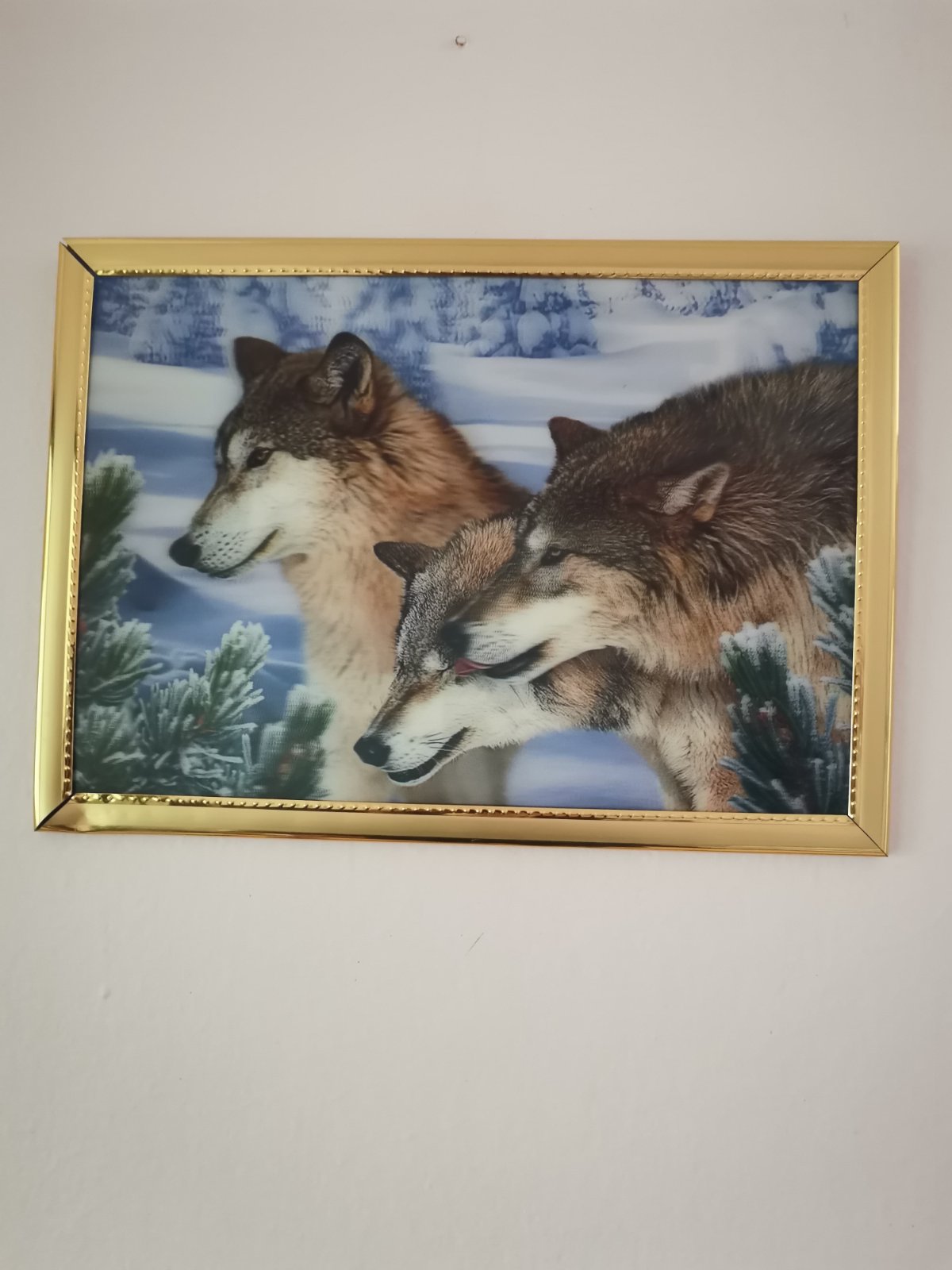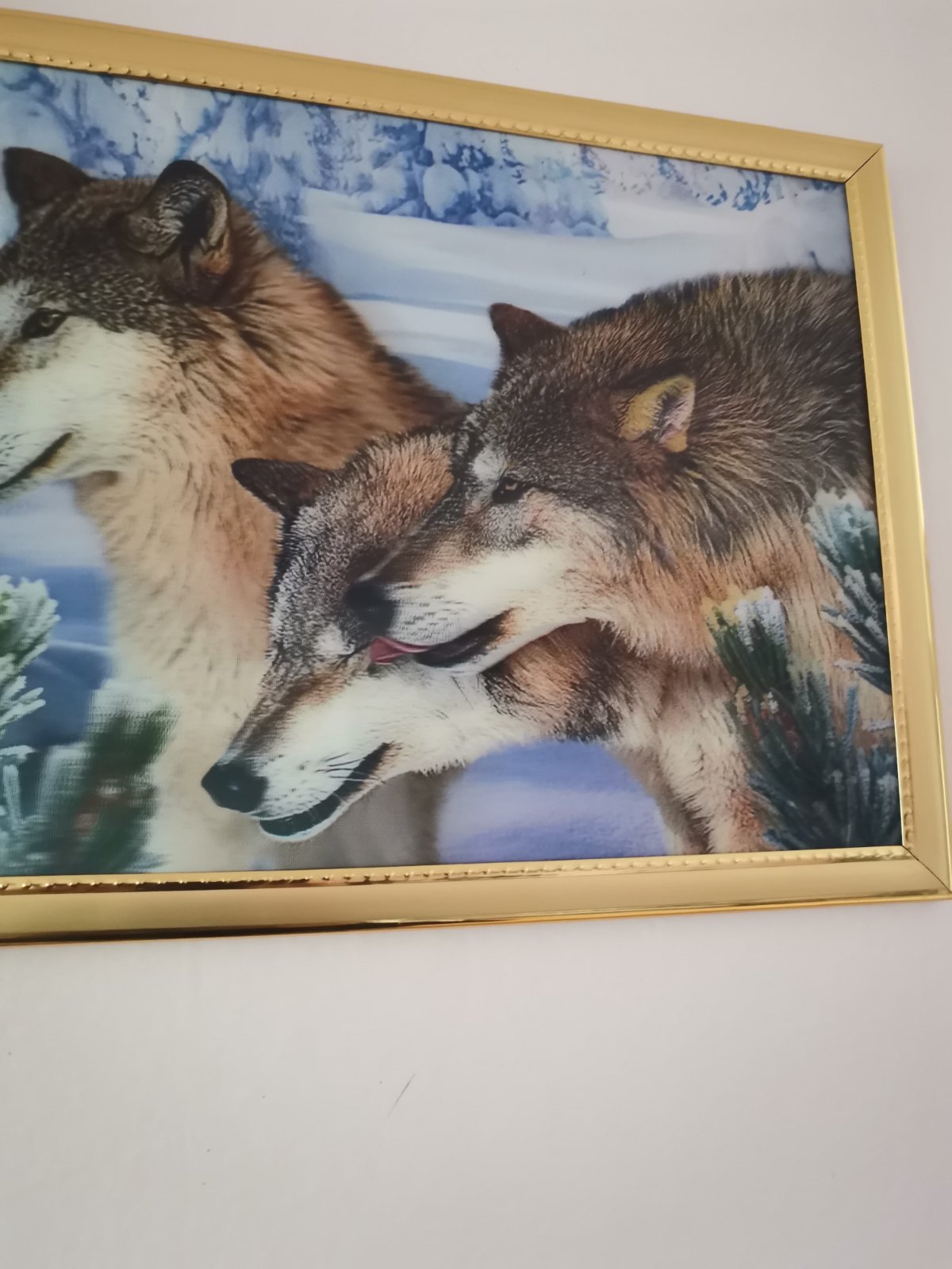3D obrázok s motívom vlkov v ramiku zlatej farby.