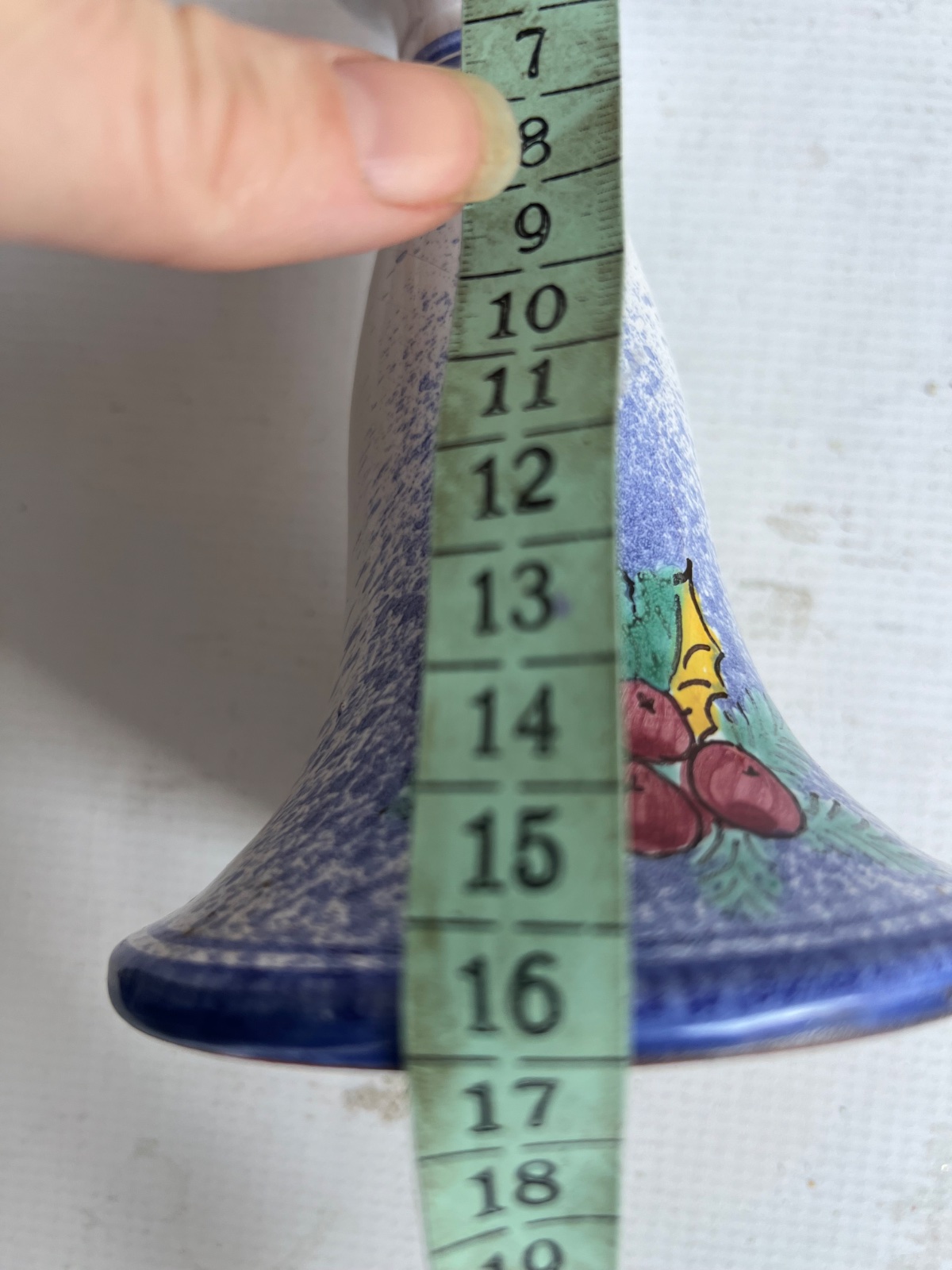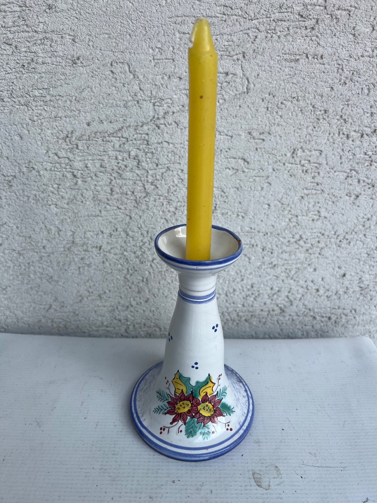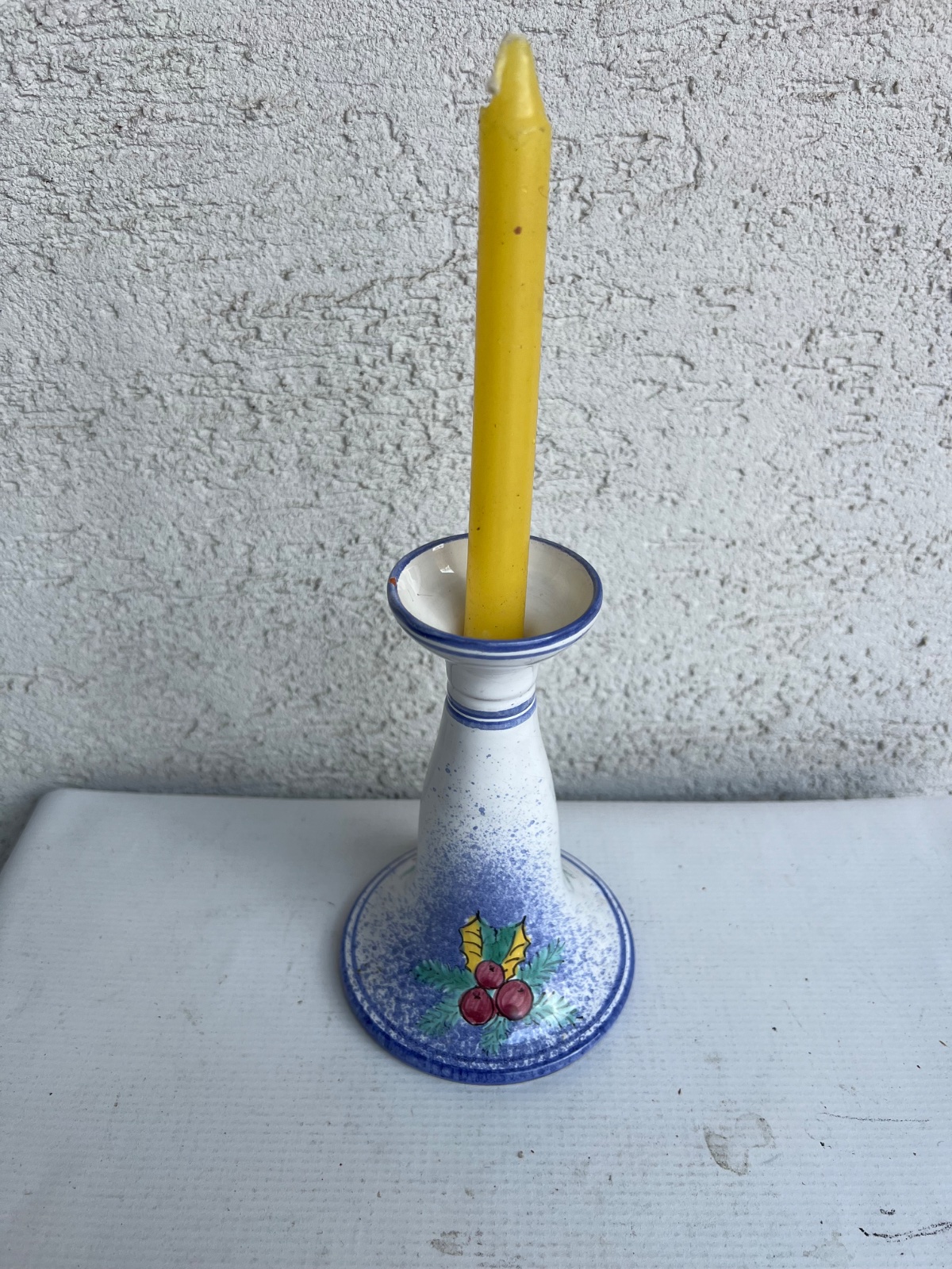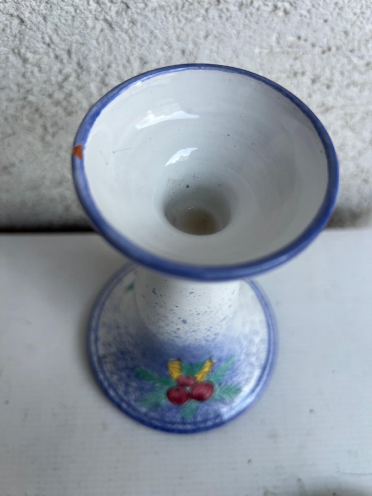 Vianocny zimny keramicky rucne malovany svietnik cca 16cm 2 dekory kazda strana iny stav foto , biela modra