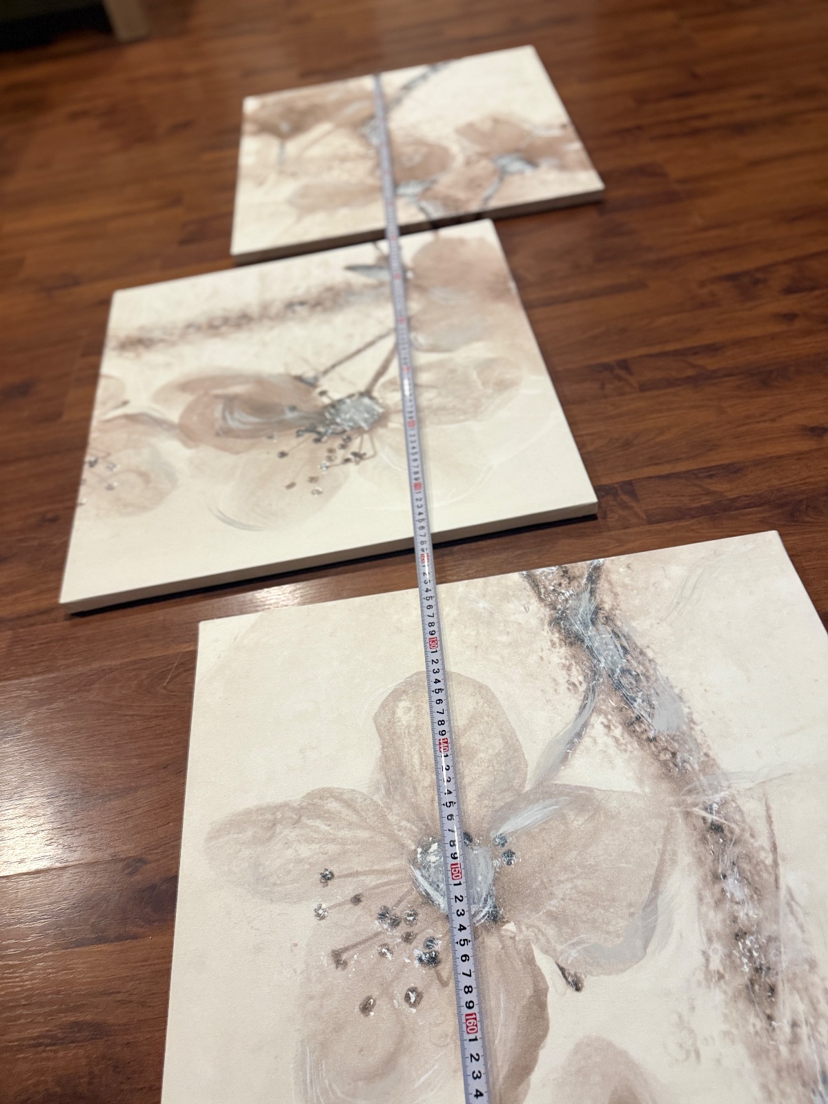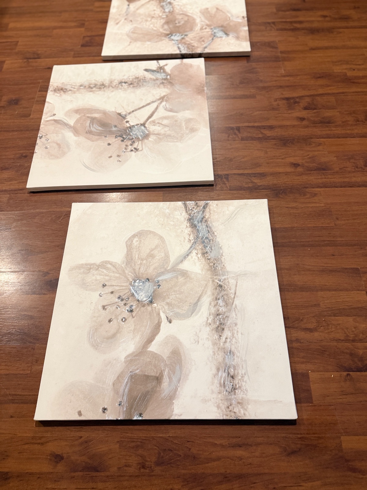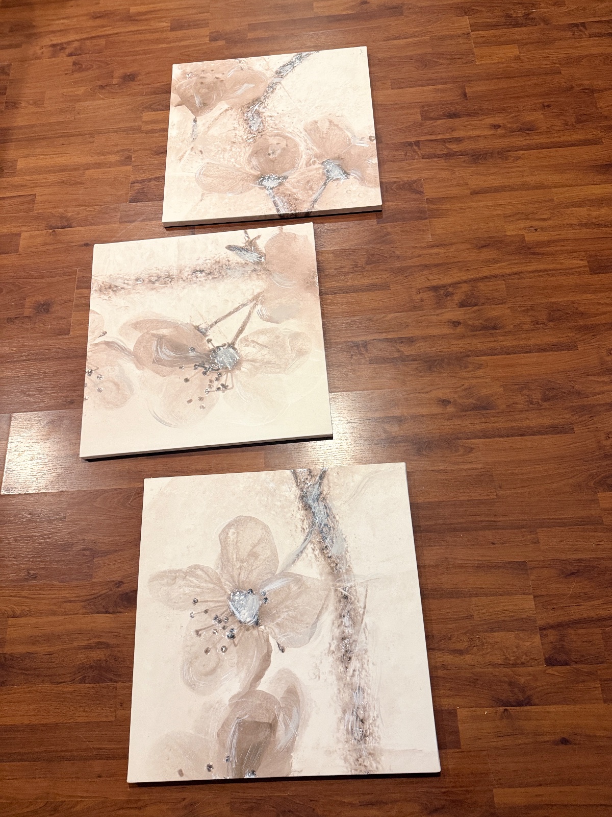 Predám 3 obrazy značky IKEA, ktoré tvoria spolu jeden harmonický celok (triptych). Jemný kvetinový motív v neutrálnych béžovo–krémových tónoch s plastickými detailmi (reliéf, kamienky), vhodné do obývačky, spálne alebo chodby.